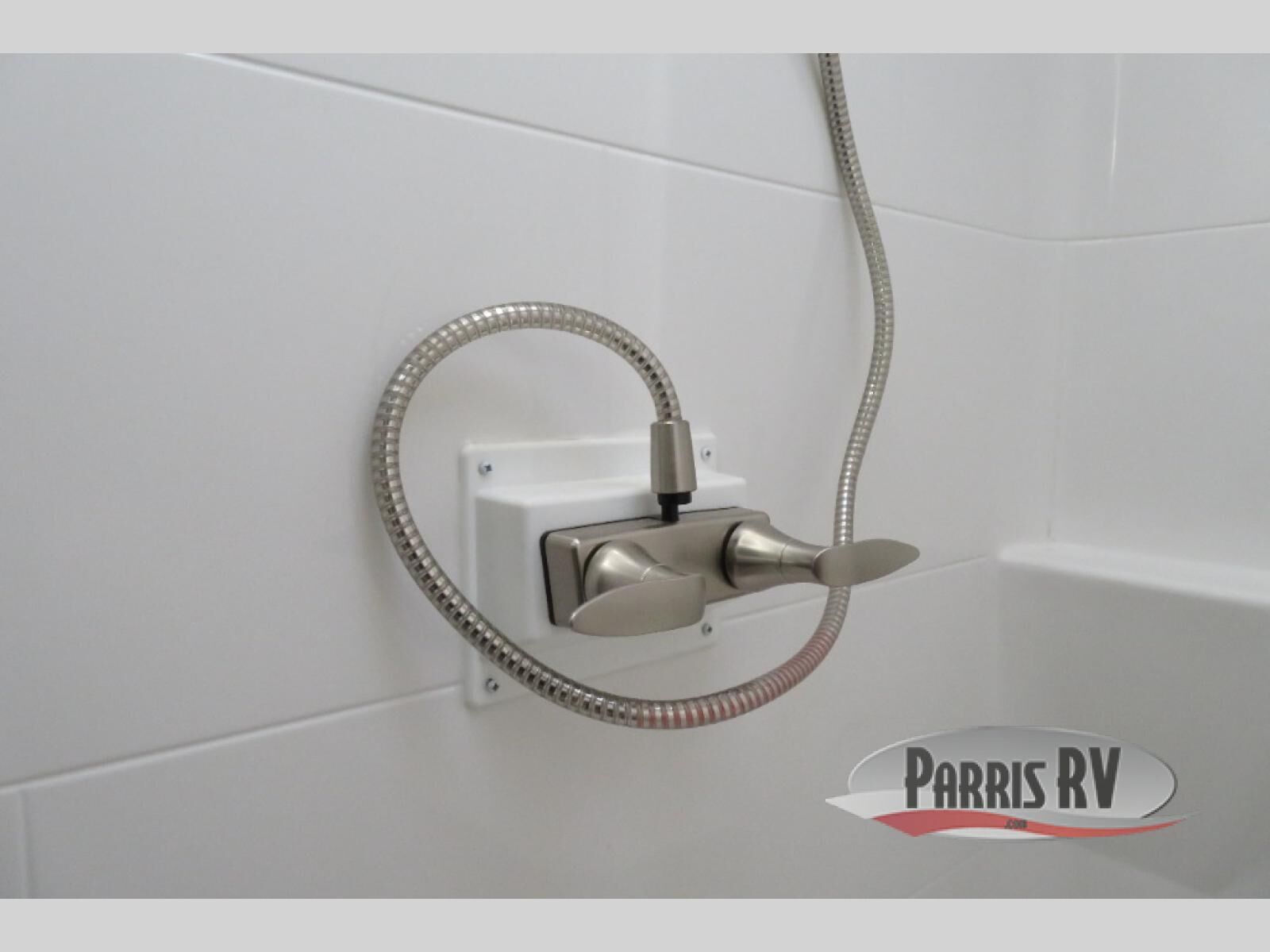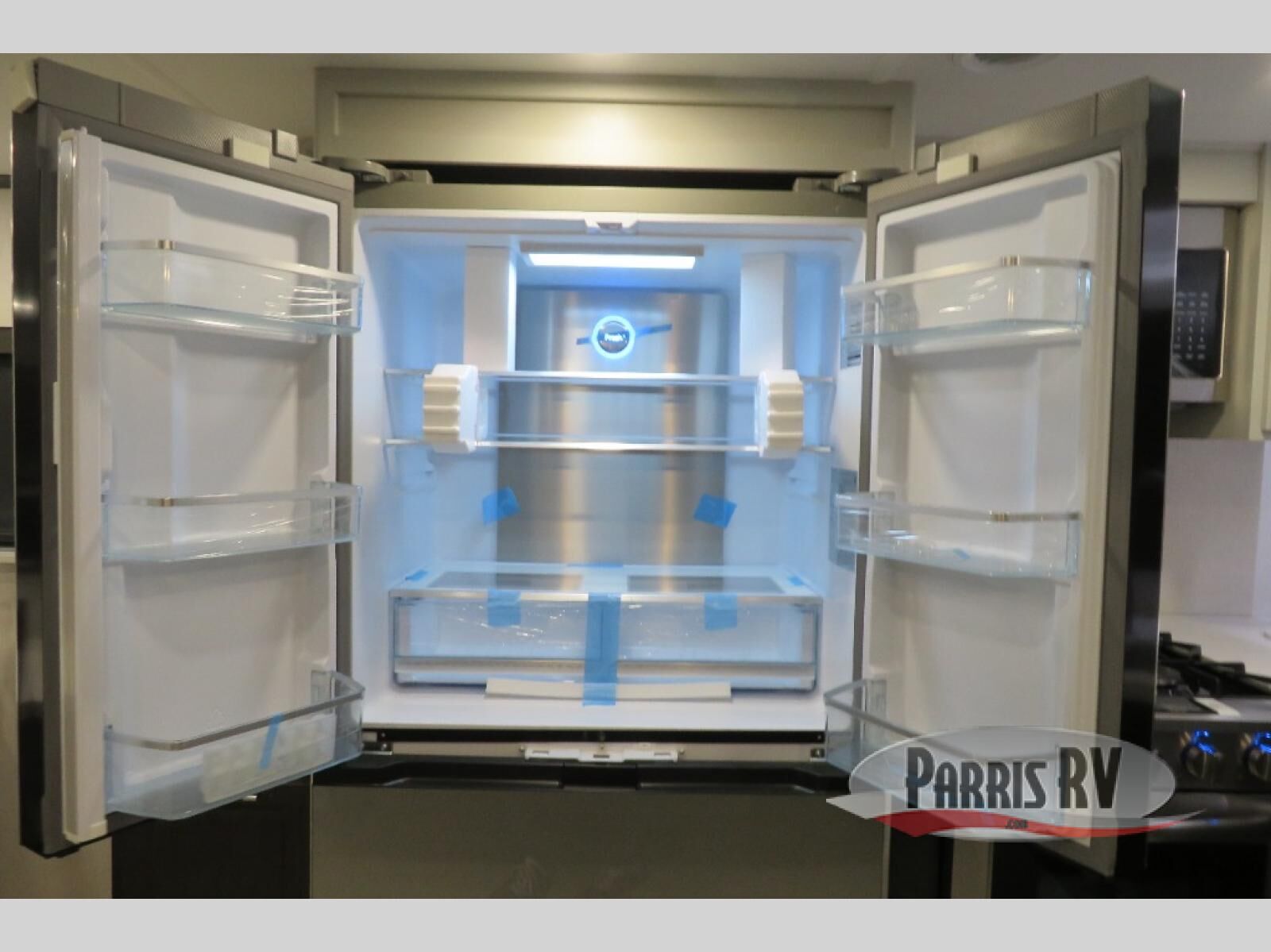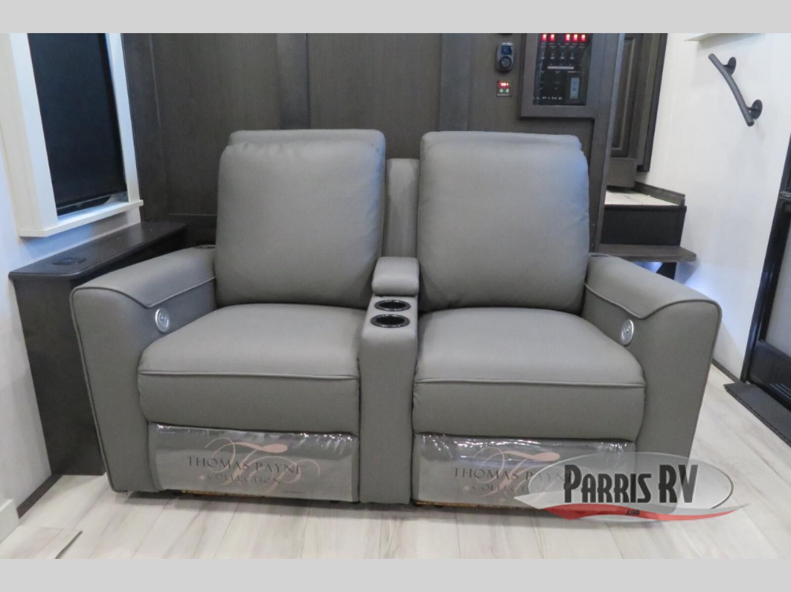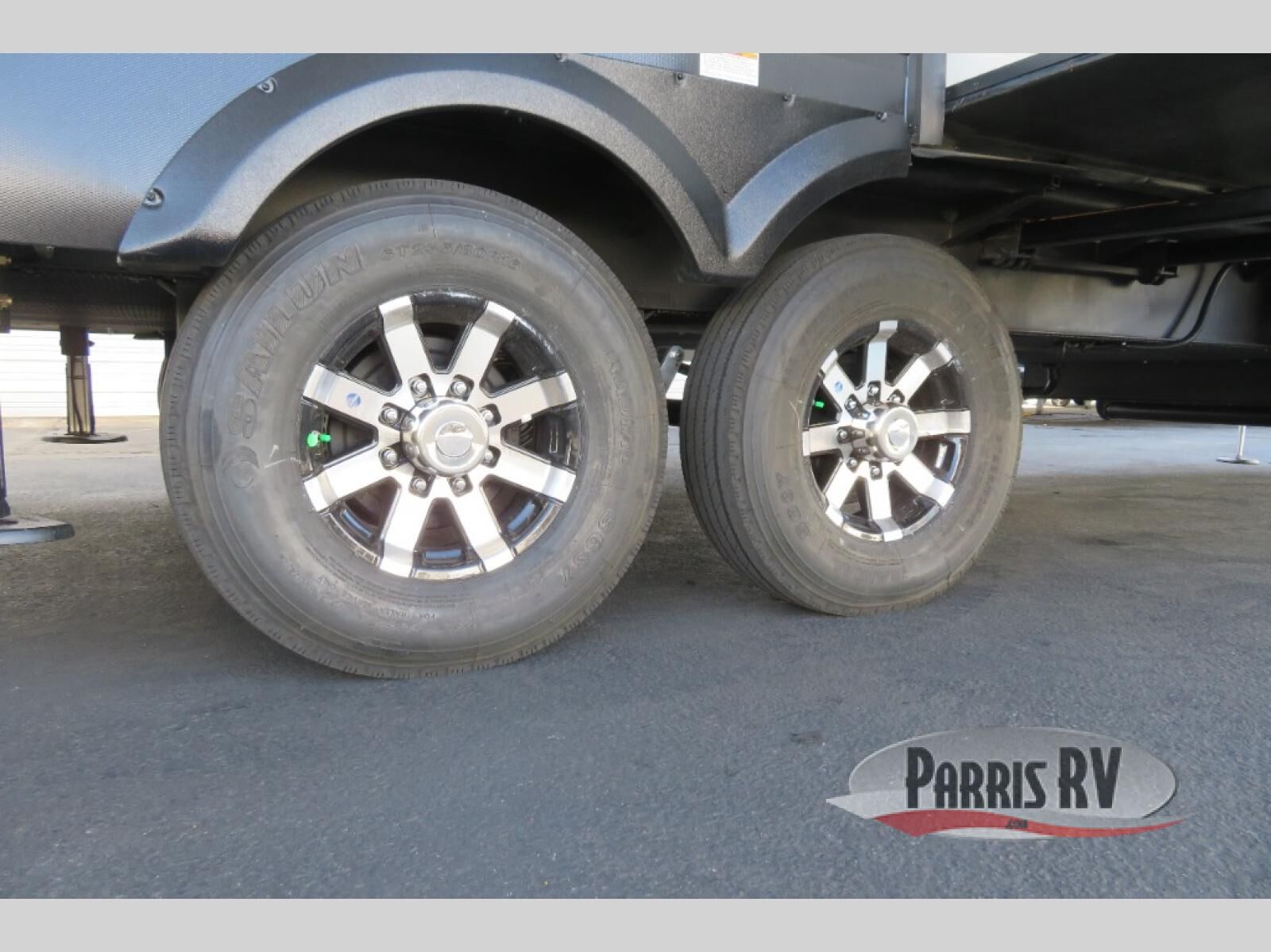 This fifth wheel is decked out in luxuries! The full rear bathroom has a walk-in shower to freshen up in each morning, a dual sink vanity for two to get ready at once, plus washer and dryer prep. You will enjoy a good night's rest on the king bed slide inside the private bedroom and others can sleep on the opposing tri-fold sofa sleeper slides in the living room. There is also a theater seating here, along with a fireplace and 50" LED TV for movie nights. The front kitchen is where it's really at in this fifth wheel; ample counter space, a bar top with stools, pull-out drawers, plus a pantry and closet for even more storage!