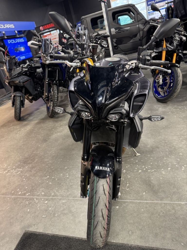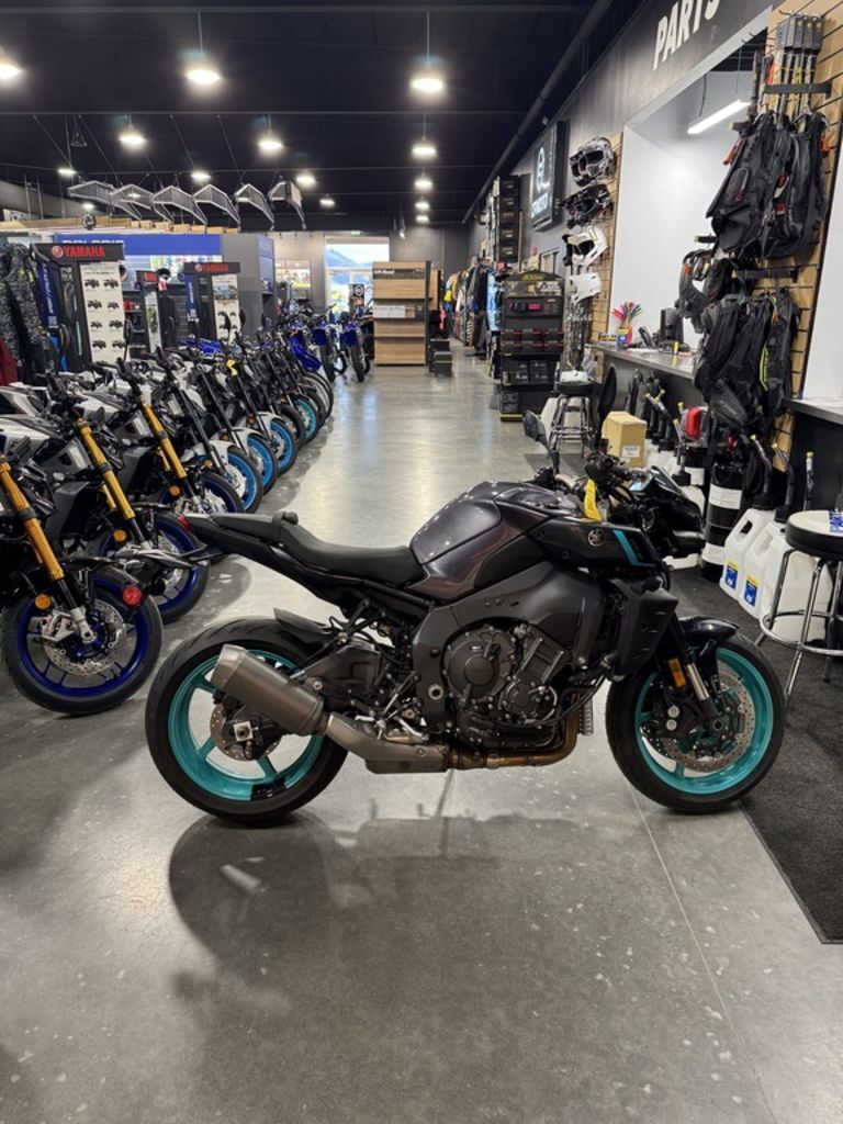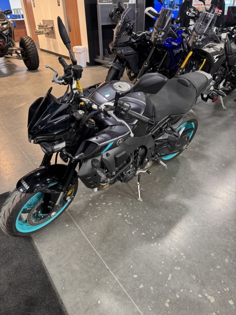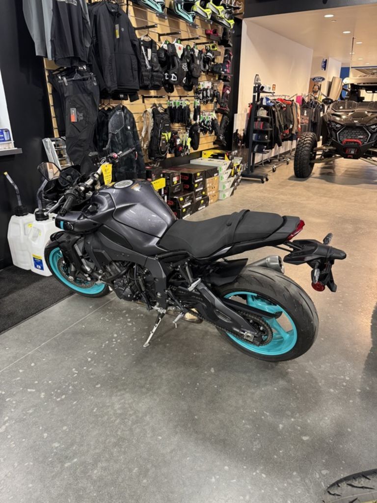 2024 Yamaha MT-10THE DARKEST ENERGYThe pinnacle of MT crossplane torque, distinct styling and agile handling lets you dominate the Darkness.Features may include:TOP FEATURESCompact, Aggressive MT StylingA stripped-down look is achieved by removing unnecessary bodywork elements and refocusing attention on the pure mechanical beauty of the muscular engine and compact frame. Twin-eye mono-focus LED headlights and LED position lights situated above the headlights combine with a compact nose assembly to minimize overhang and lend a refined, dominant style. Enlarged, functional intake ducts mounted on either side of the fuel tank cover increase efficiency while further enhancing the bike’s aggressiveness.Six-Axis IMU with Rider AidsThe MT-10 takes a significant step forward in technological advancement with the addition of Yamaha’s state-of-the-art six-axis Inertial Measurement Unit. Originally developed for the YZF-R1, the IMU on the MT-10 has now evolved into a smaller and lighter unit, featuring two sensors that measure three-axis angular velocity and three-axis acceleration, enabling a suite of rider aids including lean sensitive traction control, a Slide Control System (SCS), a front wheel Lift Control System (LIF), Engine Brake Management (EBM) and a Brake Control (BC) System with lean-sensitive ABS.ENGINER1-Derived Crossplane Crankshaft EngineThe potent 998cc inline four-cylinder engine features the same Crossplane Crankshaft technology developed in Yamaha’s renowned YZF-R1 superbike. The crossplane design nearly eliminates inertial engine torque to provide a direct connection between the throttle and rear wheel for maximum traction and linear torque feeling. Tuned specifically for the needs of the high-performance street rider, the MT- 10 engine develops awesome low- and mid-rpm torque with arm-stretching top-end power.ELECTRONICSSix-Axis IMU with Rider AidsThe MT-10 takes a significant step forward in technological advancement with the addition of Yamaha’s state-of-the-art six-axis Inertial Measurement Unit. Originally developed for the YZF-R1, the IMU on the MT-10 has now evolved into a smaller and lighter unit, featuring two sensors that measure three-axis angular velocity and three-axis acceleration, enabling a suite of rider aids including lean sensitive traction control, a Slide Control System (SCS), a front wheel Lift Control System (LIF), Engine Brake Management (EBM) and a Brake Control (BC) System with lean sensitive ABS.CHASSIS/SUSPENSIONDeltabox Aluminum FrameThe MT-10 uses an aluminum Deltabox frame derived from the YZF-R1 superbike to create a lightweight and responsive chassis that is built for agility with its ultra-compact 55.3-inch wheelbase. The frame uses a strength-rigidity balance that was developed specifically for the MT-10 and uses the engine as a stressed member of the frame for optimal cornering performance.Fully Adjustable KYB® ForkThe MT-10 features an inverted 43mm KYB® front fork which offers full adjustability and 4.7 inches of travel, for excellent front-end feel and road holding along with an adjustment range ready for a variety of street or track conditions.ADDITIONAL FEATURESRider-focused ErgonomicsErgonomics on the MT-10 focus on greater comfort and control. Protruding areas around the fuel tank are reduced offering more freedom of movement and better feel when the rider grips the tank with their knees under hard braking or cornering. The ‘rider triangle’—the bar/footrest/seat relationship—is optimized for a feeling of sitting more within the bike. Additionally, seat firmness is enhance comfort.