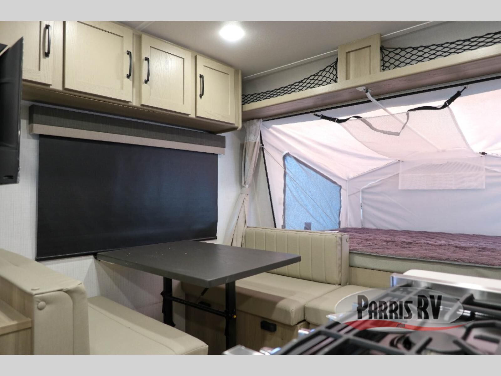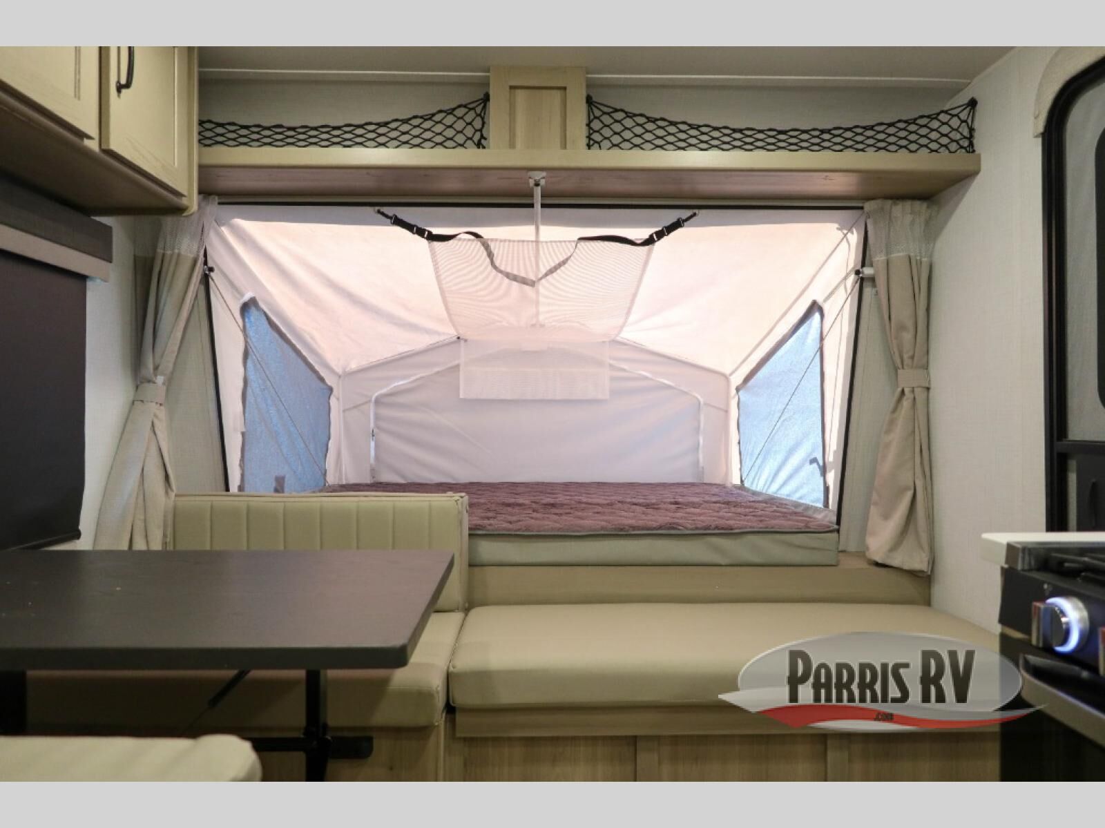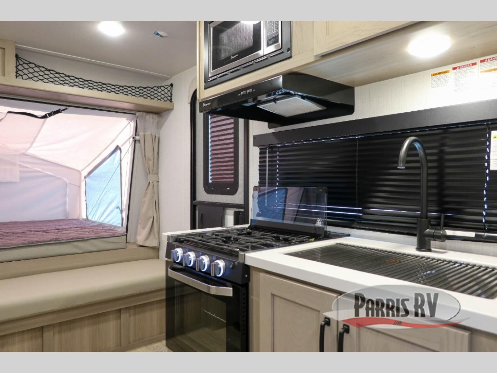 This expandable travel trailer is perfect for camping trips to your favorite park. You will find two queen tent end beds for cozy sleeping space plus a 39" booth dinette that will double as dining and additional sleeping space. There is also an entryway bench so you can easily pull your boots on for hiking. The three burner gas cooktop and microwave oven will let you make meals each day, and the 12V refrigerator will keep your food fresh. There is even a pantry/wardrobe that can store dry goods and clothes. Head outside to find Solid Step entry steps, an exterior griddle, a 12' power awning with LED lights and exterior storage!