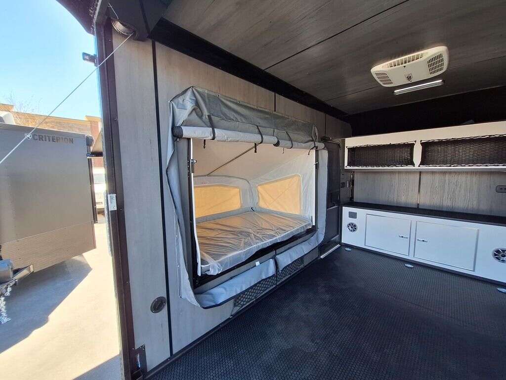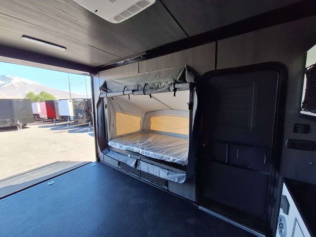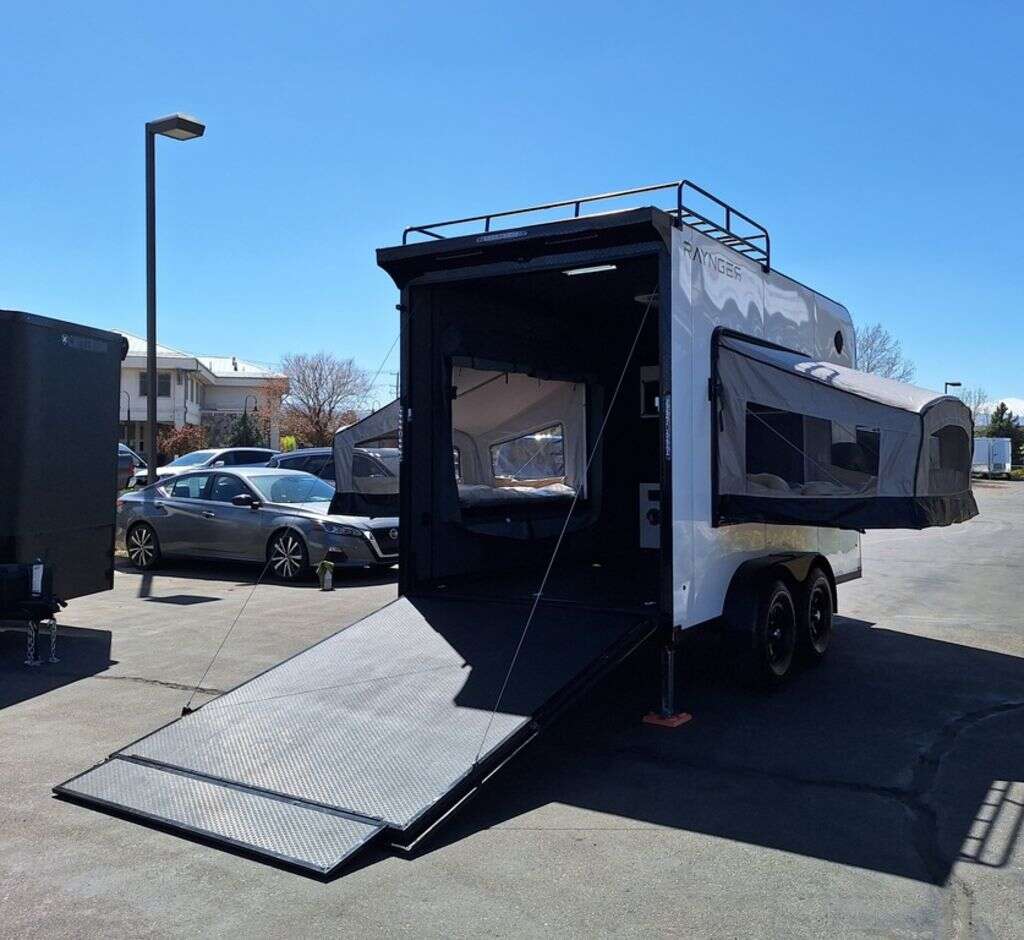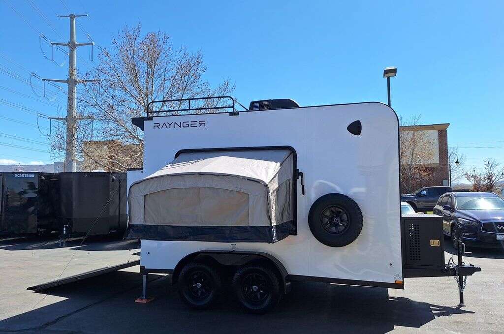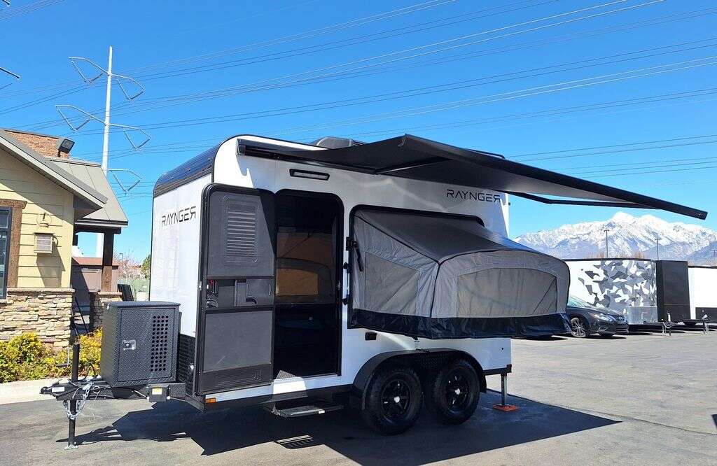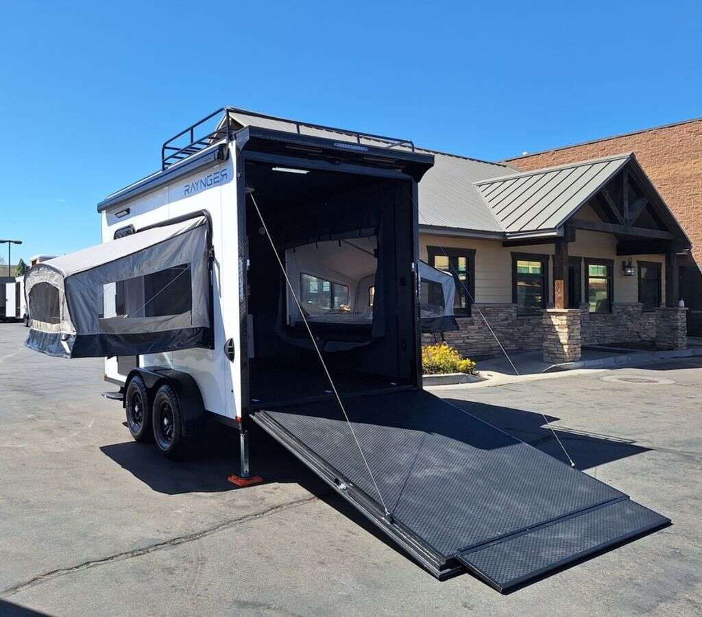 LIMITED TIME $216 A MONTH WITH ZERO DOWN WITH OUR SPECIAL LOCAL CREDIT UNION PARTNER!!! NO PRE-PAYMENT PENALTIES!!! NEW MODEL!!! RAYNGER PREMIUM OFF ROAD TOY HAULER CAMPER!!! 18 INCH GROUND CLEARANCE!!! OFF ROAD TIRES!!! FULLY INSULATED!!! HEATING AND A/C!!! WET SOUND STEREO!!! TWO FOLD OUT/POP OUT TENTS WITH MATTRESS!!! CARGO BASKET!!! LED LIT AWNING!!! 84 Inch Rear Entry Height/87 INCH INTERIOR HEIGHT!!! 77 Inch Rear Entry Width!!! Aluminum Ventilated Locking Generator Box!!! UPGRADED TORSION AXLES!!! 11.5 Foot Long Garage Space!!! And Much MUCH MORE!!! Check out our Specs!!! Available in 16 foot and 18 foot models. 18 Foot Models can have 3 Fold Out Beds/Pop Out Tents. 16 Foot and 18 Foot Models will fit ANY stock 4 Seater Side by Side • 6” I Beam Frame• Flat Top Design• Flat Front Design• Wall Posts 16” on Center• Cross Members 16” on Center• Roof Bows 16” on Center• Rust Inhibiting Z-Tech Protection on Chassis• Ameraguard on Tongue• Ameraguard on Rear Bumper• Ameraguard Around All Door Openings and Stepwell• Ameraguard Around Edges of Ramp Door• 3500 LB Spring Axles• 2-5/16” Coupler• One-Piece Aluminum Roof• ST235/75R15 Aluminum Wheels with Chrome Center Caps• 2000# Ramp Door with Eberhard Latch• 30” Tempered Glass RV Door with Screen Door• .030 Exterior Metal with Screwless Sides• 24” Black Stoneguard• 3” Black Bottom Trim• Sand Pad• Black Door Hold• 2.7mm Charcoal Textured Vinyl Ceiling • 9mm Charcoal Textured Vinyl Walls• 3/4” Engineered Wood Floor with Rubber Coin Overlay• (6) 1200 LB Floor D rings Installed with Backer Plates• LED Clearance Lights and Tail Lights• LED Back-up Lights• No Show Wheel Box• Spoiler with Toggle Switch• RV Step• 7’ Interior• (2) 17” Chrome Base Lights with Switch• (1) Black 17” Spot Light with Switch• (1) 30 Amp Panel with Marine Plug• A/C Unit with Heat Strip• (3) Interior Recepts• (1) Exterior Recept• 12V Battery and Charge Line• Prep for Backup Camera• Wet Sounds System• (3) Blue Interior Cabinet Lights• (1) 6’ Section of Flex Lights• Black ATP Rear Header and Hoop• Black ATP Fenders• Insulated Walls & Ceiling• Base Cabinets• Overhead Cabinets with Netting Over Compartments• Pop Out Tent• Black ATP Storage/Generator Box Mounted On Tongue 2SW091694