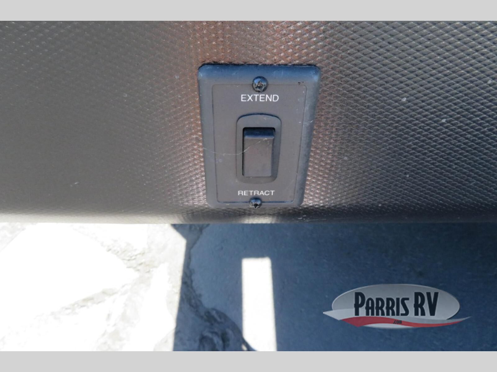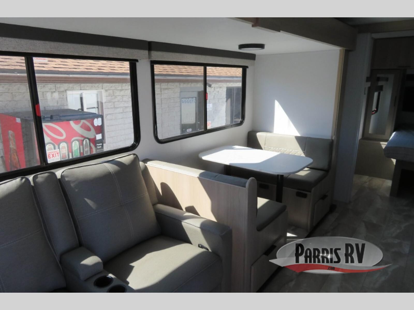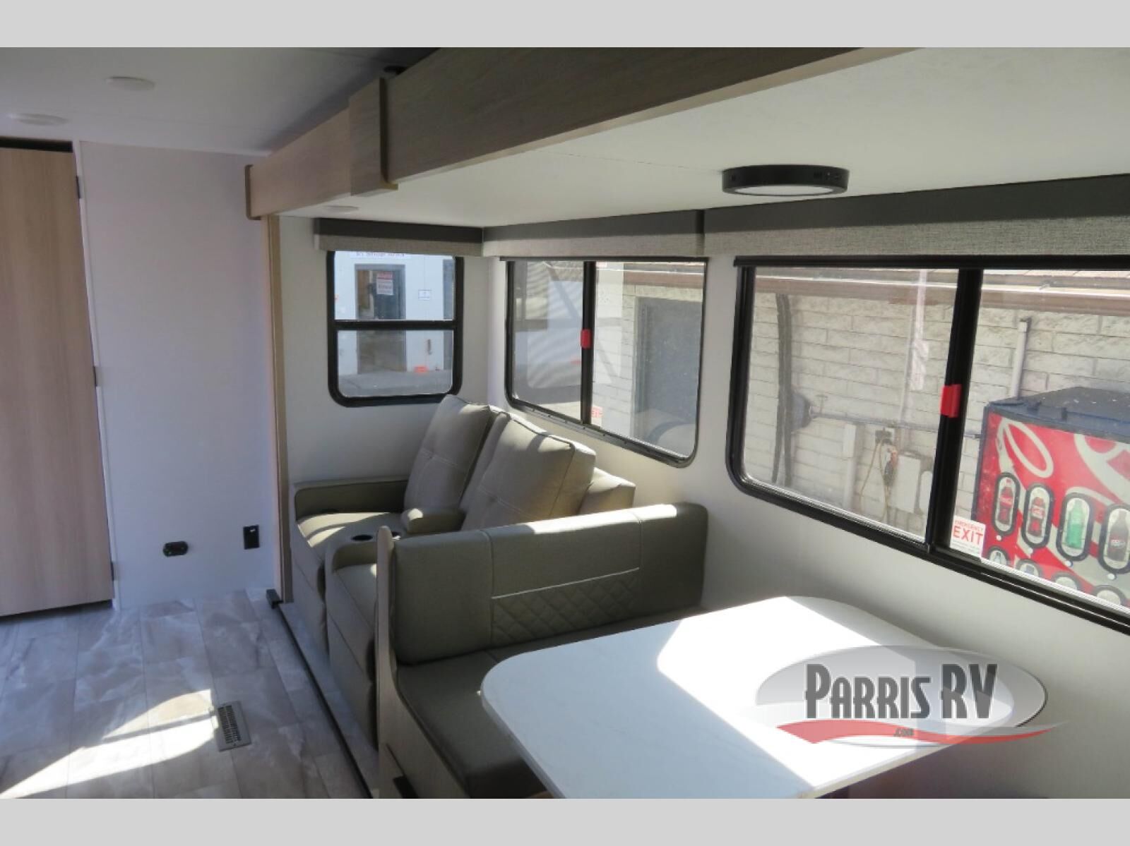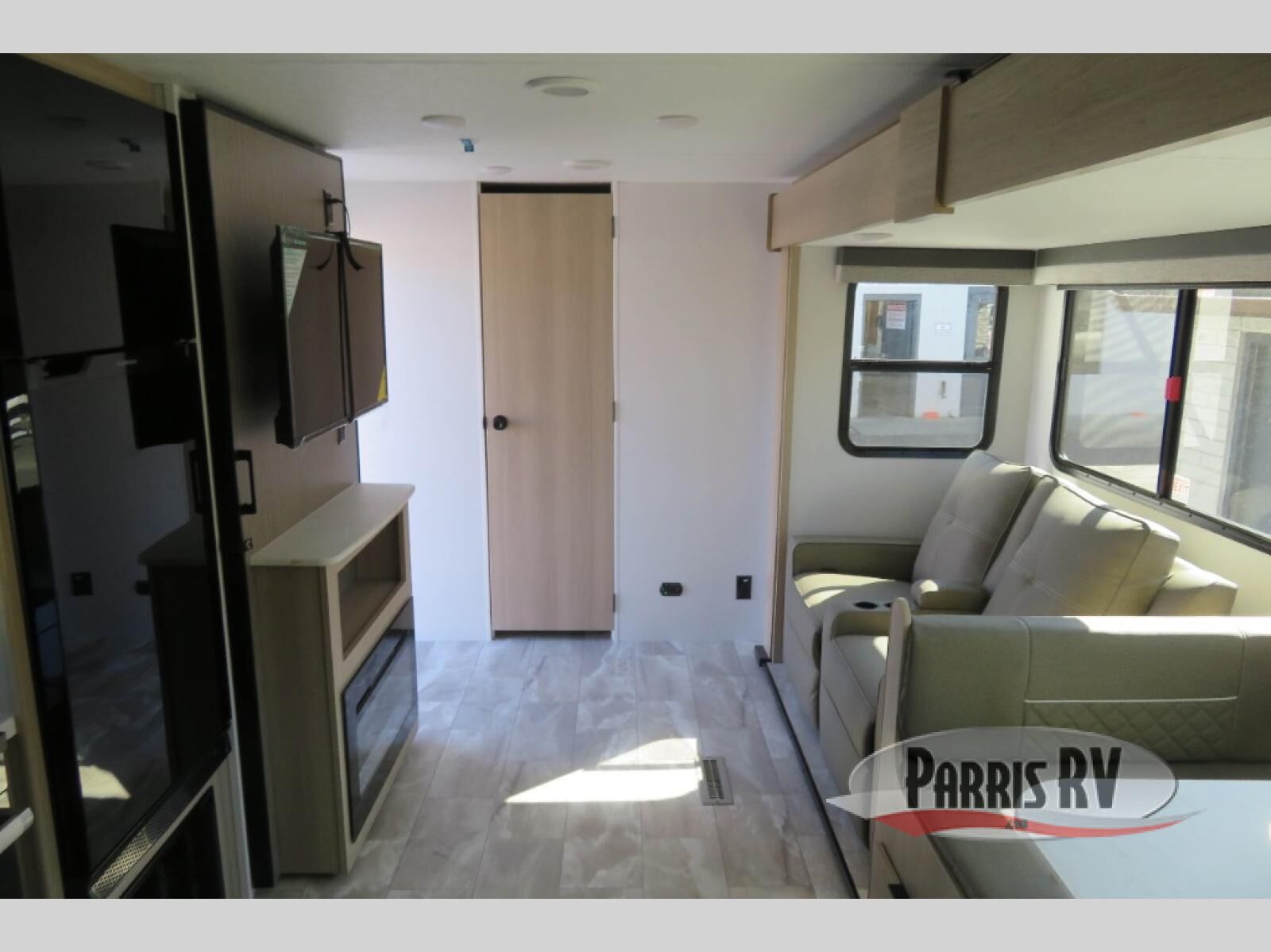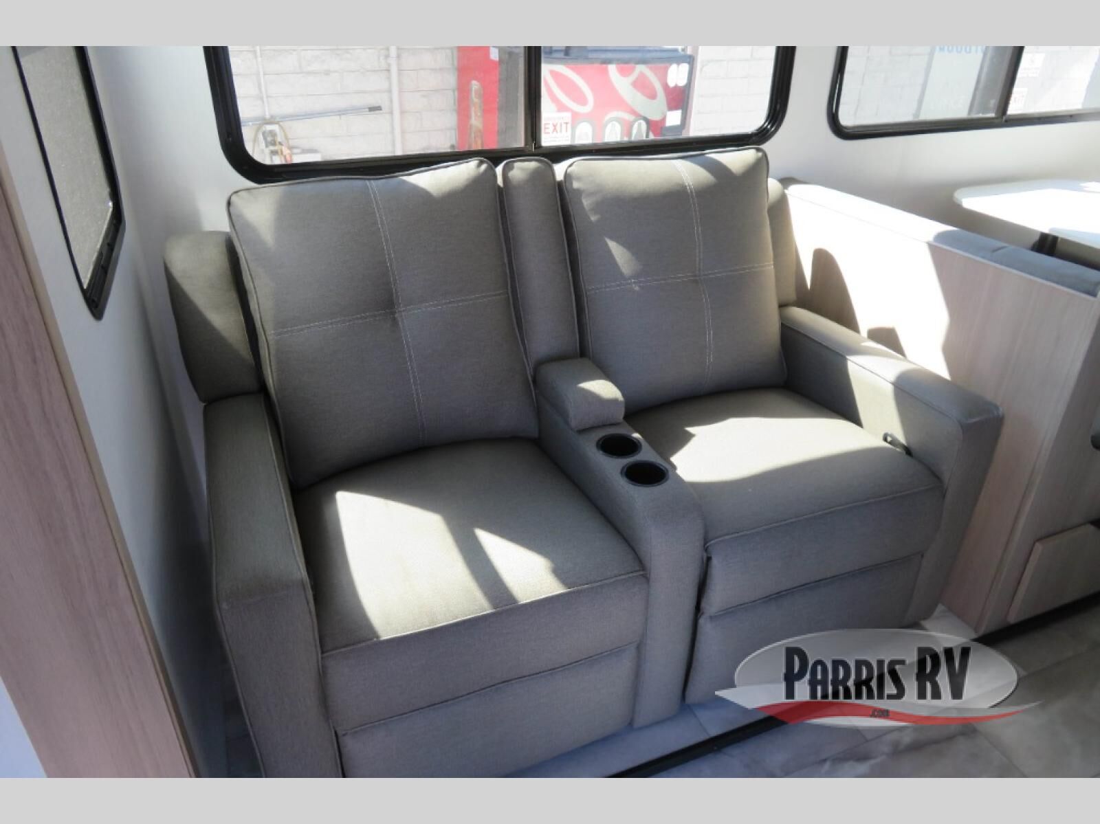 This travel trailer is ready to provide you with a home-like environment while you're at the campground. You can prepare meals each day on the two burner cooktop or in the microwave oven, and there is a 10 cu. ft. 12V refrigerator for perishables. Dine at the booth dinette or take your plate outdoors to sit under the 14' power awning with LED lights. There are also theater seats inside if you want to stay close to the fireplace with a good book instead. The full rear bath includes plenty of storage space, and the front private bedroom with a queen bed will feel just like home!