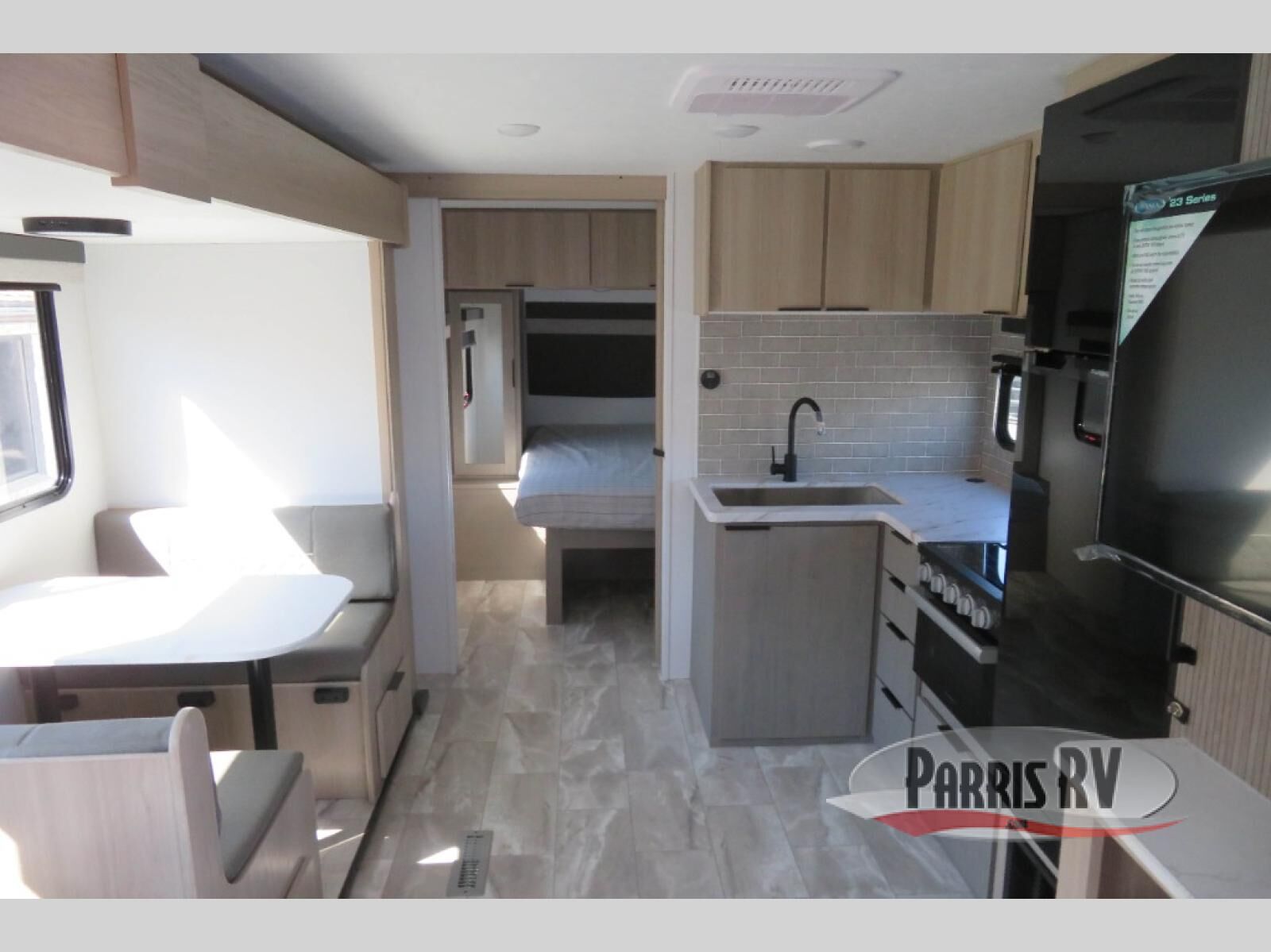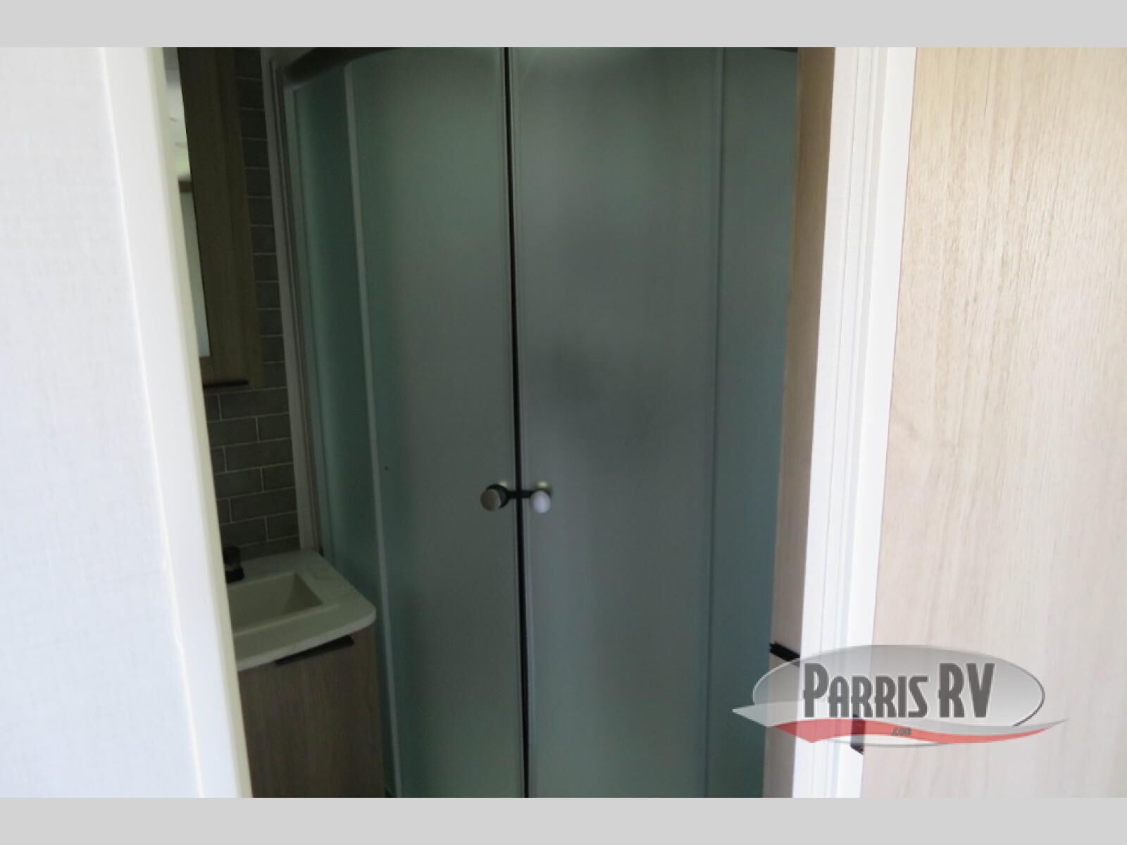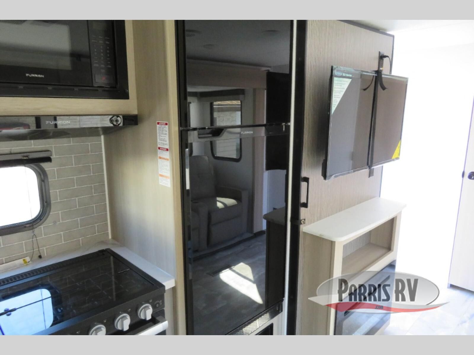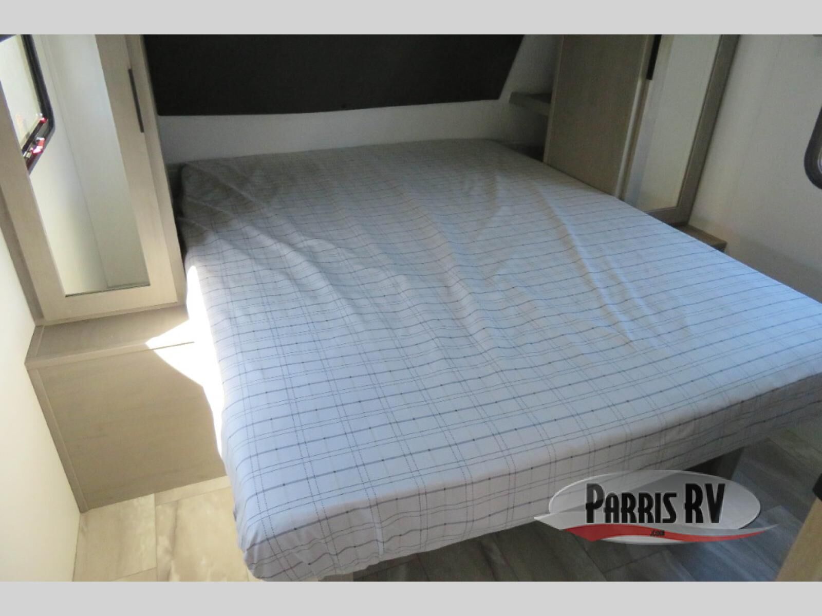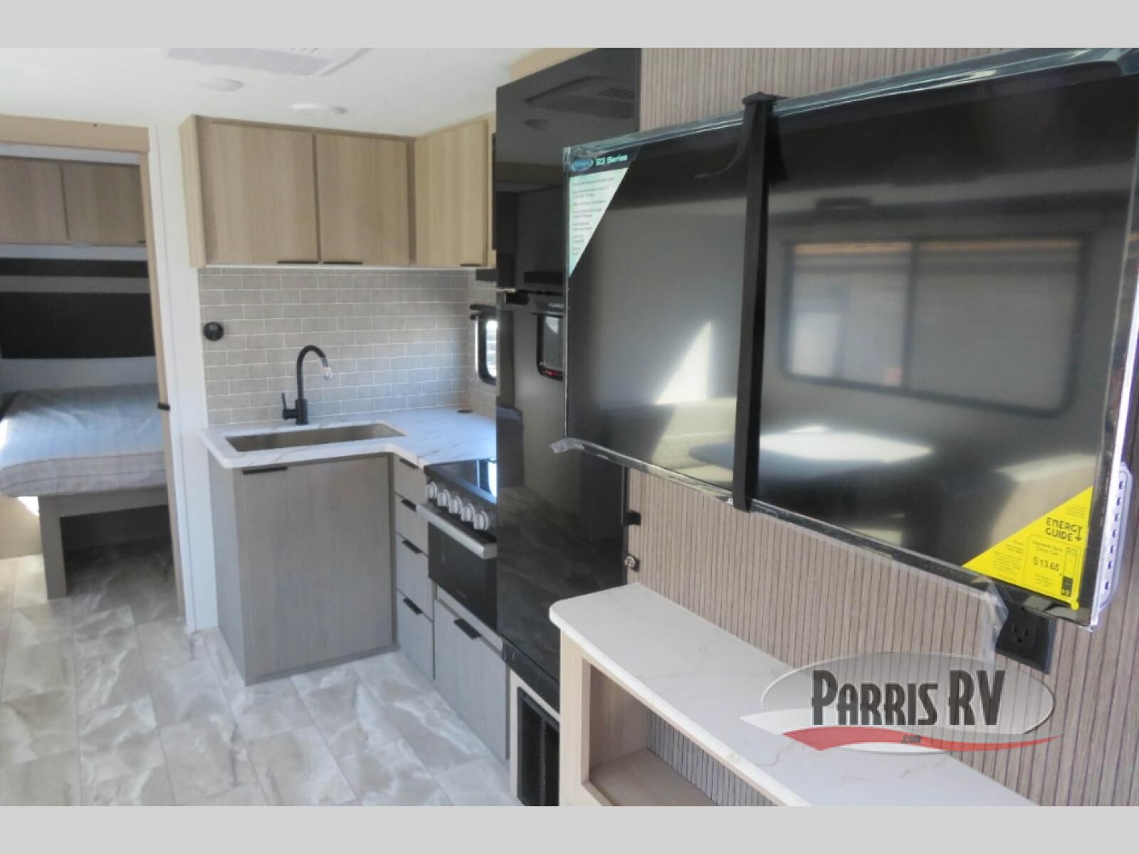 This travel trailer is ready to provide you with a home-like environment while you're at the campground. You can prepare meals each day on the two burner cooktop or in the microwave oven, and there is a 10 cu. ft. 12V refrigerator for perishables. Dine at the booth dinette or take your plate outdoors to sit under the 14' power awning with LED lights. There are also theater seats inside if you want to stay close to the fireplace with a good book instead. The full rear bath includes plenty of storage space, and the front private bedroom with a queen bed will feel just like home!
