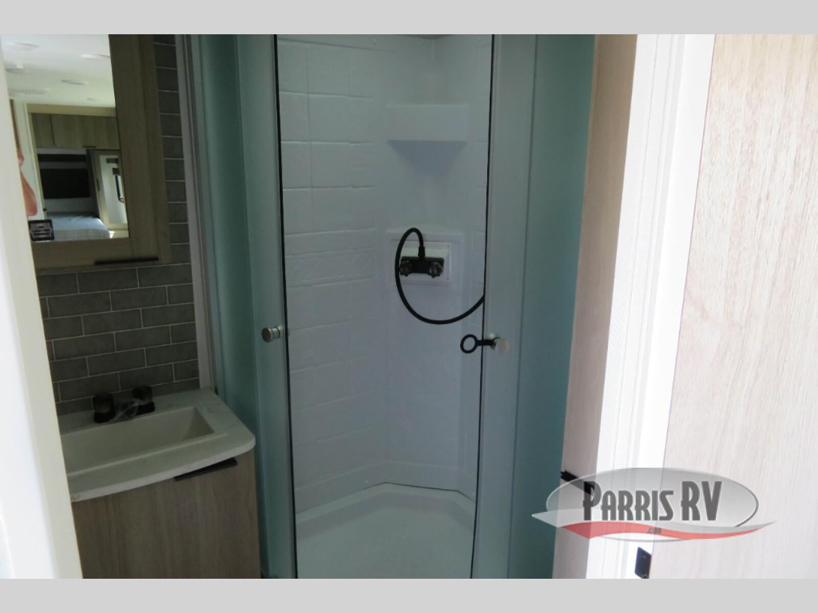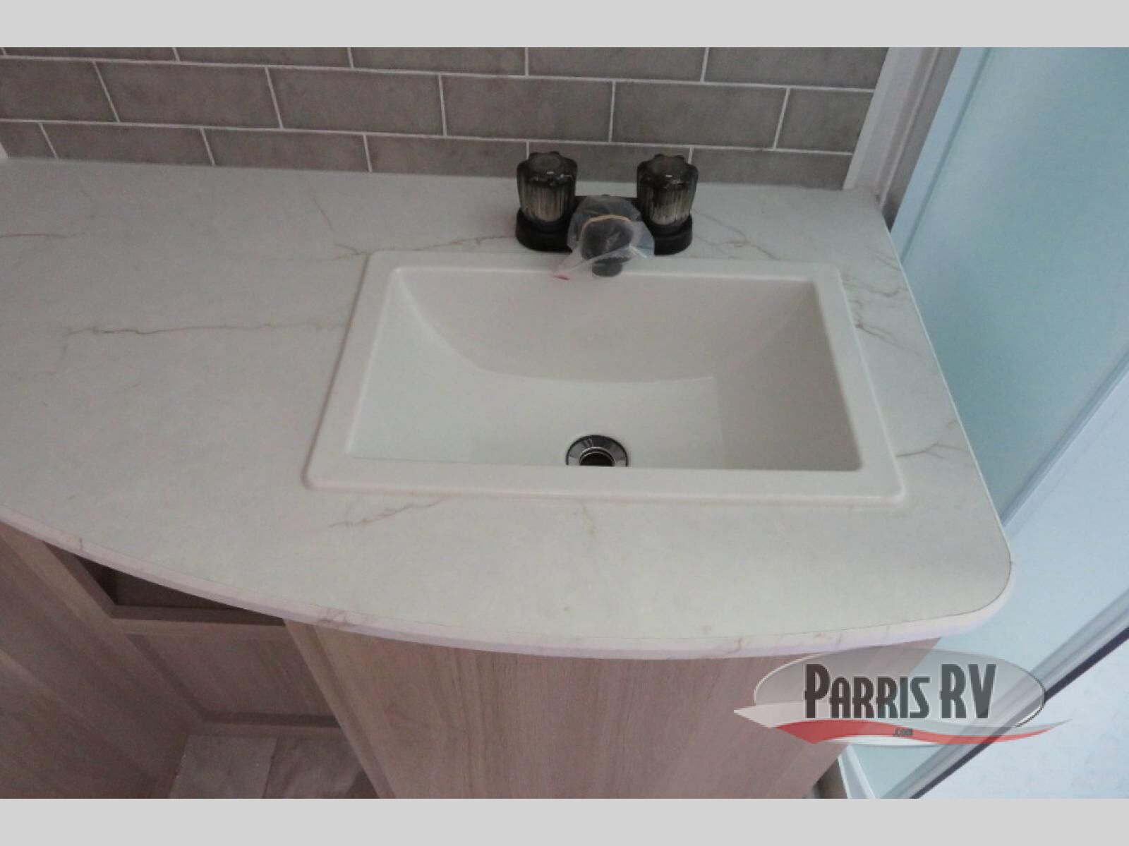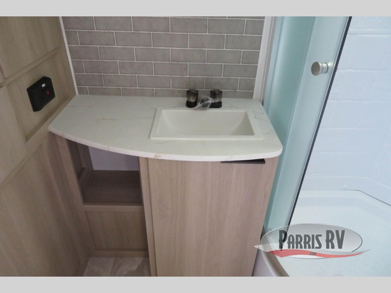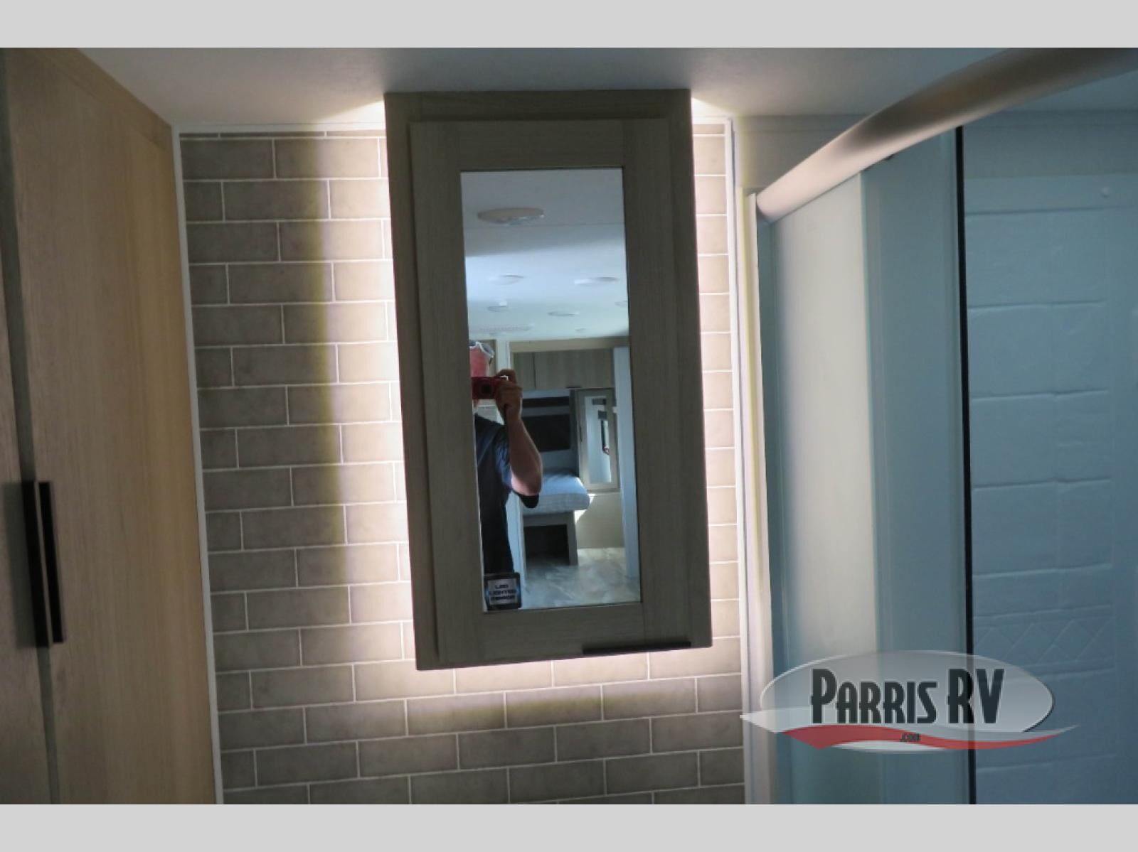 This travel trailer is ready to provide you with a home-like environment while you're at the campground. You can prepare meals each day on the two burner cooktop or in the microwave oven, and there is a 10 cu. ft. 12V refrigerator for perishables. Dine at the booth dinette or take your plate outdoors to sit under the 14' power awning with LED lights. There are also theater seats inside if you want to stay close to the fireplace with a good book instead. The full rear bath includes plenty of storage space, and the front private bedroom with a queen bed will feel just like home!