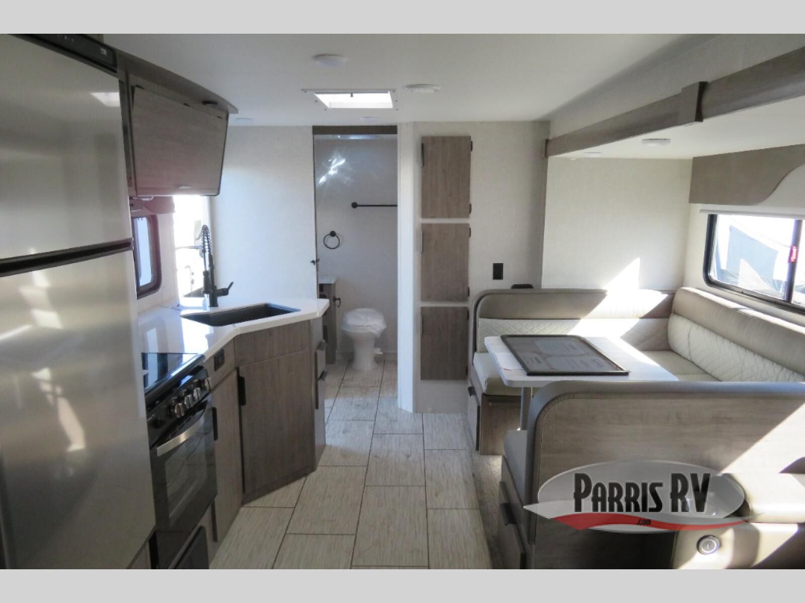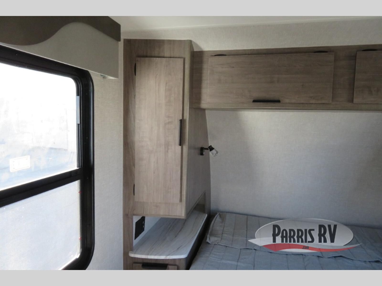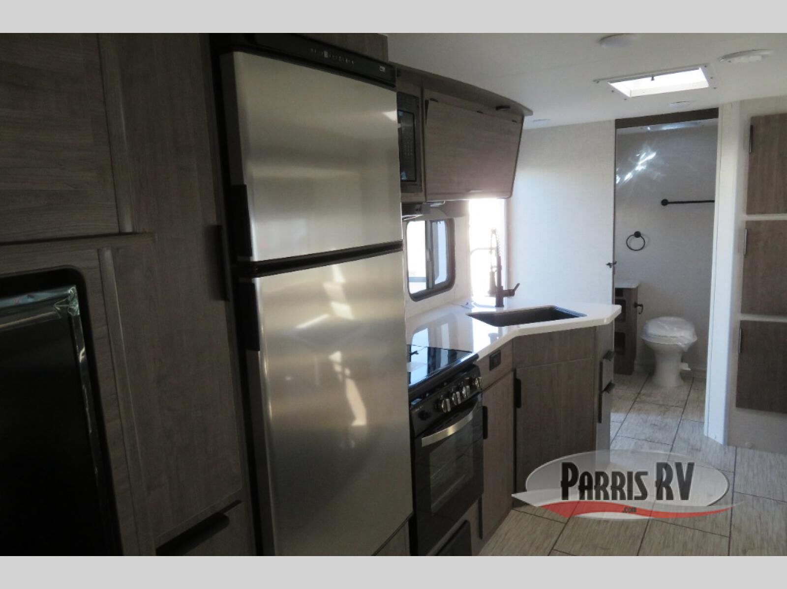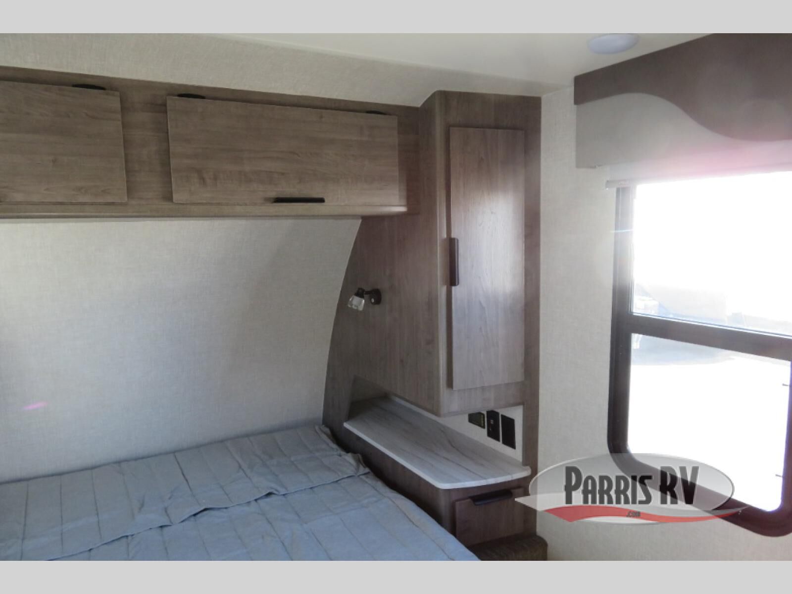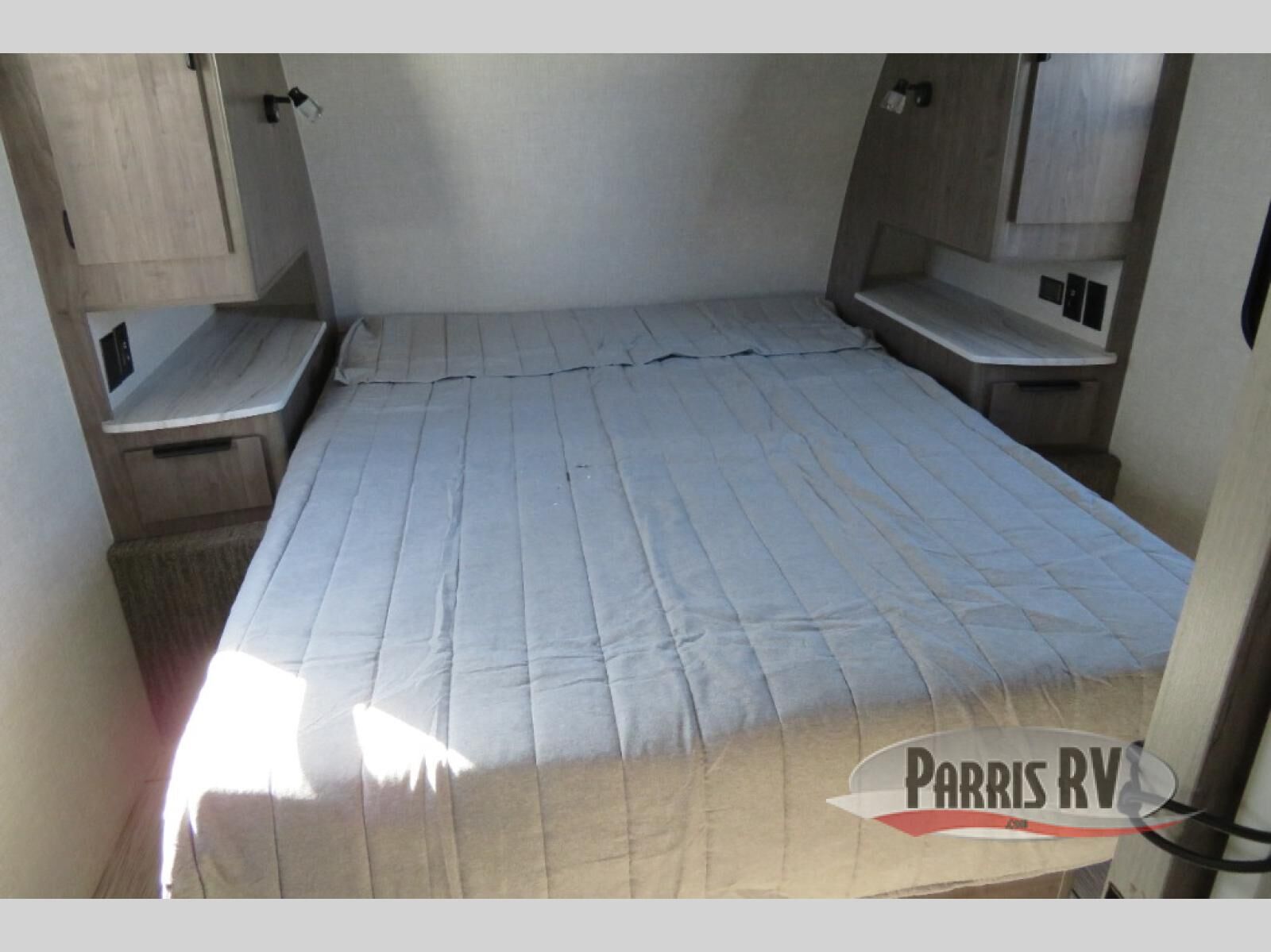 Escape to the campground in this travel trailer that can sleep four campers each night. You will love having your own space in the front private bedroom, and the dual wardrobes plus a closet will keep your belongings tidy. The combined kitchen and living area includes a large slide out for added space, and you'll enjoy a U-shaped dinette and theater seating here for relaxing, dining, and letting guests sleep over. A fully equipped kitchen lets you make meals each day, and the spacious full rear bath means you won't have to use the camp's facilities; how convenient!