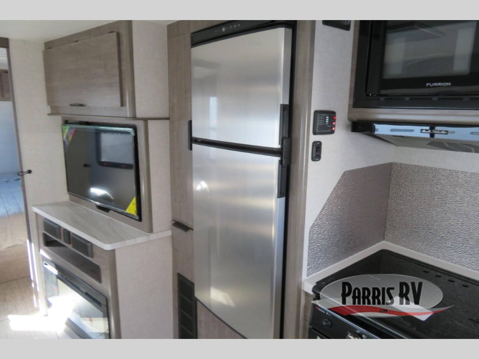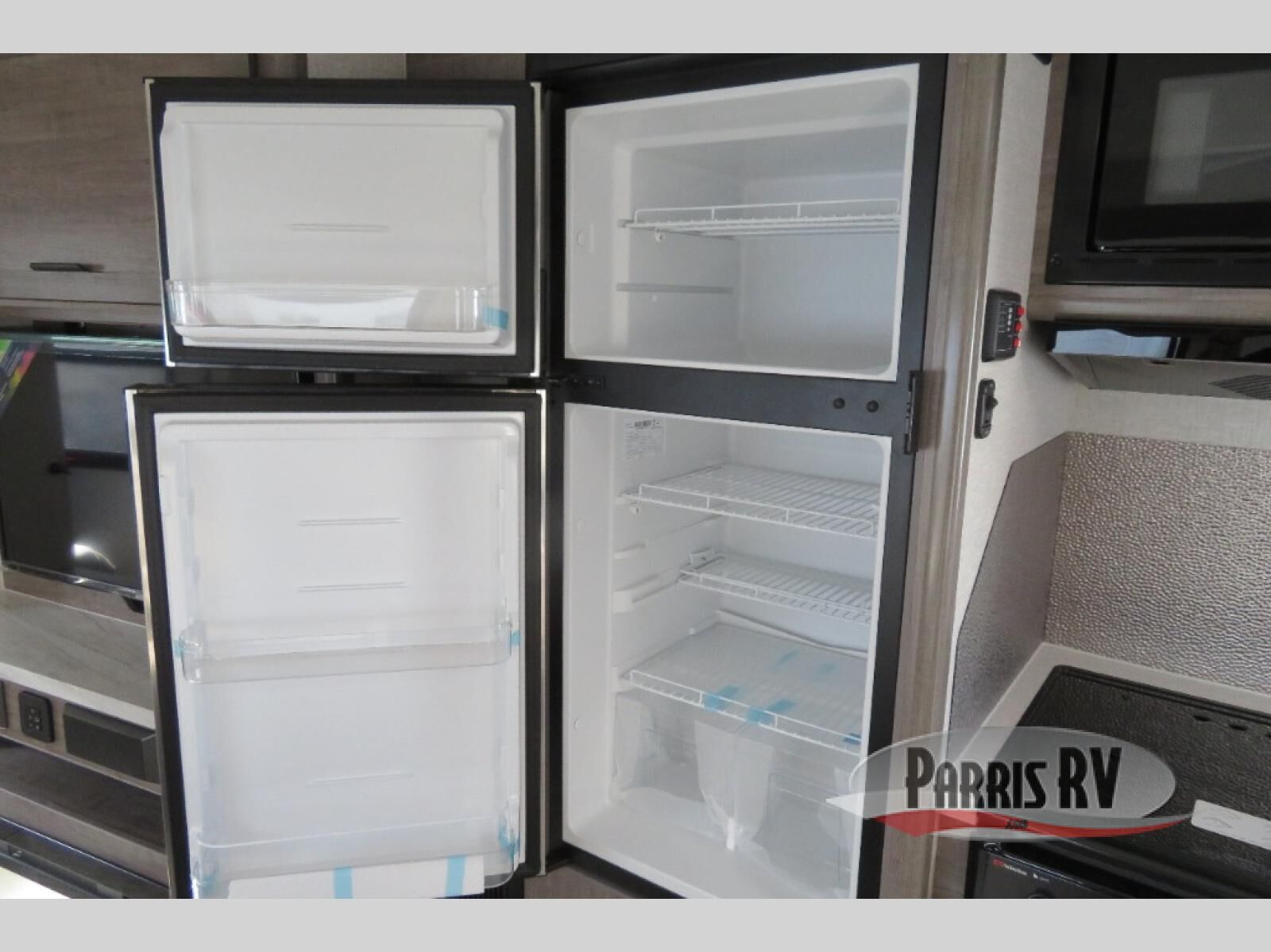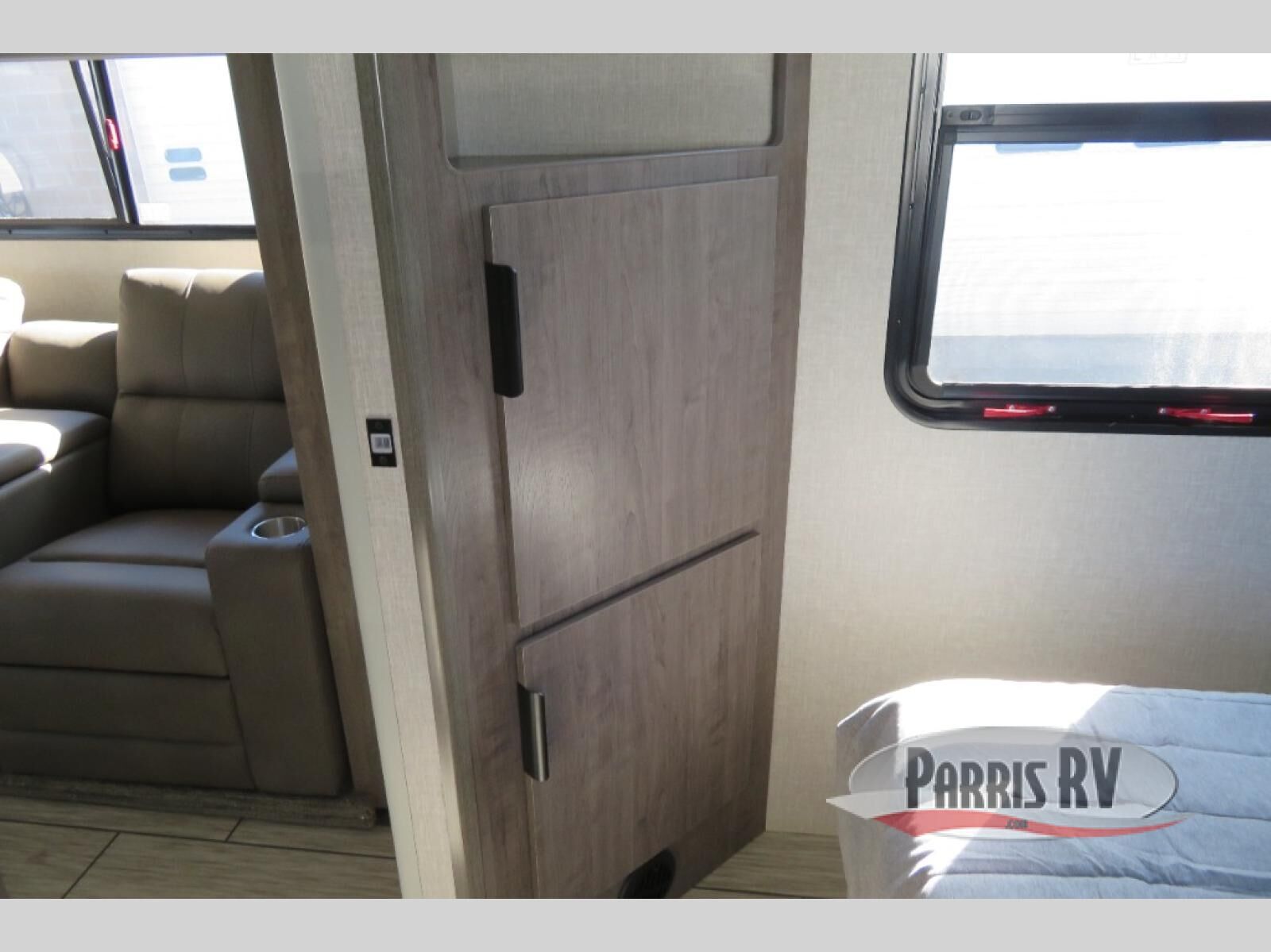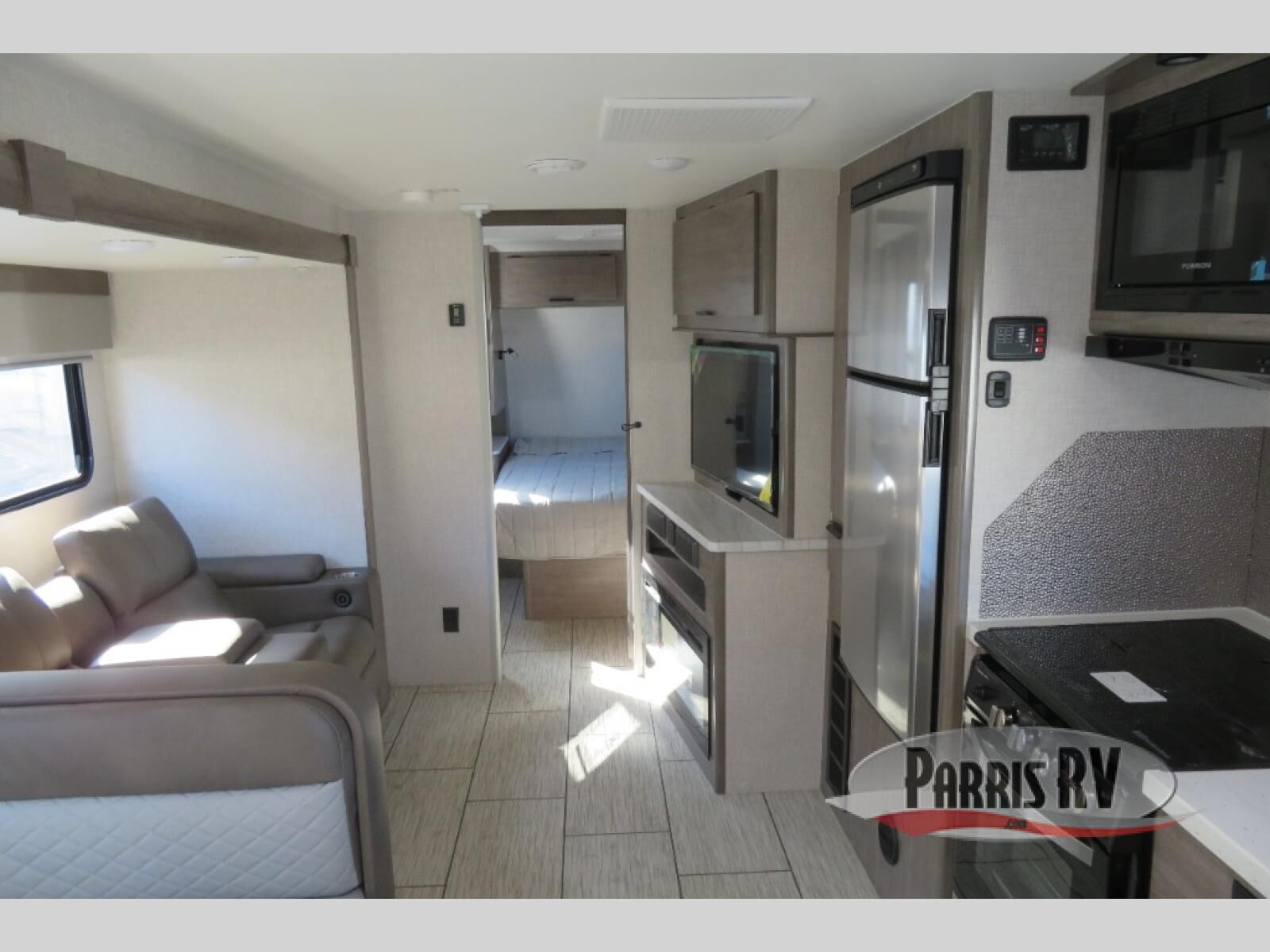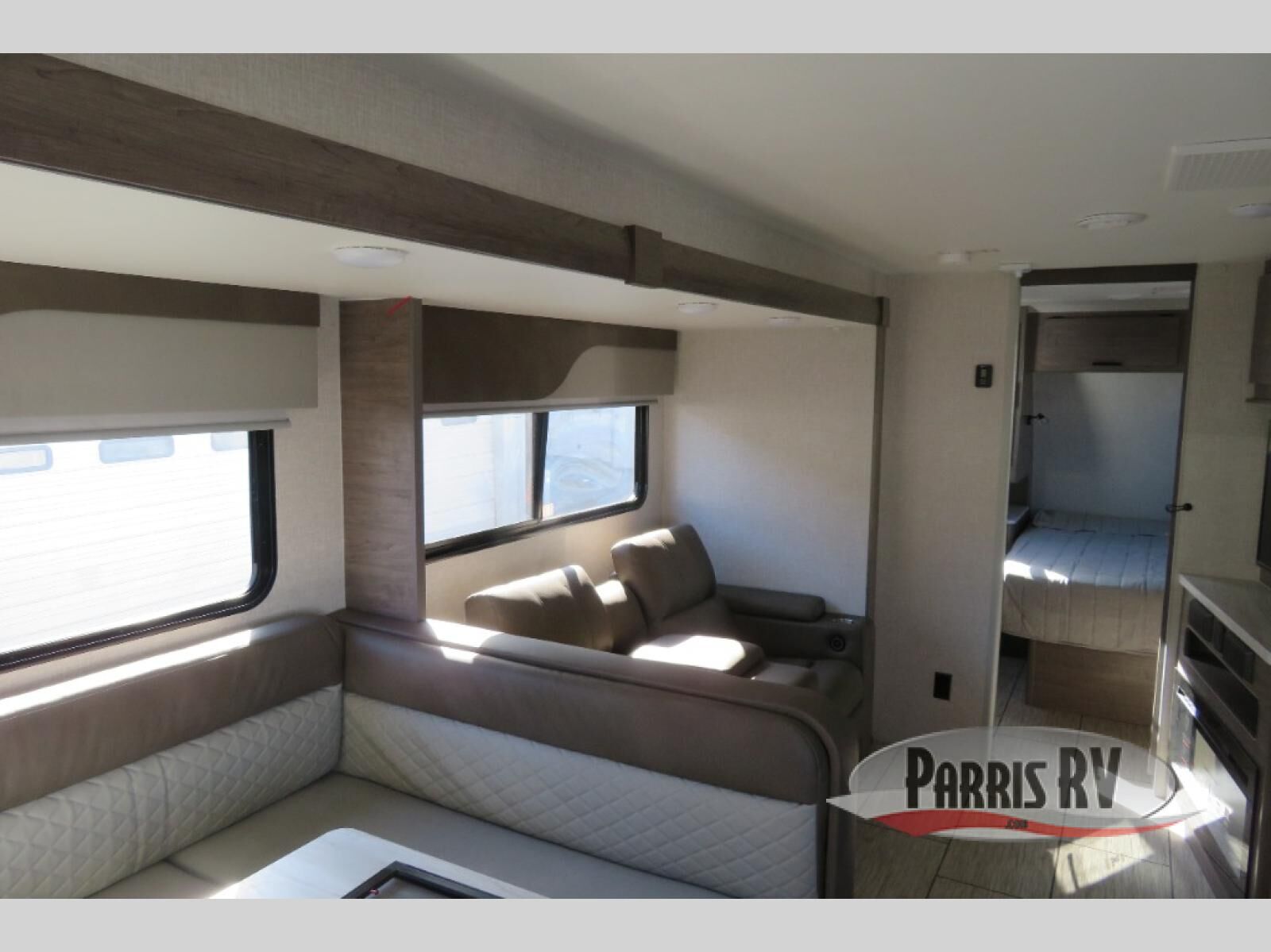 Escape to the campground in this travel trailer that can sleep four campers each night. You will love having your own space in the front private bedroom, and the dual wardrobes plus a closet will keep your belongings tidy. The combined kitchen and living area includes a large slide out for added space, and you'll enjoy a U-shaped dinette and theater seating here for relaxing, dining, and letting guests sleep over. A fully equipped kitchen lets you make meals each day, and the spacious full rear bath means you won't have to use the camp's facilities; how convenient!