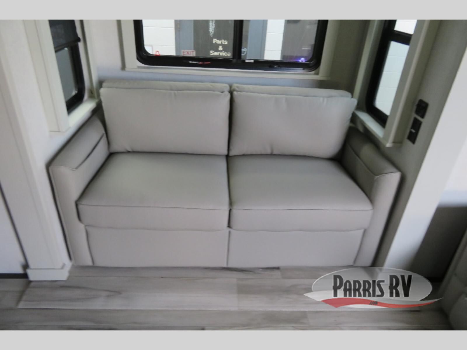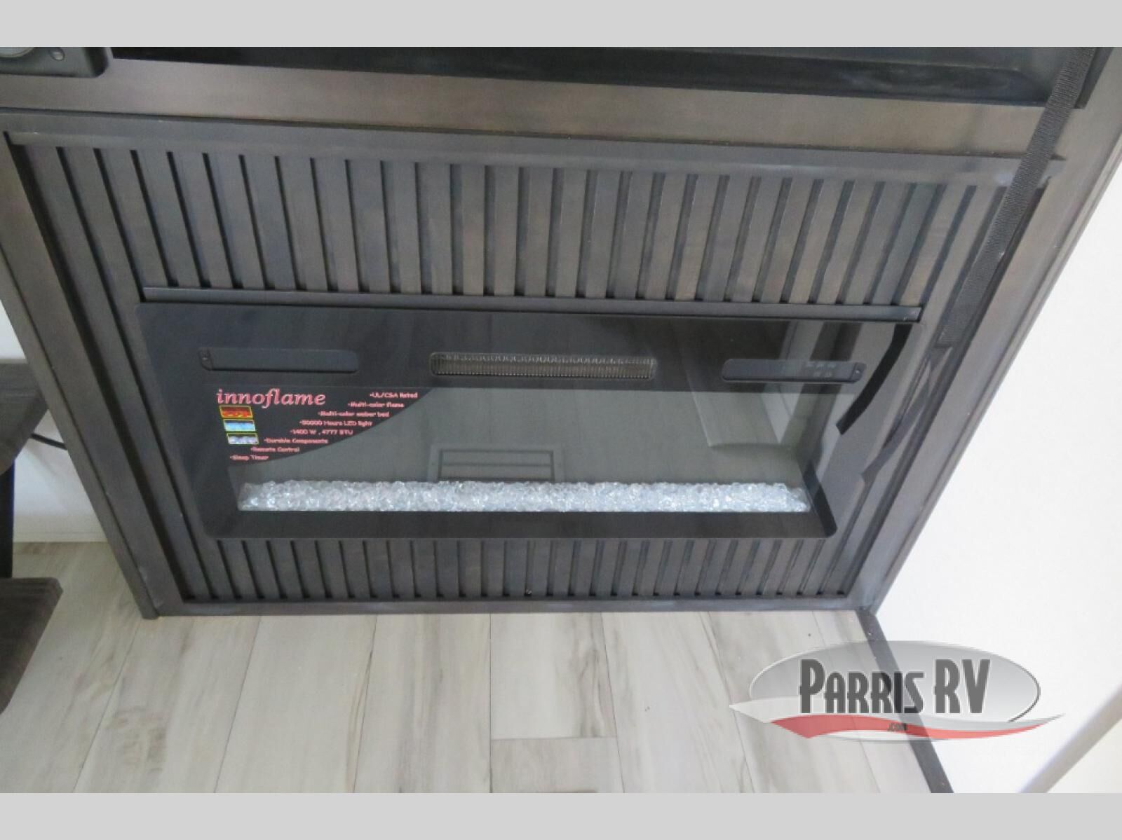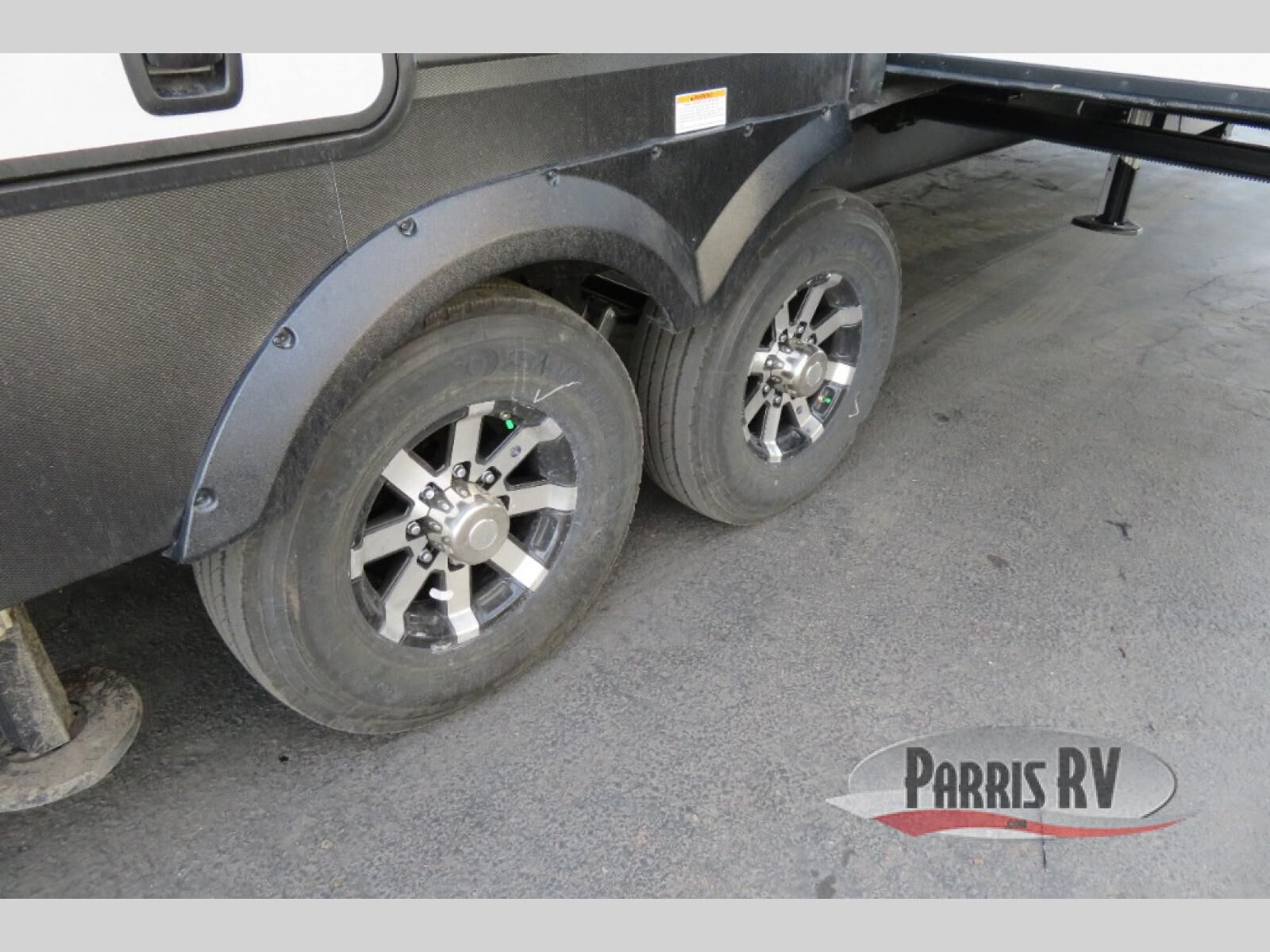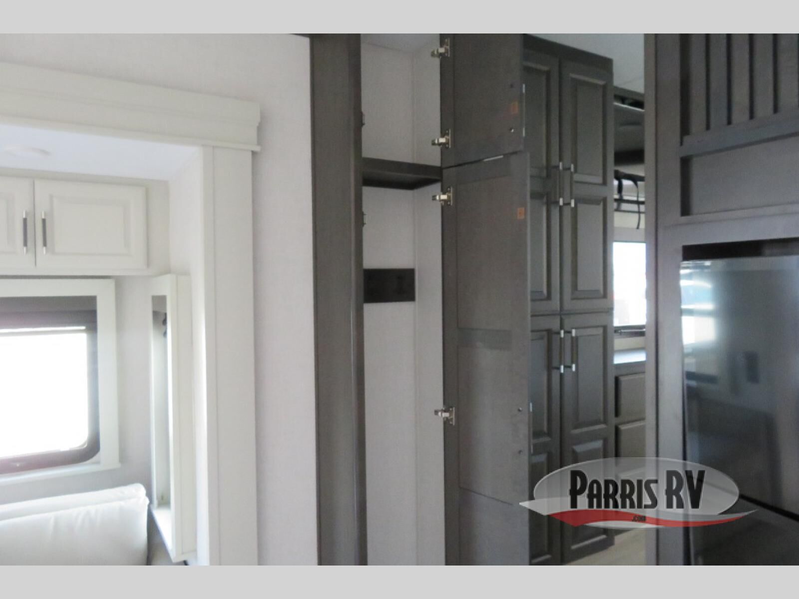This fifth wheel is decked out in luxuries! The full rear bathroom has a walk-in shower to freshen up in each morning, a dual sink vanity for two to get ready at once, plus washer and dryer prep. You will enjoy a good night's rest on the king bed slide inside the private bedroom and others can sleep on the opposing tri-fold sofa sleeper slides in the living room. There is also a theater seating here, along with a fireplace and 50" LED TV for movie nights. The front kitchen is where it's really at in this fifth wheel; ample counter space, a bar top with stools, pull-out drawers, plus a pantry and closet for even more storage!