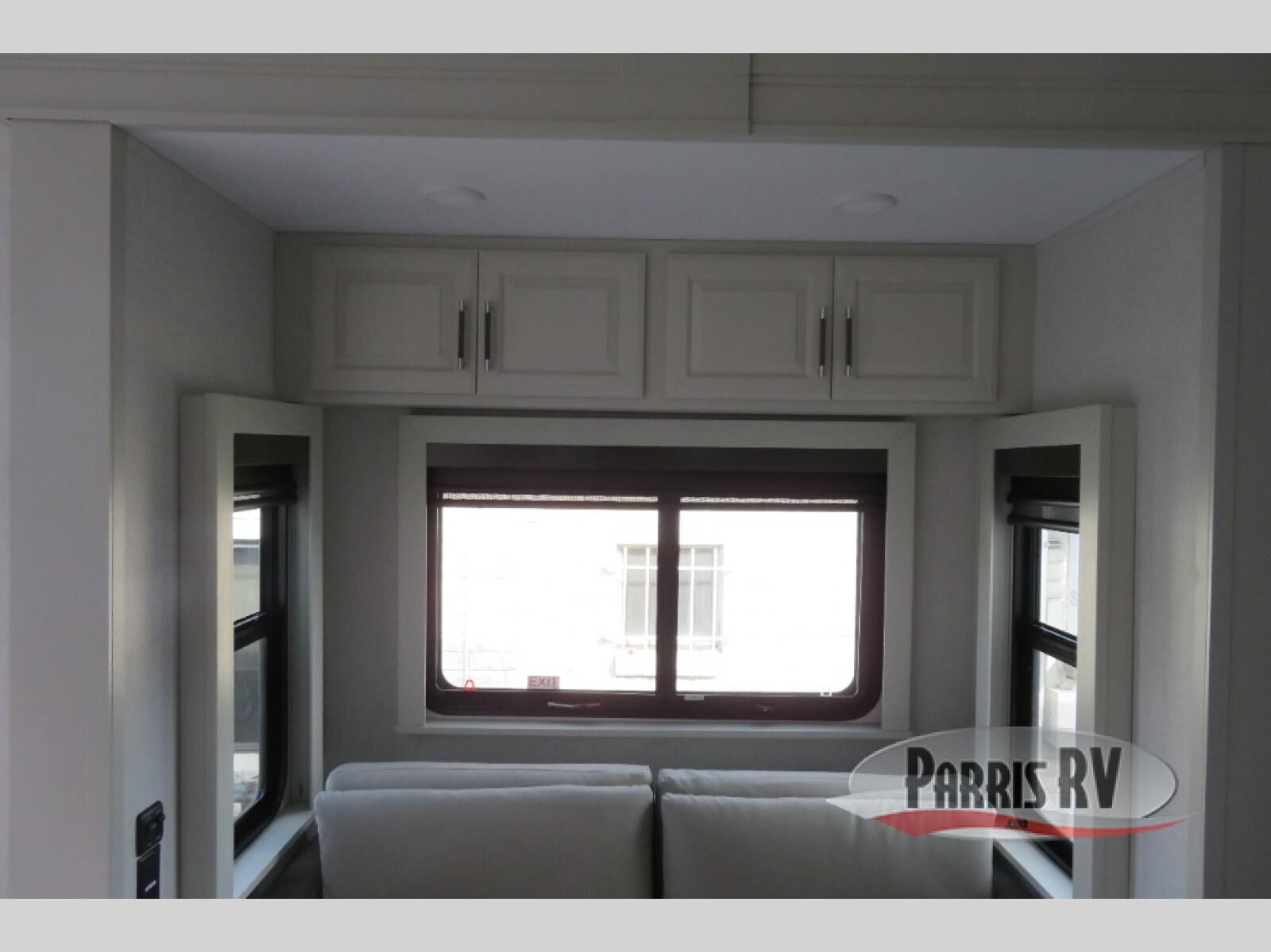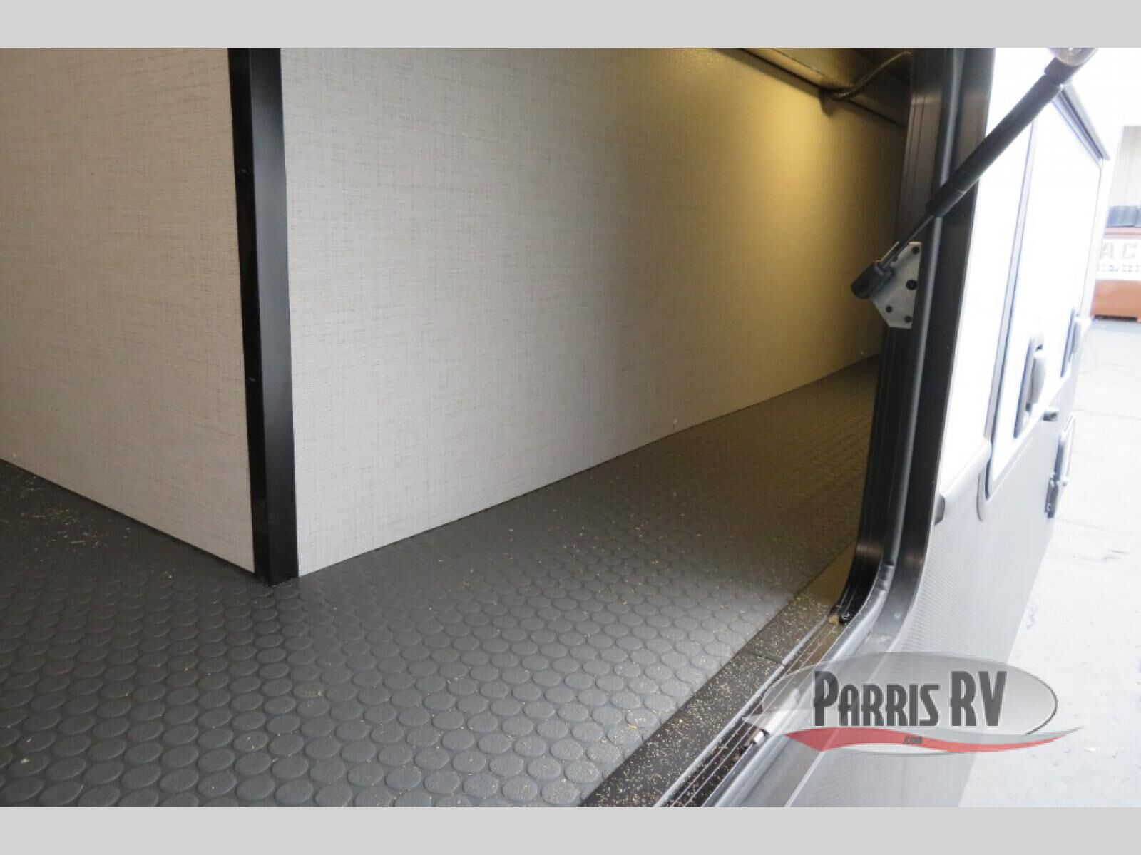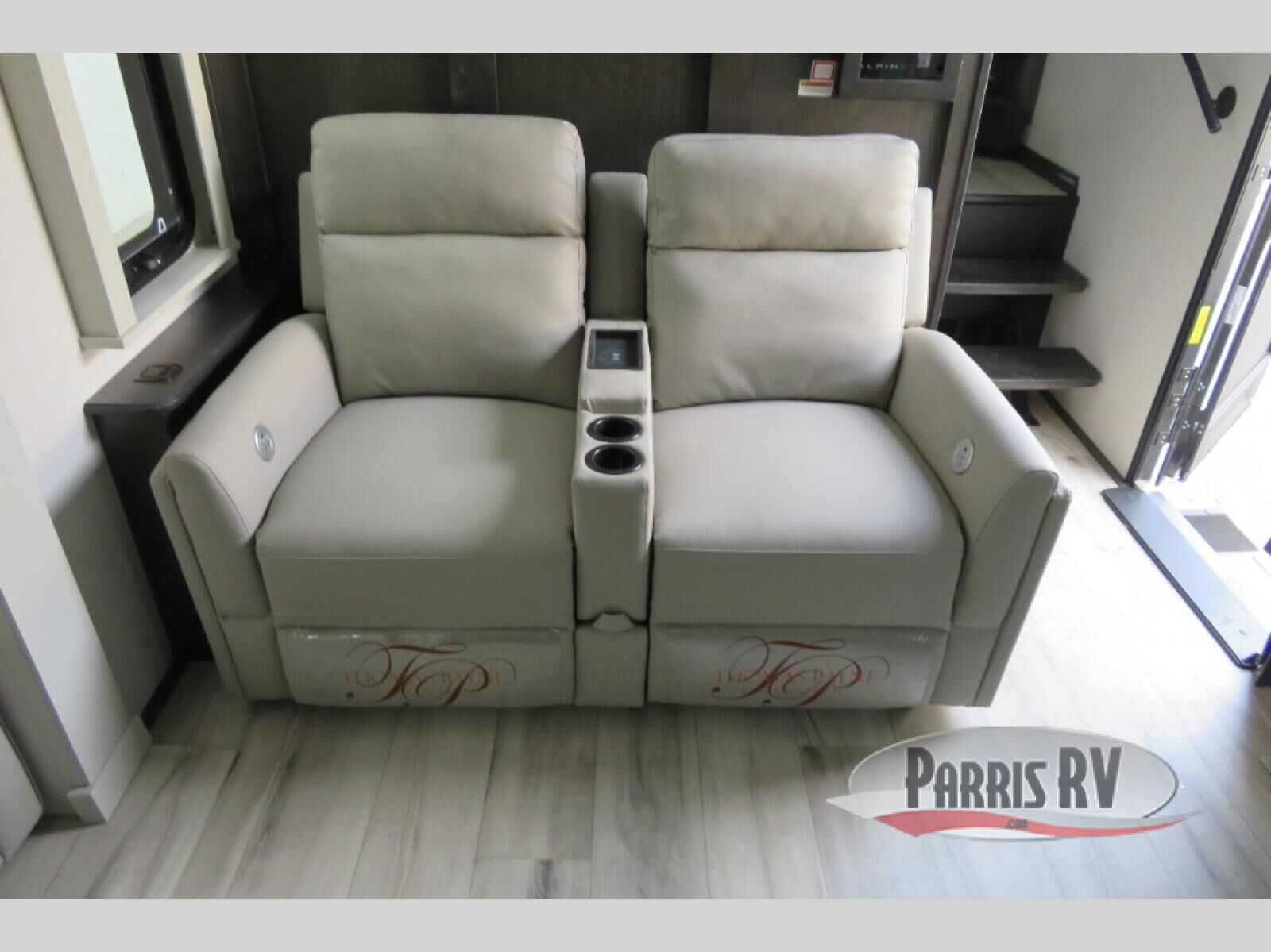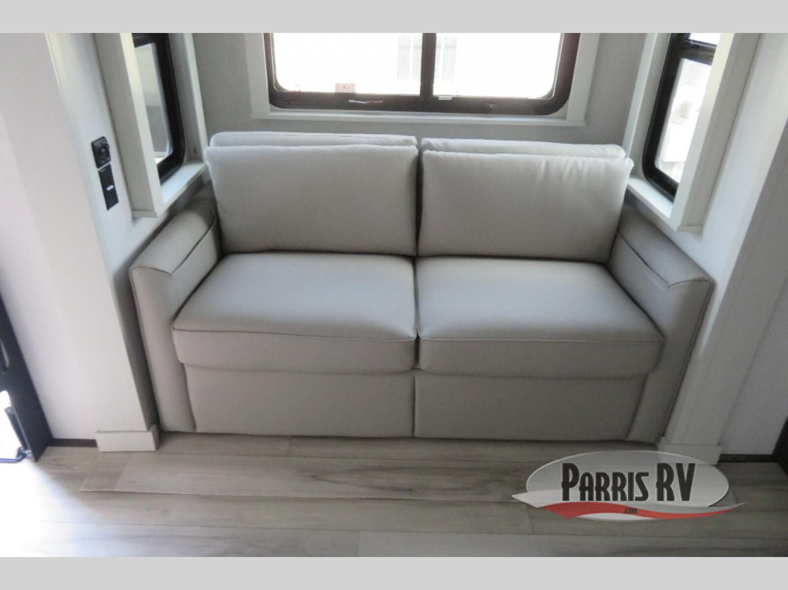 This fifth wheel is decked out in luxuries! The full rear bathroom has a walk-in shower to freshen up in each morning, a dual sink vanity for two to get ready at once, plus washer and dryer prep. You will enjoy a good night's rest on the king bed slide inside the private bedroom and others can sleep on the opposing tri-fold sofa sleeper slides in the living room. There is also a theater seating here, along with a fireplace and 50" LED TV for movie nights. The front kitchen is where it's really at in this fifth wheel; ample counter space, a bar top with stools, pull-out drawers, plus a pantry and closet for even more storage!