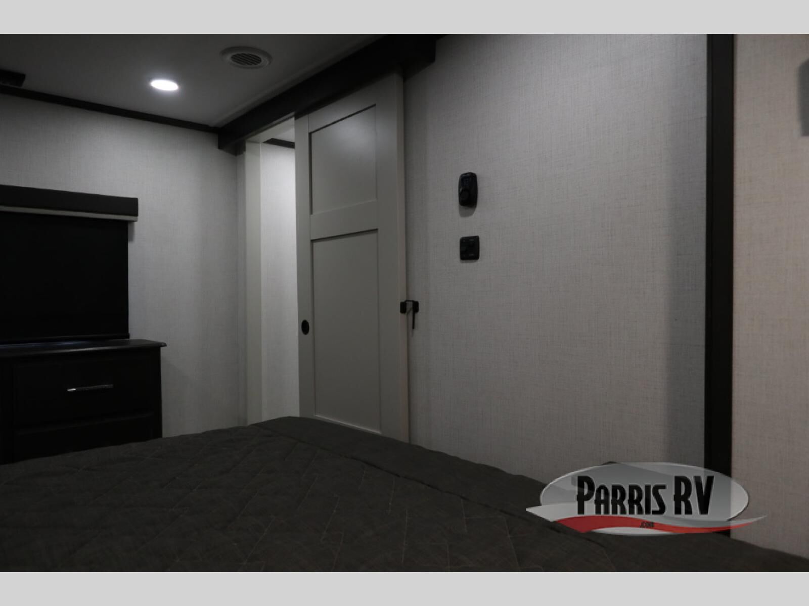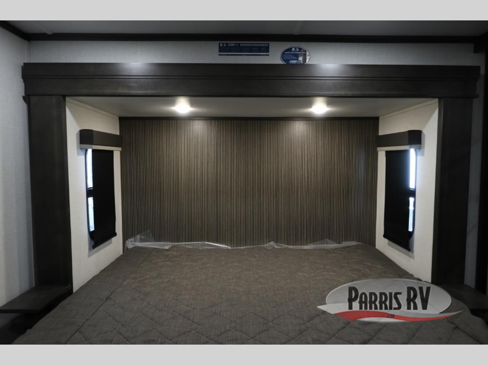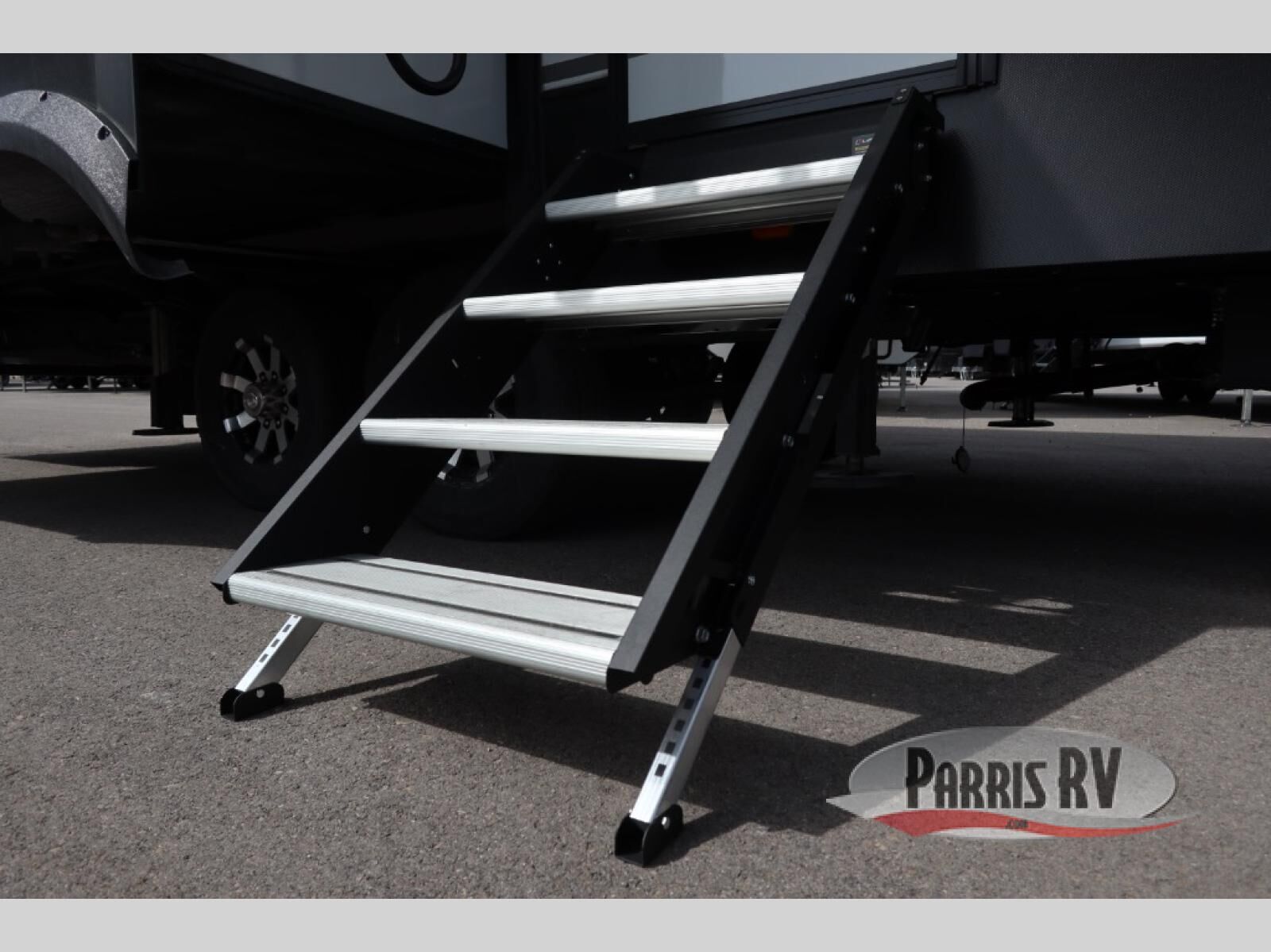 For the couple that loves to travel, you will truly enjoy this spacious fifth wheel featuring triple slides with dual opposing in the main combined kitchen and living area. Here you can entertain friends, even overnight, thanks to the hide-a-bed sofa sleeper. A free standing dinette and four chairs makes dining feel like home, and you will love the spacious kitchen for cooking with a large center island including prep space next to the double sink. A side hutch offers space for dishes, or place for other small appliances to be left out. The master bedroom is just beyond the spacious bath on your left up the steps and behind a space saving sliding barn style door. You will sleep comfortably on the king bed that slides out to provide even more floor space for getting dressed, and there is also a prepped area for adding a stackable washer and dryer if you choose. The bath provides a large shower and vanity with dual sinks so two can easily get ready at once!