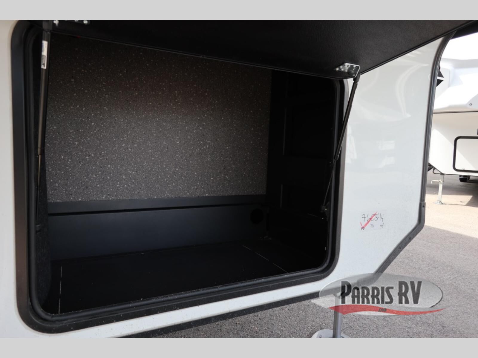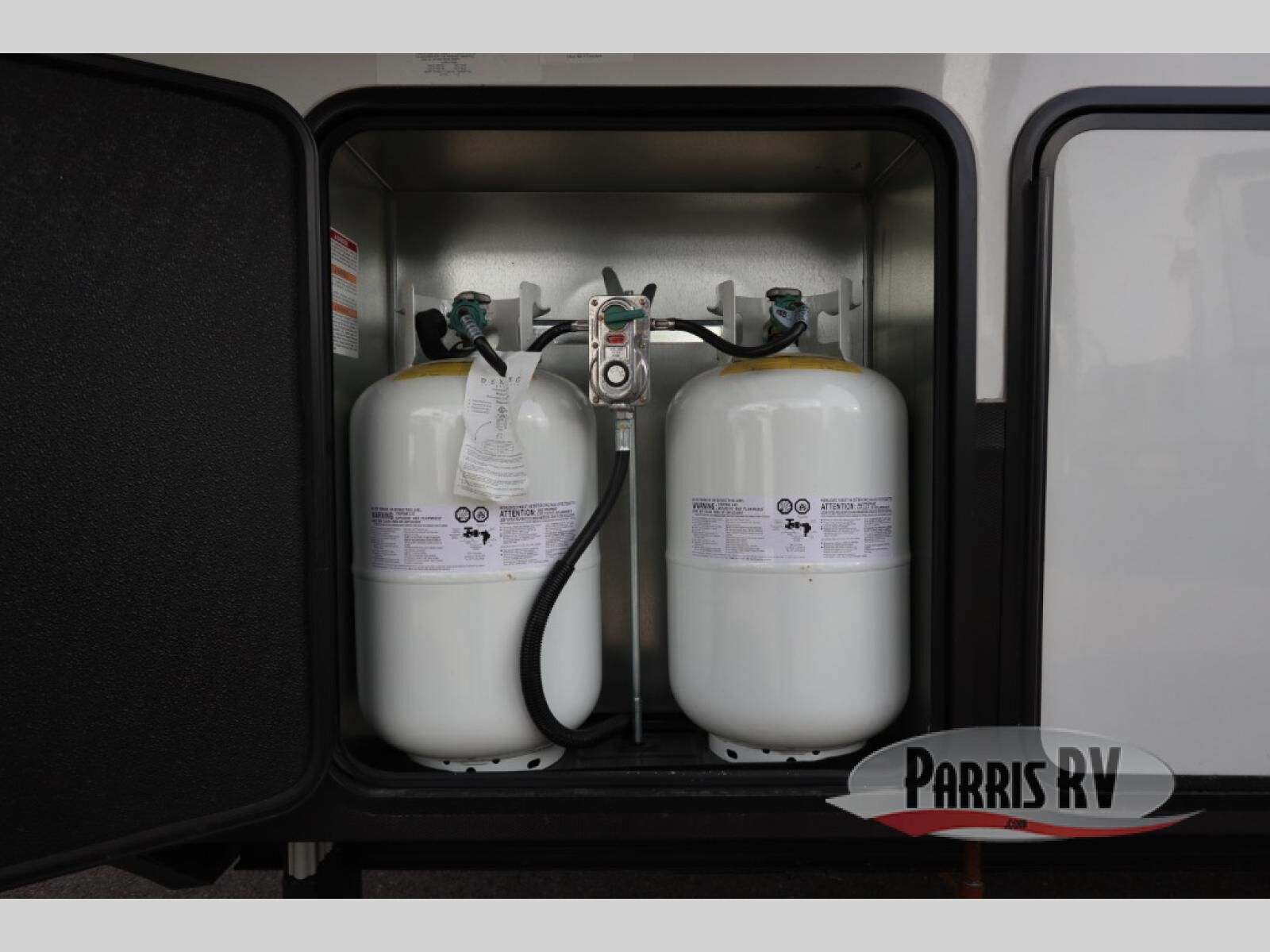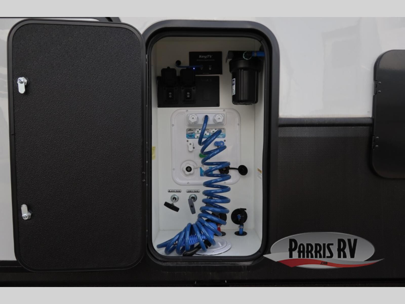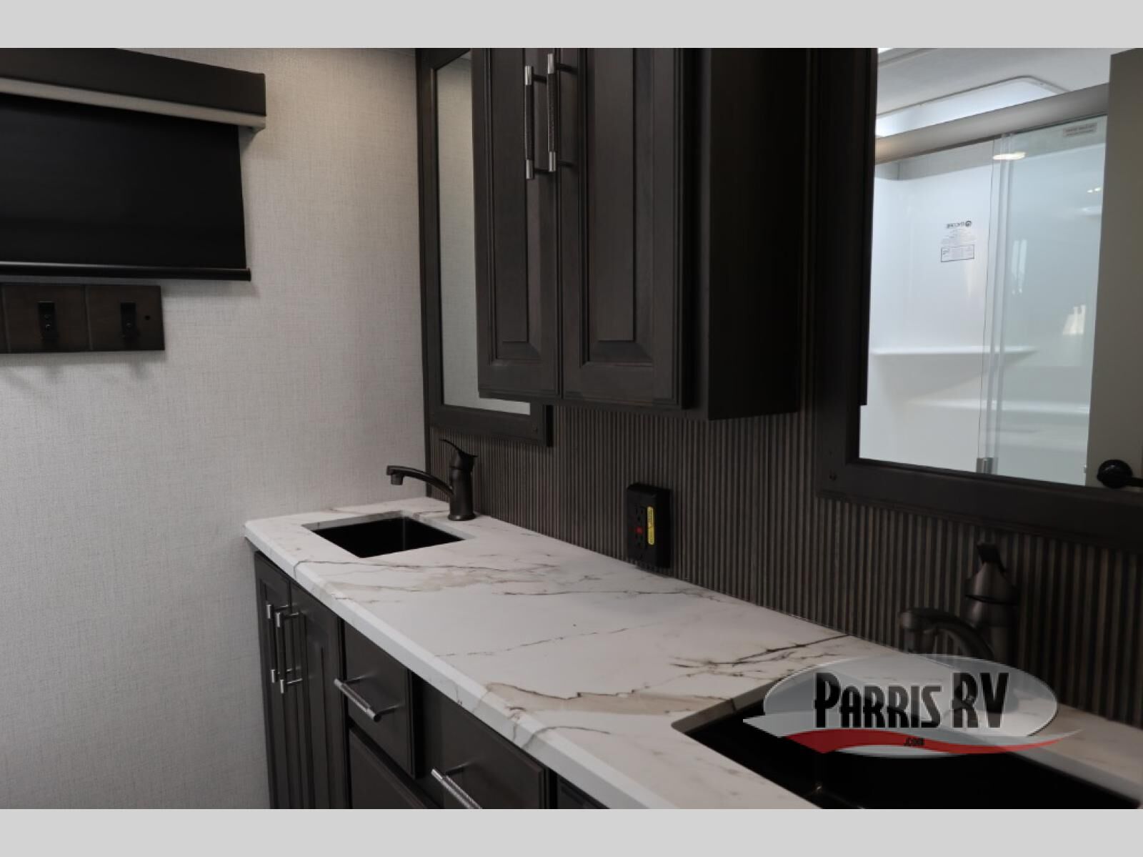 For the couple that loves to travel, you will truly enjoy this spacious fifth wheel featuring triple slides with dual opposing in the main combined kitchen and living area. Here you can entertain friends, even overnight, thanks to the hide-a-bed sofa sleeper. A free standing dinette and four chairs makes dining feel like home, and you will love the spacious kitchen for cooking with a large center island including prep space next to the double sink. A side hutch offers space for dishes, or place for other small appliances to be left out. The master bedroom is just beyond the spacious bath on your left up the steps and behind a space saving sliding barn style door. You will sleep comfortably on the king bed that slides out to provide even more floor space for getting dressed, and there is also a prepped area for adding a stackable washer and dryer if you choose. The bath provides a large shower and vanity with dual sinks so two can easily get ready at once!