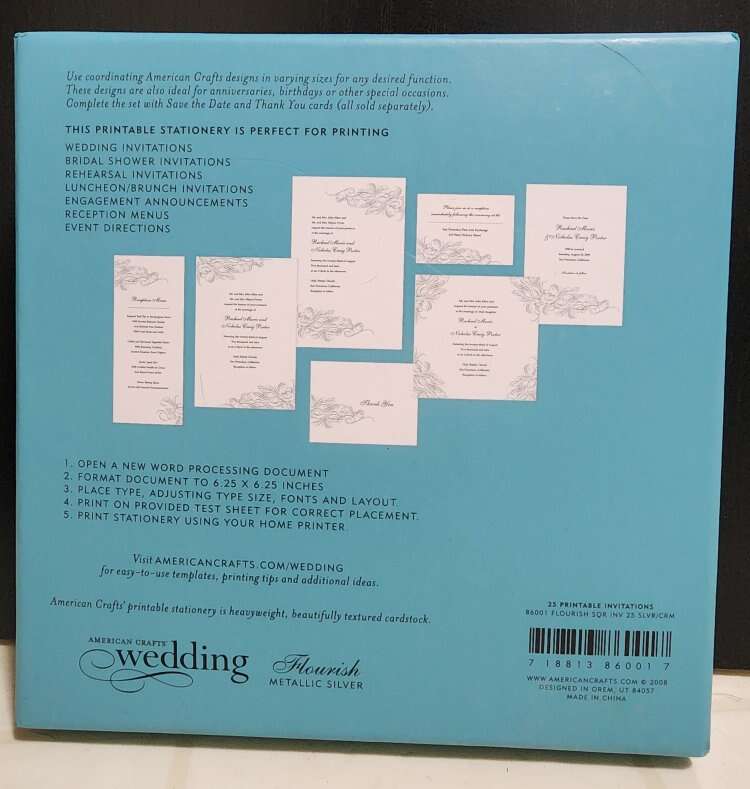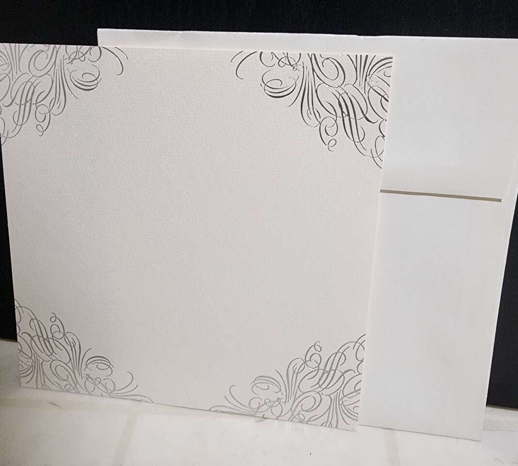 color: off-white with silver detail size: 6.25 x 6.25" qty: 13 packages (325 invitations)