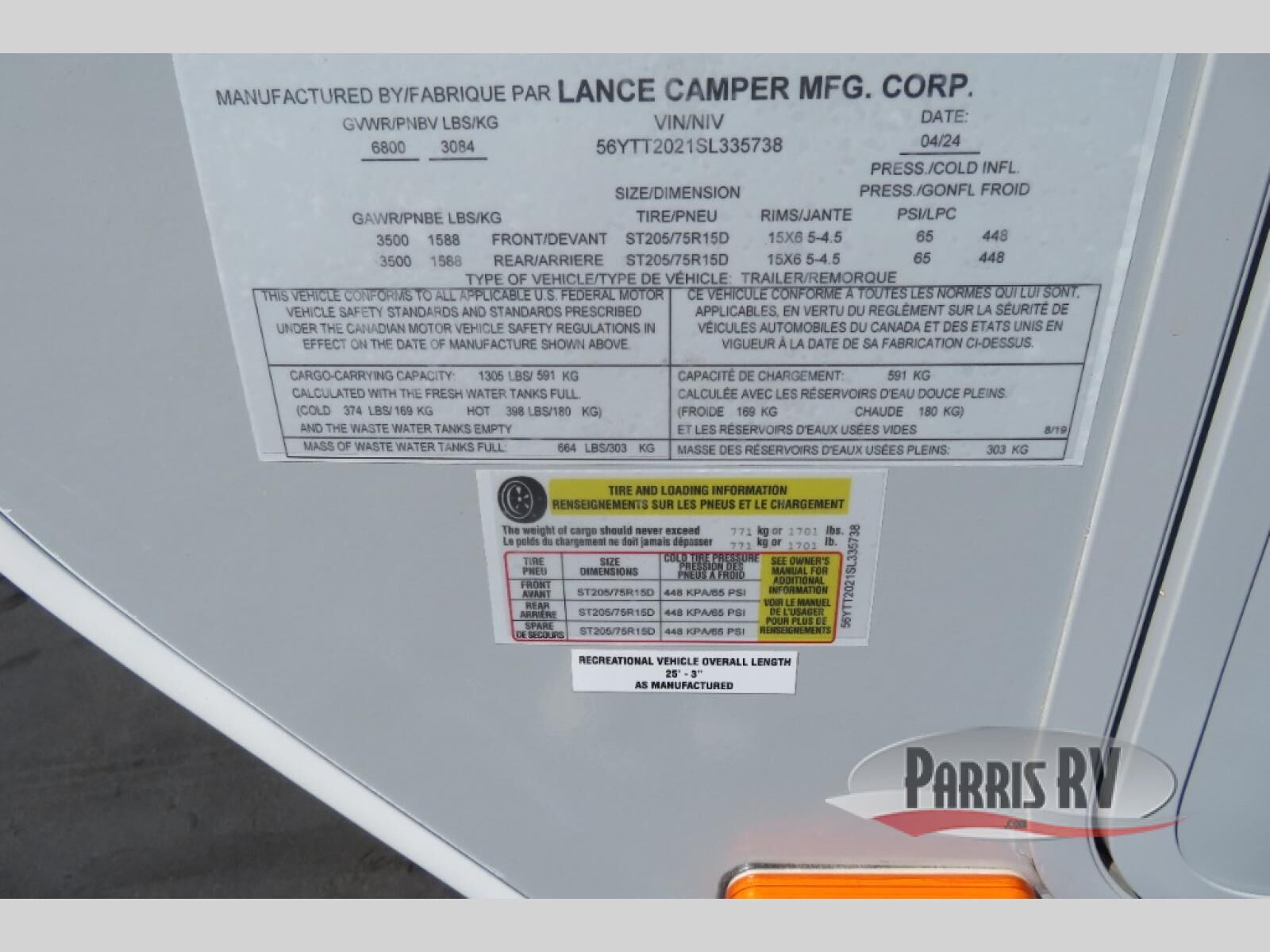 The line-up for the Lance travel trailers centers around three gorgeous interior décor options, a lengthy list of product enhancements, and simplification of ordering with many optional features being made standard. Some of the stand out features you'll want to take note of are the Keyed-Alike storage compartment doors for all of your camping essentials, the dual layer Azdel composite to prevent your unit from rotting, and the durable one-piece TPO roof. The interior includes Euro overhead cabinetry designs, a pop-up electrical/charging tower, and a Shower Miser water system. You'll also find an innerspring mattress with a bedspread, a dual pane shower skylight, USB charging ports to keep your electronics at 100%, plus a JBL AM/FM stereo and JBL interior/exterior Bluetooth speakers to keep the party going!