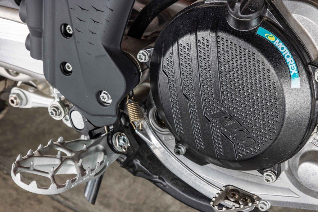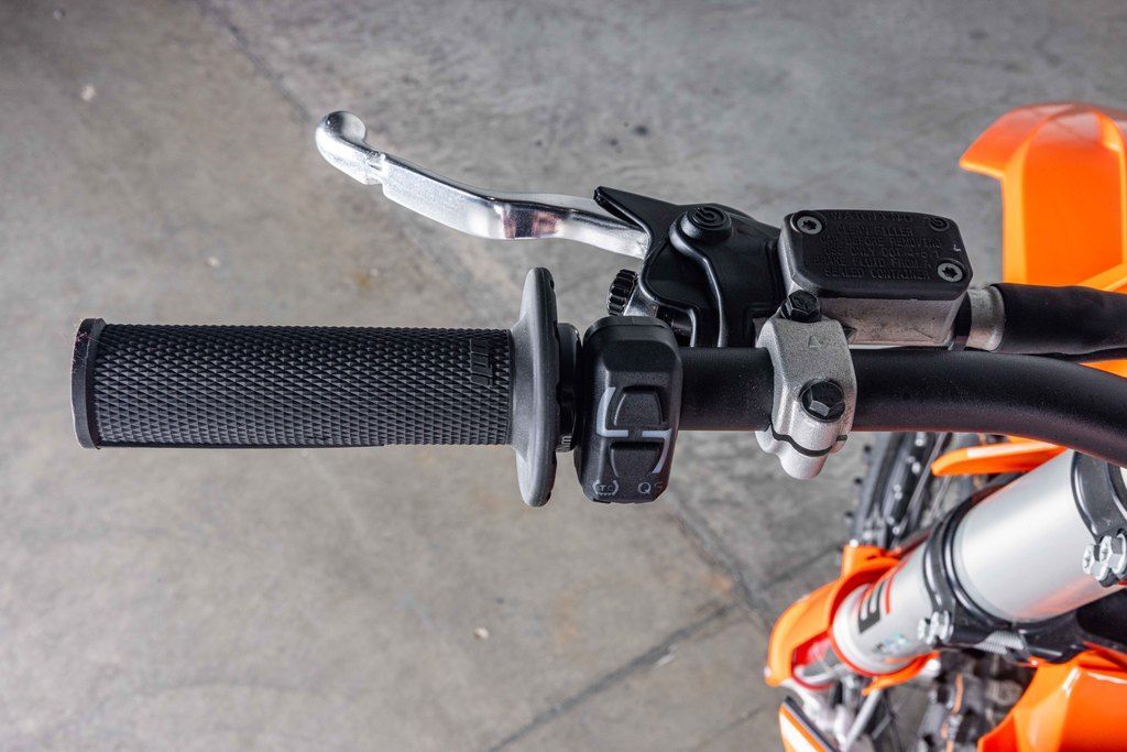 The map select switch on the 2025 KTM SX models features a simpler design, allowing for easier functionality in switching between 2 engine maps. Map 1 provides a more linear power curve. while map 2 punches all-out with aggressive throttle and explosive power. Luckily, Traction control is easy toggled to an on or off position from the same switch, ensuring maximum traction and a distinct advantage in wet or muddy conditions.