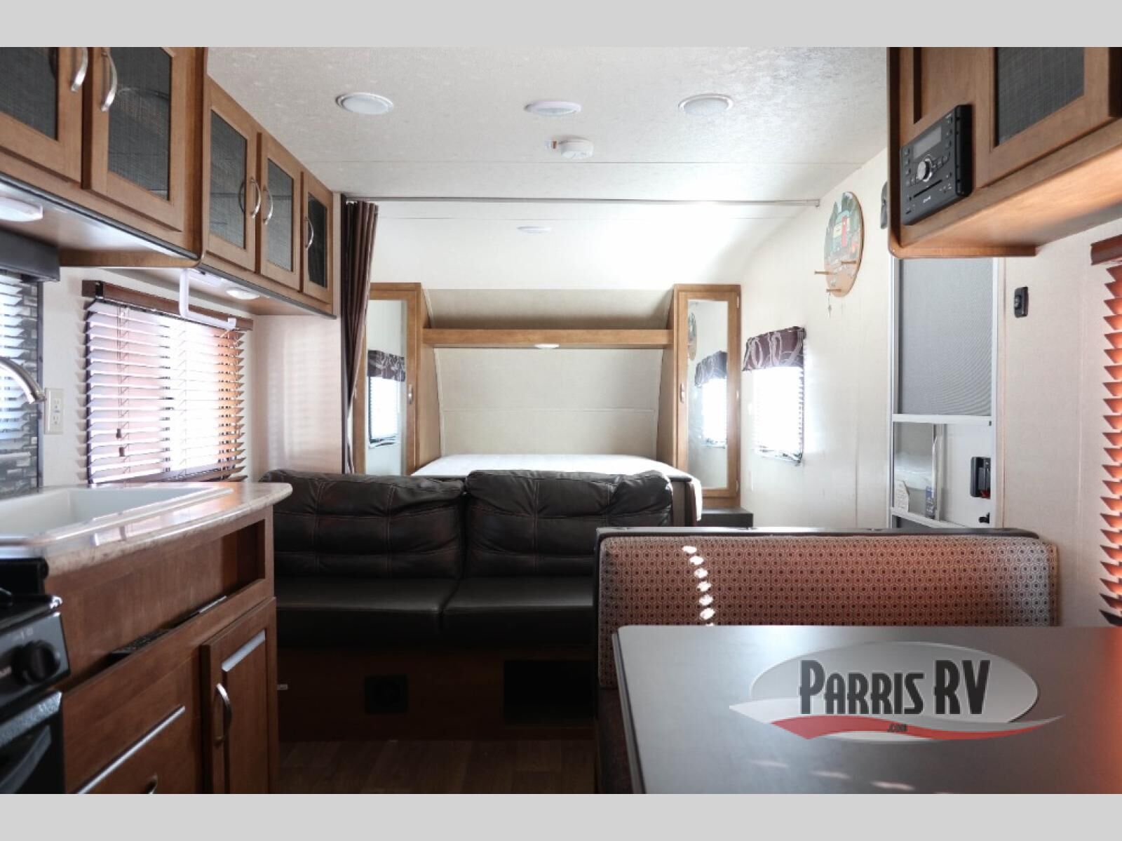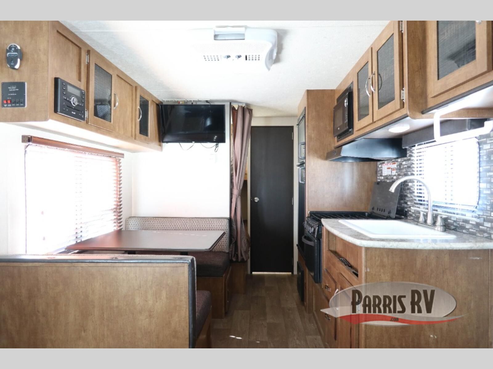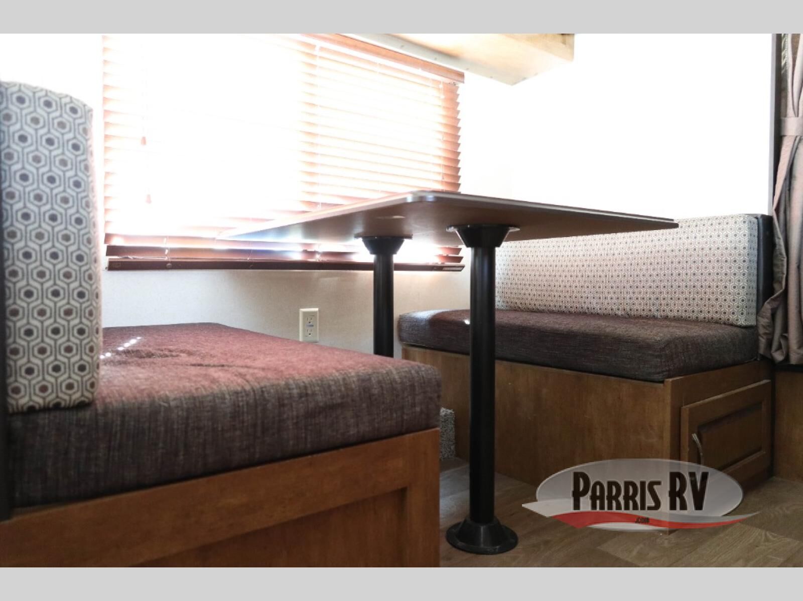 Take this unit on your next weekend camping trip and sleep up to seven individuals. There is a queen bed, the sofa, and the dinette both fold down into a sleeping arrangement and then the double bed bunk beds. Enjoy playing games at the booth dinette or curling up with a book on the sofa. Play a game of cornhole, then grab a snack and rest under the awning. It is perfect for keeping the sun off, but you are still able to enjoy the fresh air.