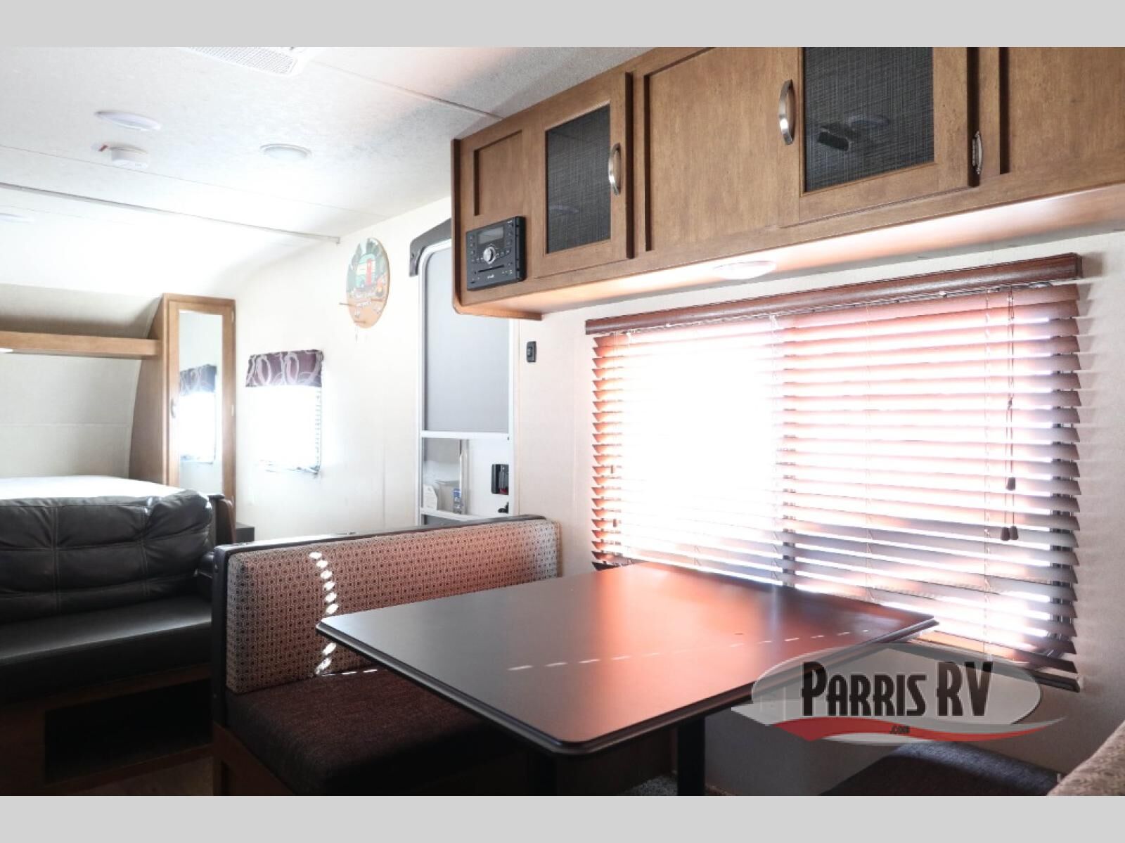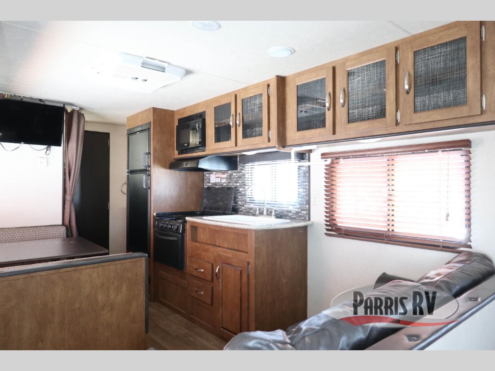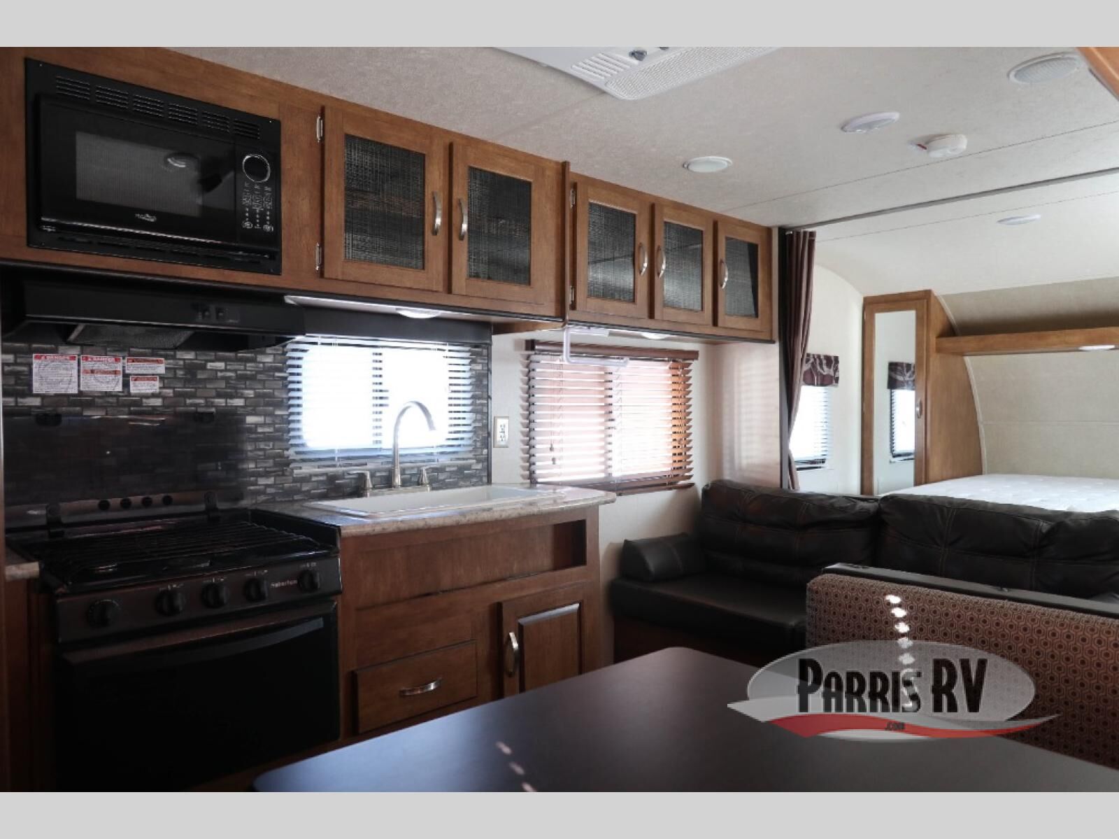 Take this unit on your next weekend camping trip and sleep up to seven individuals. There is a queen bed, the sofa, and the dinette both fold down into a sleeping arrangement and then the double bed bunk beds. Enjoy playing games at the booth dinette or curling up with a book on the sofa. Play a game of cornhole, then grab a snack and rest under the awning. It is perfect for keeping the sun off, but you are still able to enjoy the fresh air.
