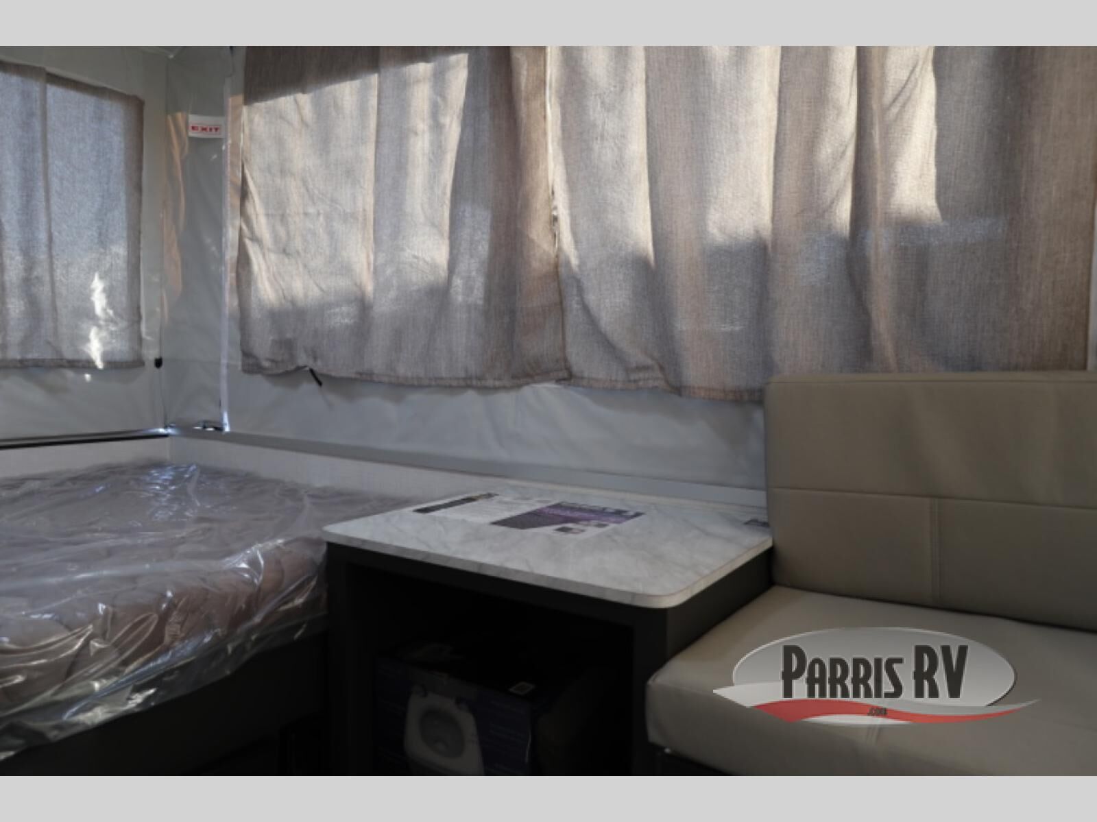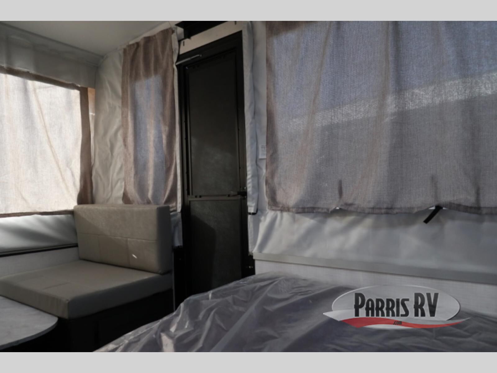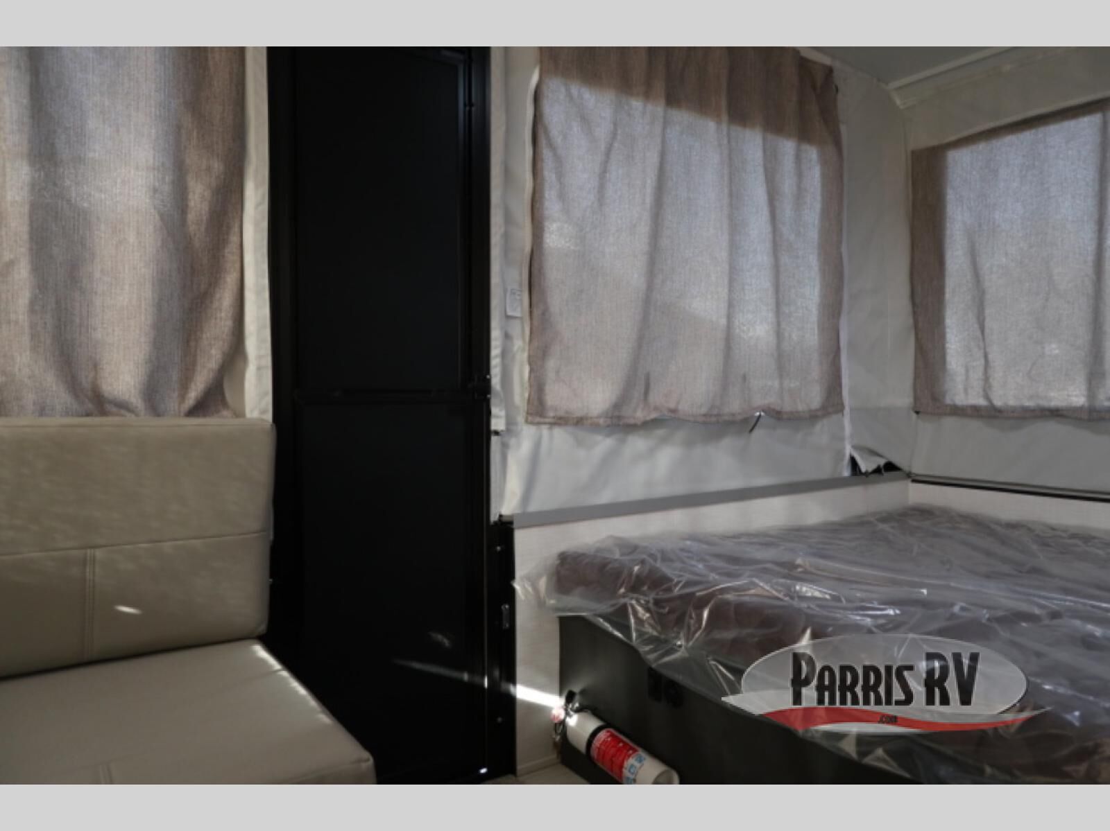 With any Rockwood OTG (Off The Ground) folding pop-up camper by Forest River, you will enjoy a more simple approach to outdoor fun. If you're a regular tent camper, but are looking for a little more comfort, then take a look at these easy-to-tow models! There are electric brakes, balancing bead filled tires, and leaf spring axles that provide that easy towing, and the alloy fiberglass exterior is durable. A one-piece screen door also comes standard so you can let fresh air in, while keeping bugs out, and the LED interior lights will be an added benefit you didn't have while tent camping. Each model also includes residential style cabinet doors, wood look flooring, and an Andover Sable wood interior for a more outdoorsy feel!
