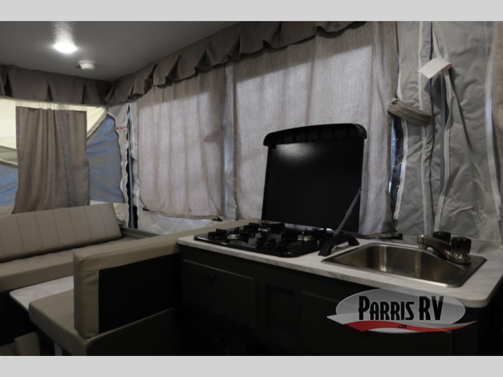 This Rockwood Freedom Series folding pop-up camper is going to let you camp in freedom! You will be able to use the permanently mounted three burner range to cook up some delicious food, and the 9' awning with an LED light will keep you protected while you work. You will also find that the booth dinette with added seating will be useful for both meal time and bed time when the two tent end beds aren't enough space, and the storage lid under the front bed provides storage for luggage, blankets, and more!