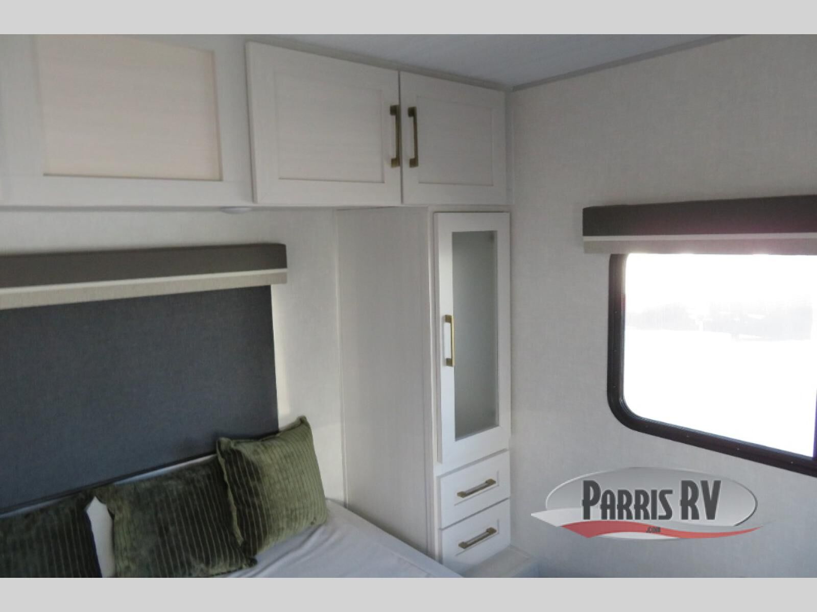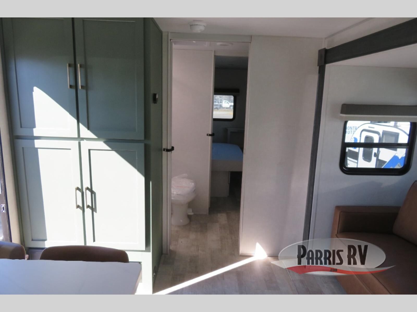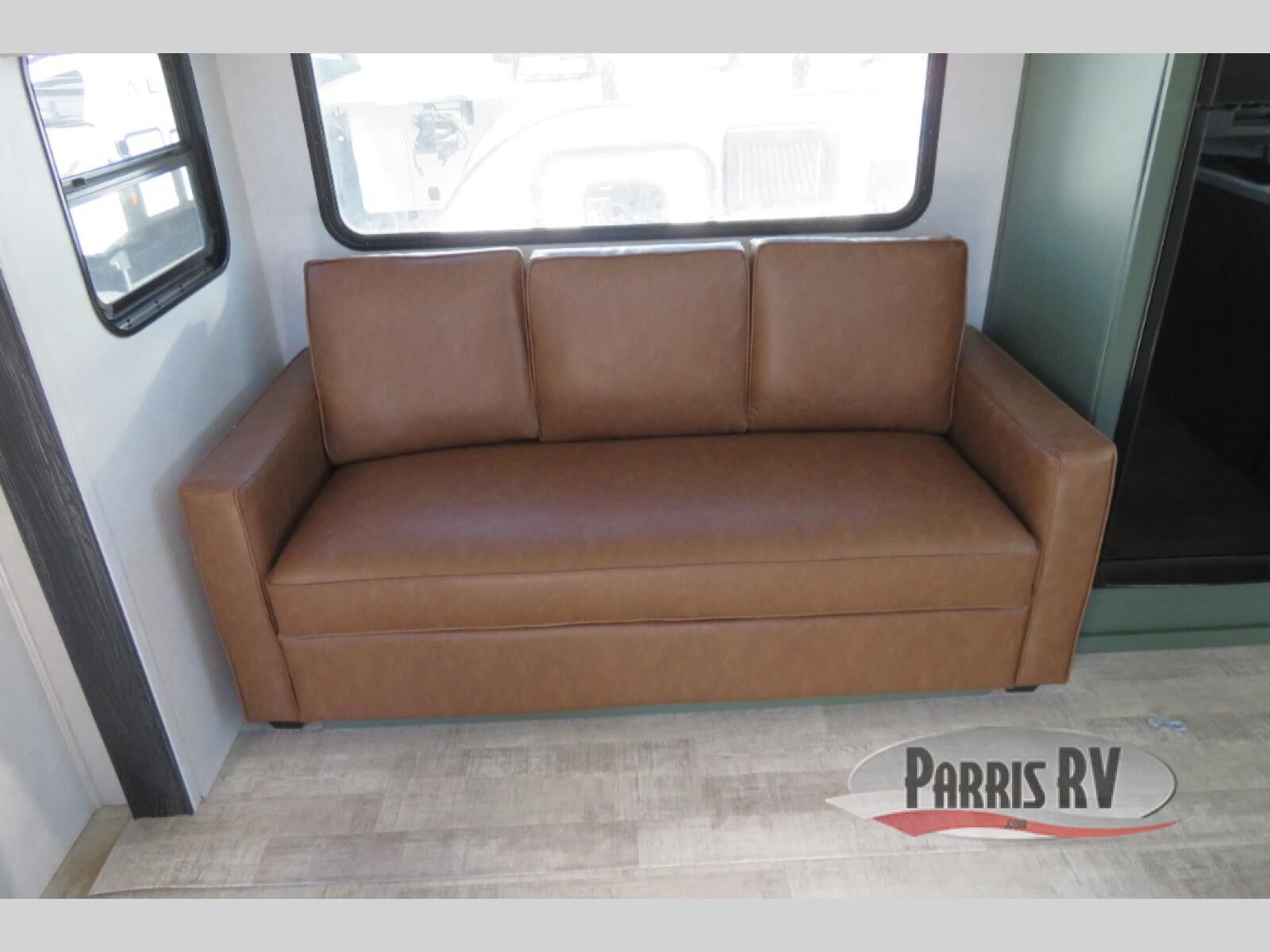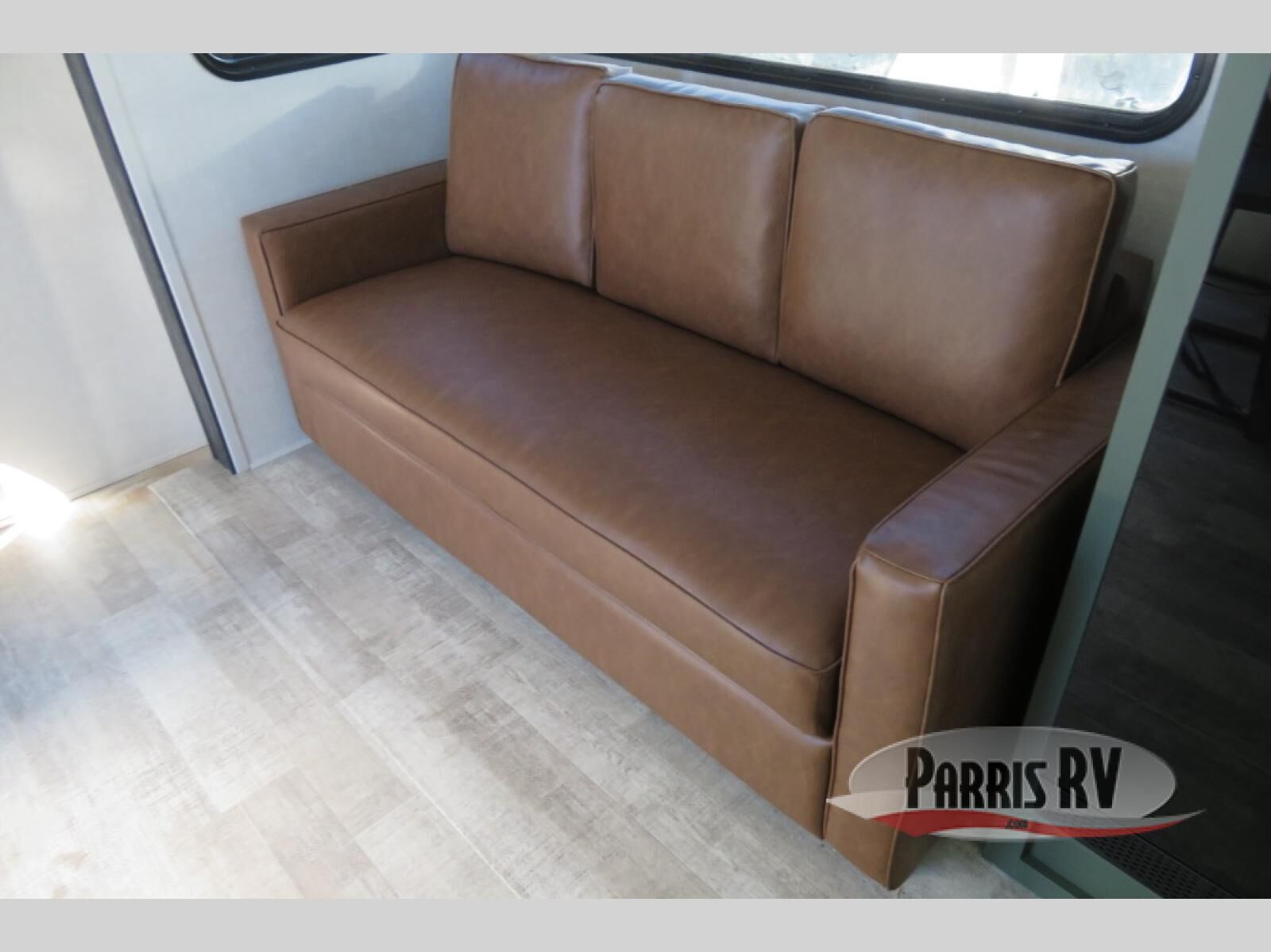 This couple's trailer is perfect for weekend trips or extended stays at the campground. A front kitchen includes generous counter space, along with a bar top and two seats. You can relax on the jackknife sofa slide after breakfast, or head outdoors to sit under the patio awning. The walk-thru bath will lead to the rear master bedroom where you'll find a queen bed and dual wardrobes for your clothes.