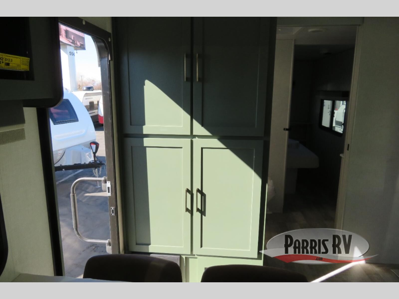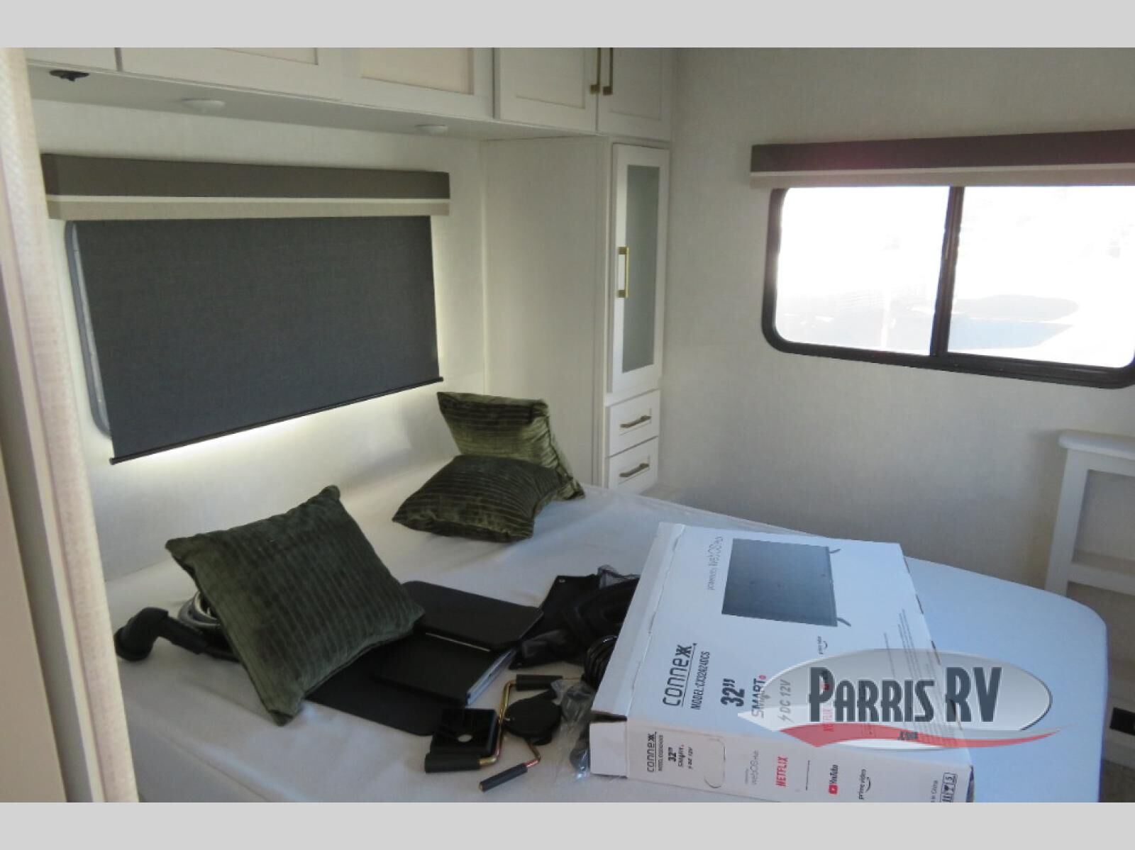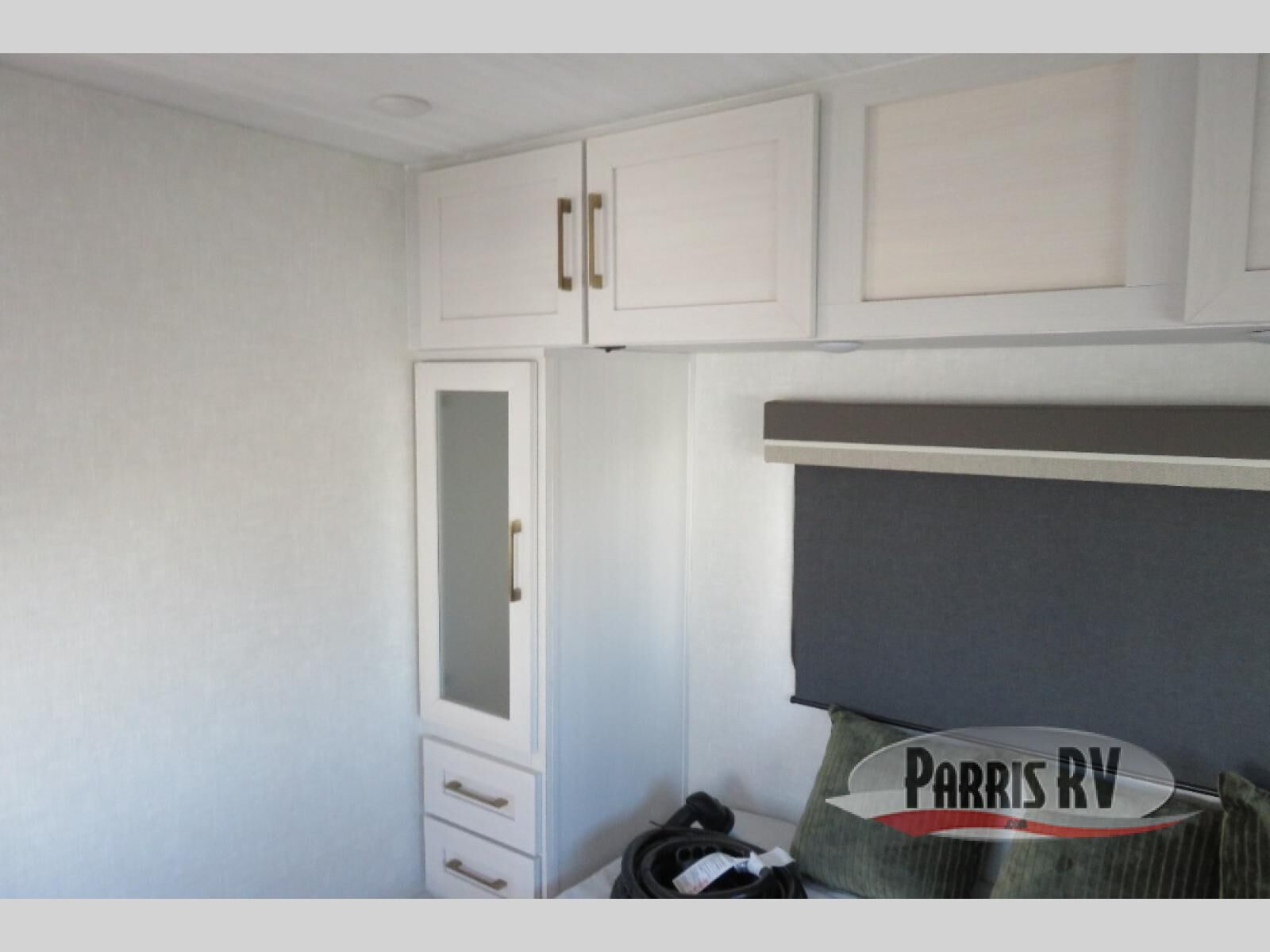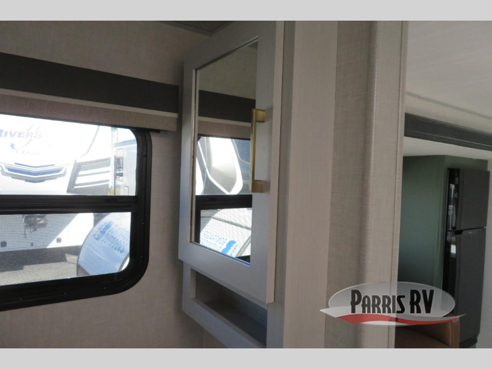 This couple's trailer is perfect for weekend trips or extended stays at the campground. A front kitchen includes generous counter space, along with a bar top and two seats. You can relax on the jackknife sofa slide after breakfast, or head outdoors to sit under the patio awning. The walk-thru bath will lead to the rear master bedroom where you'll find a queen bed and dual wardrobes for your clothes.