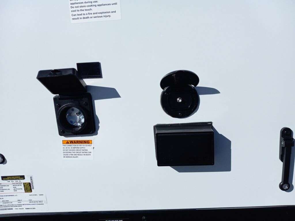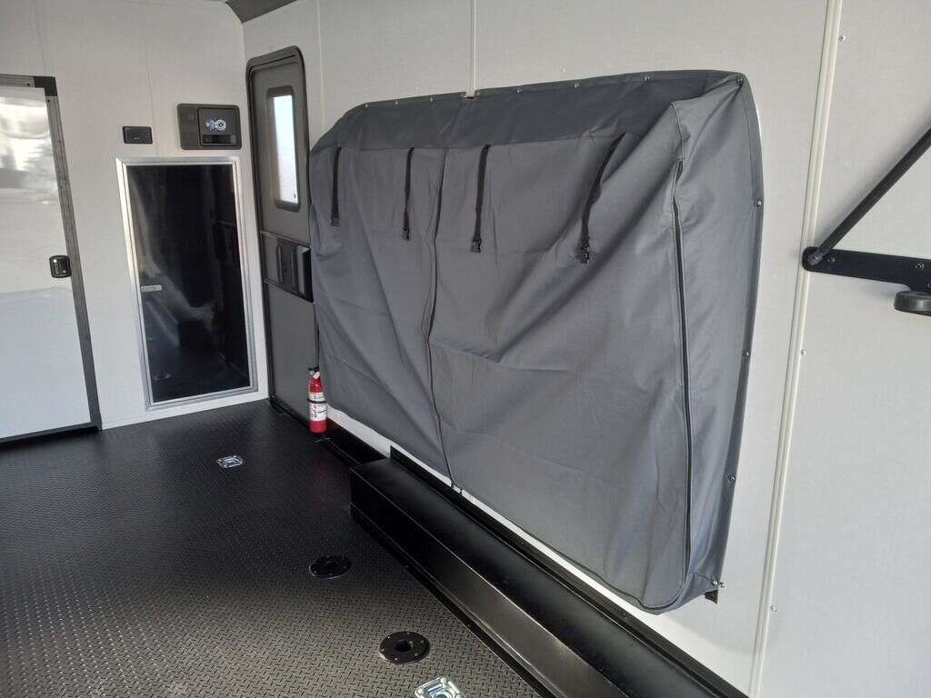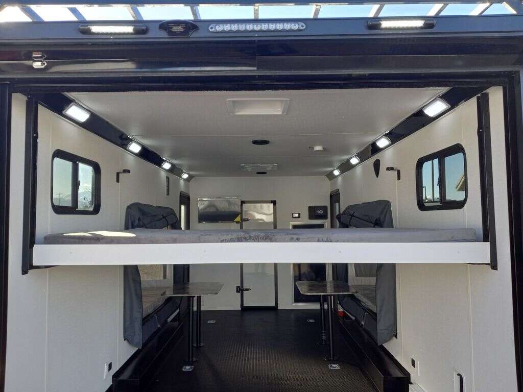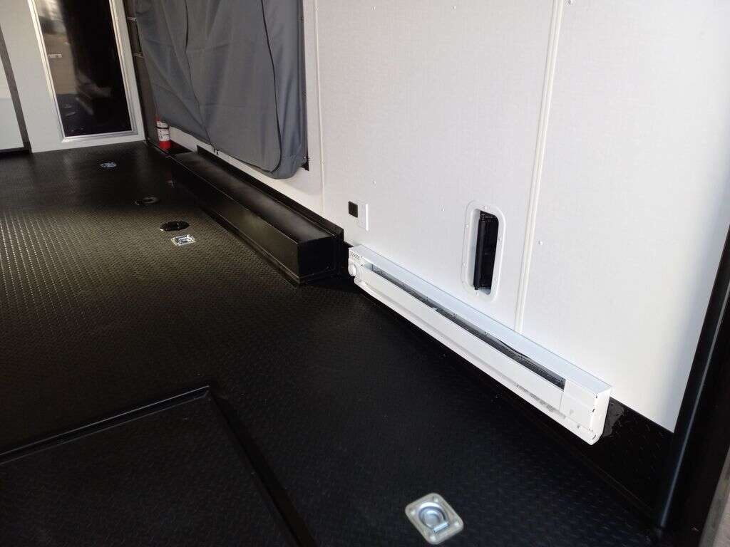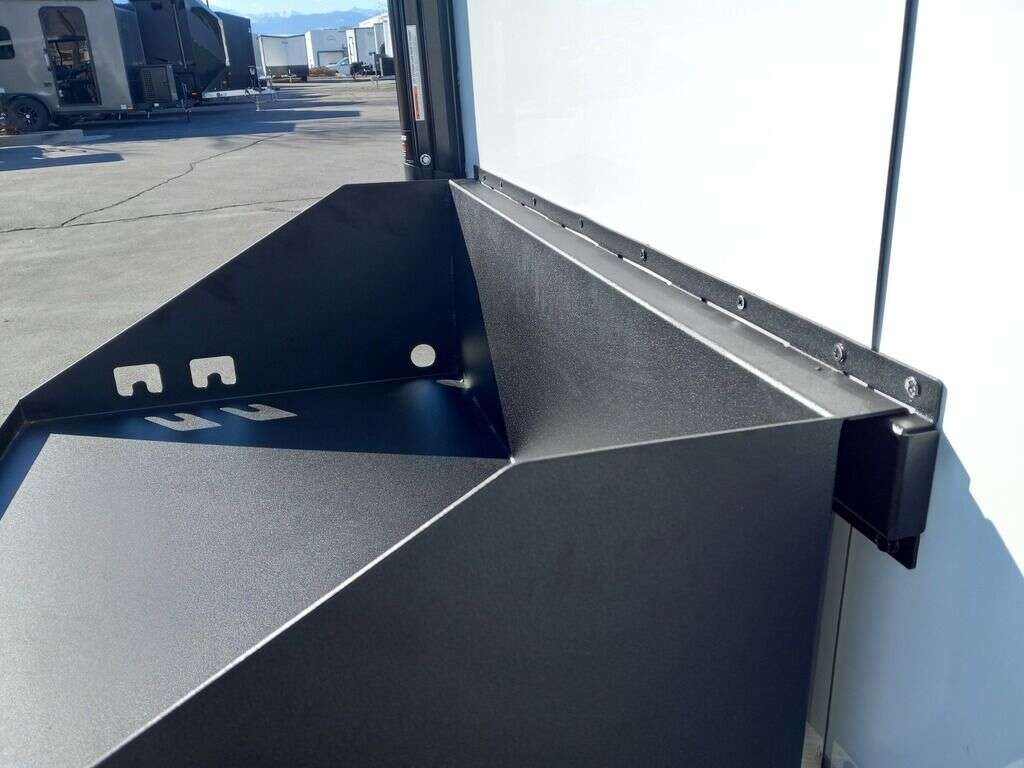 4000# Rear Cableless Ramp Door w/Steel Flap, (2) Roof Vent in Living/Garage Area, 15,000 BTU A/C, 12V Roof Vent in Bathroom, Painted Tongue/Rear Sill Black, (1) Pair Rear Stab Jacks, Rear Spoiler with LED Load Light Pkg, 48" Beavertail ****PLUMBING**** 22 Gallon Fresh Water Tank, 30 Gallon Black Waste Tank, 30 Gallon Gray Waste Tank, 6 Gallon DSI LP Gas/Electric Water Heater, 12V Water Pump, City/Gravity Water Fill Hook Up, RV Toilet, Bathroom Mirror & Robe Hooks, 24x24 Shower w/Hard Shell Enclosure, Exterior Grill/Drop-In Cook Top, Large Single Bowl Sink, Tank and Battery Monitor Panel, ****ELECTRICAL**** -Way Electrical Plug, LED Strip Taillights/Marker Lights, 12V Deluxe LED Lighting, 45 Amp RV Power Center w/12V Converter, 30 Amp Motor base Plug, Detachable Twist lock Power Cord, Battery Box w/12v Battery, Interior and Exterior GFI Receptacles, Interior 110V Receptacles, USB Ports, 6 Cubic Foot Refrigerator, Microwave Oven, Baseboard Heater/Furnace, TV w/Prep Package - Includes: Coax Cable Outlets - Interior & Exterior, Omnidirectional TV Antenna UHF/VHF, 110V 4FT LED Cove Lights in Living/Garage Area, Smoke, CO, & LP Detector & Fire Extinguisher *****INTERIOR***** 3/4" Drymax Floor & 3/8" Wht Vinyl Walls, Polystyrene Foam Insulation-Walls & Ceiling, ATP Rubber Floor Covering, White Vinyl Ceiling Liner w/Black Cove Molding, 5000# Recessed D-Rings, (1) Pair Black Aluminum Directional Vents ****ROOF**** Seamless Aluminum Flat Top Roof, LED Marker Lights, *****METAL**** .080 Screwless PolyCore/Armor Shield Composite Skin ****FINAL***** LED Strip Taillights/Marker Lights, 12V Deluxe LED Lightning, Black Aluminum Wheels w/Radial Tires & Black, Center Caps, Recessed Spare Tire Compartment, Limited 3 Year Structural Warranty, 01-OPT1.952, Platinum Package, Includes: Deluxe Stereo Package with: AM/FM/CD/DVD/USB/MP3/WMA Capable Stereo, (4) Hi Output Weatherproof Speakers (2) Interior & (2) Exterior TV w/swivel bracket, Rear Hide-A-Screen (Pull Down Bug Screen), Solar Port, Stow and Go Bed Lift System: (Includes (1) Queen Mattress Setup) #SE102940 SE102940
