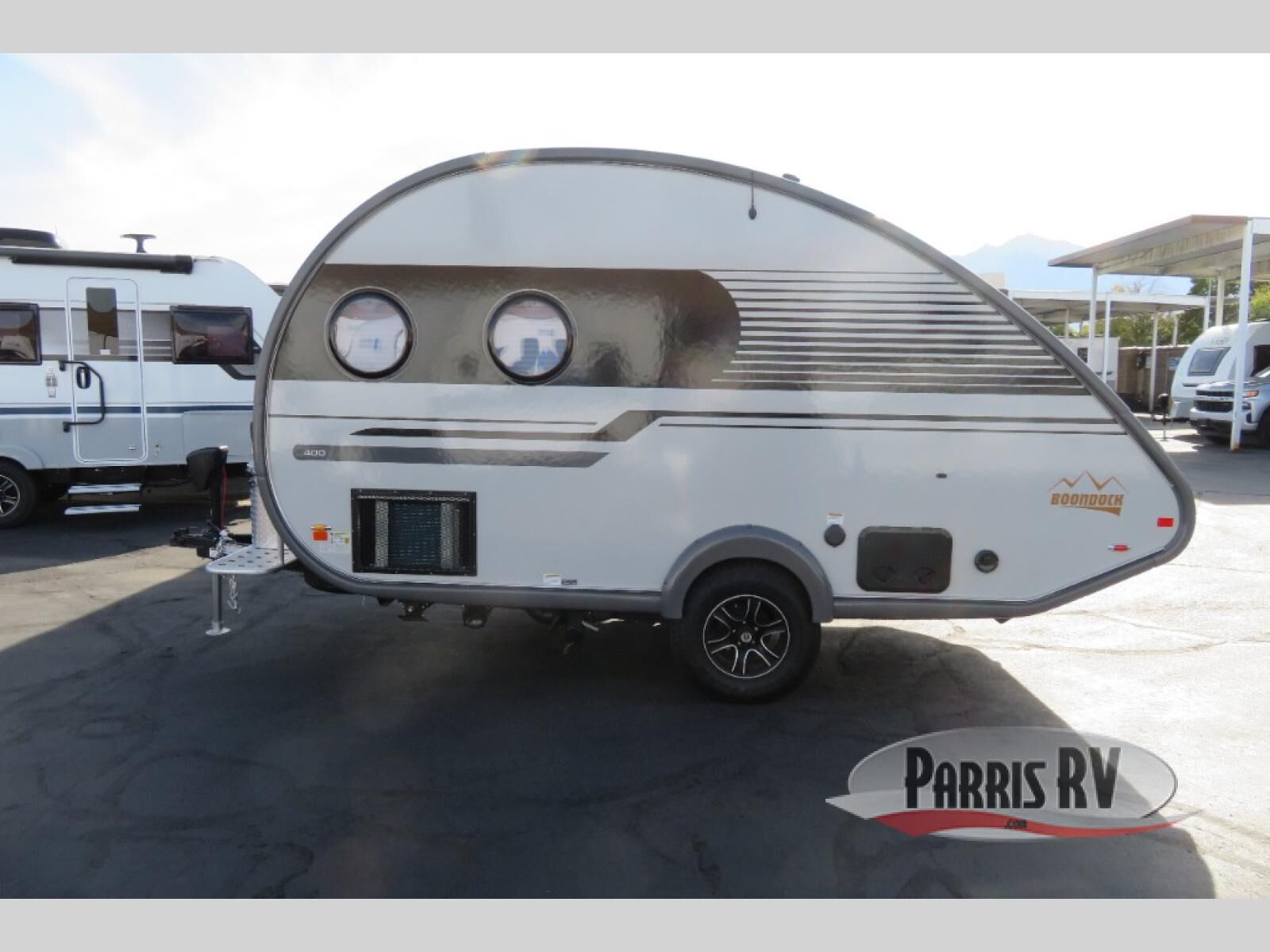 This teardrop trailer offers sleeping space for three with two sleeping areas; one up front and one in the rear. The dinette allows you to eat and relax during the day, and at night this space becomes sleeping space for one. The queen-size sleeping area is located on the opposite side with the wet bath in between for convenience for all. The galley kitchen will give the cook a place to make warm meals and store leftovers in the 4.6 cu. ft. fridge. Everyone can watch the 24" TV through the Bluetooth media center before bedtime, or in the morning as you all plan your next activity. And the Alde central heat and Alde FLOW instant hot water system as well as central air conditioning will keep you comfortable where ever you setup. If you enjoy more off-road type camping, consider the optional Boondock package and Lithium battery option which will allow you to go off-grid. The Lithium battery will provide 400-amp hrs. of lithium w/internal heat, Bluetooth connected SmartShunt and 3000-watt inverter/charger with Bluetooth control. Please note: The model specs. shown are for the standard TAB 400. With the Boondock optional package the height will be 8' 11", dry tongue weight will be 407 lbs. and total gross dry weight will be 2,919 lbs.
