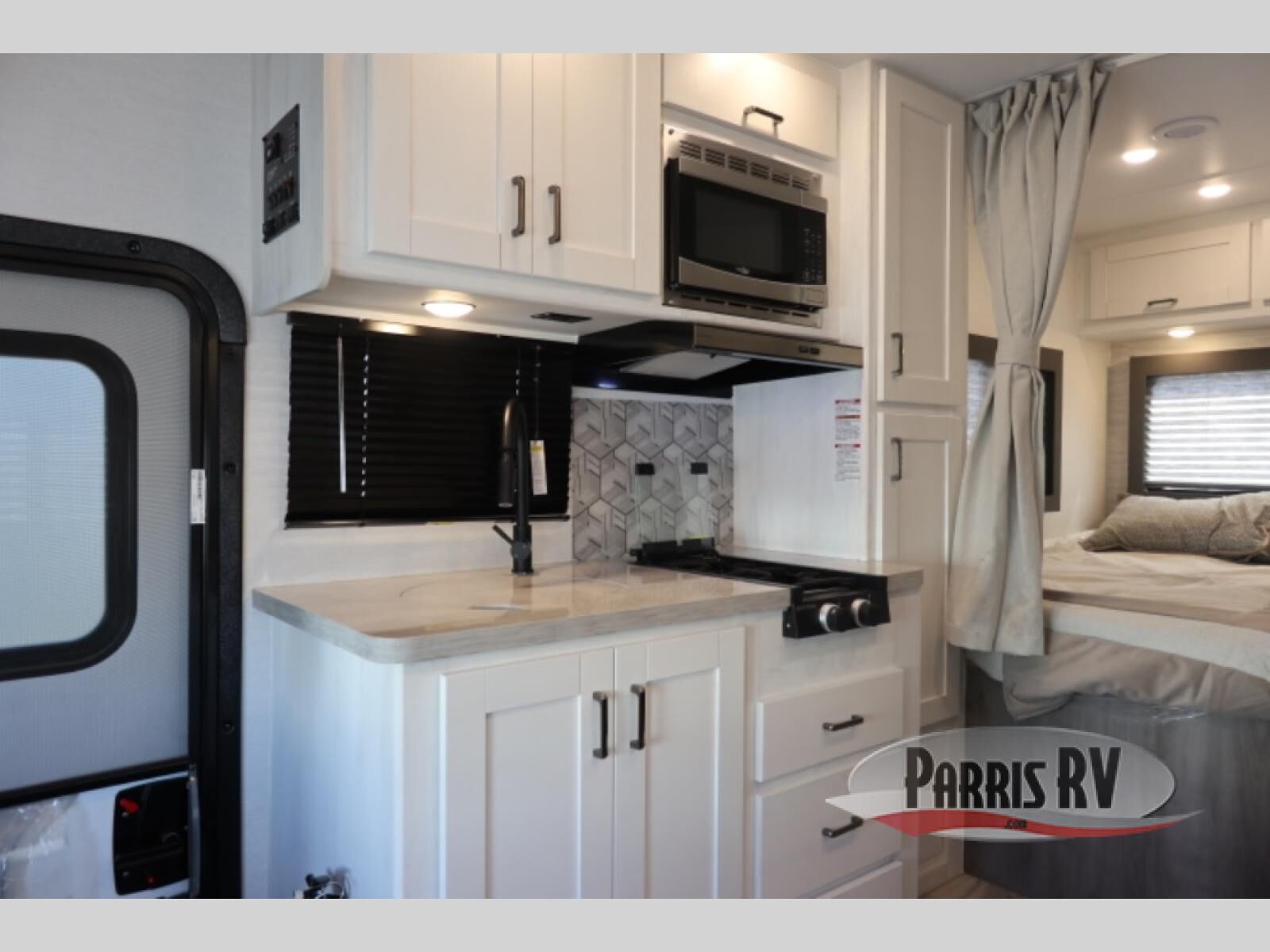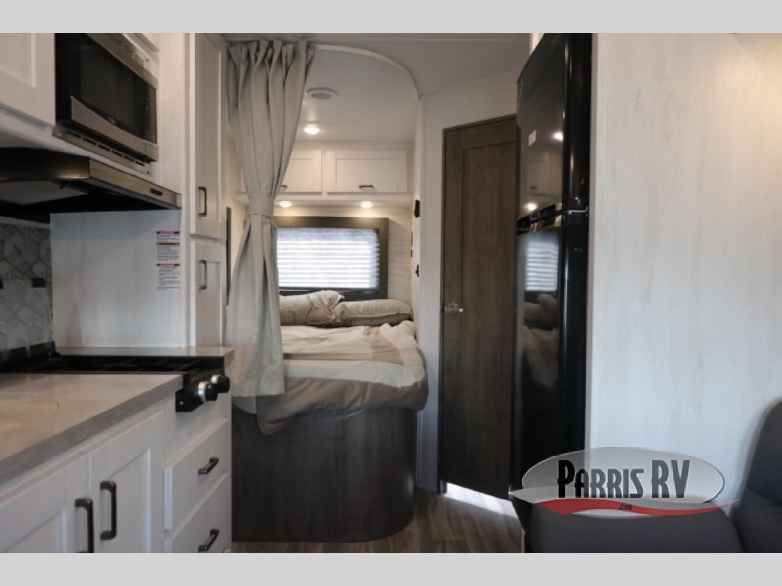 This compact coach is perfect for five to six campers each night! You'll enjoy the sofa with a removable table for dining space or just relax with a good book. The overhead bunk is sure to be a hit with the little ones, and an optional TV on swing arm can be added if you want the option to watch movies in the evenings. Cook up your best meals in the galley kitchen, and freshen up daily in the full bath. There is also a rear corner 52" x 72" bed with an overhead cabinet for your personal belongings!