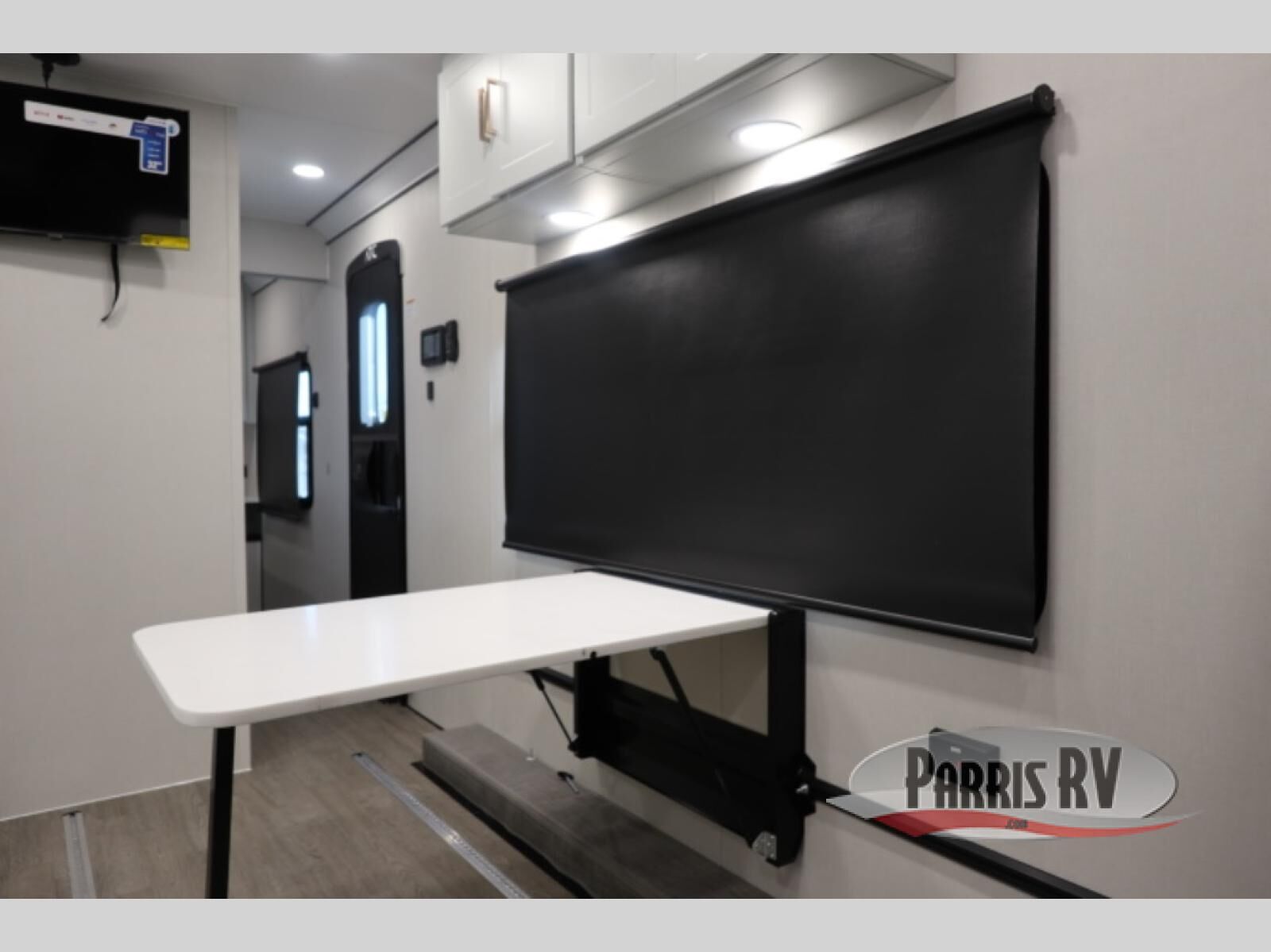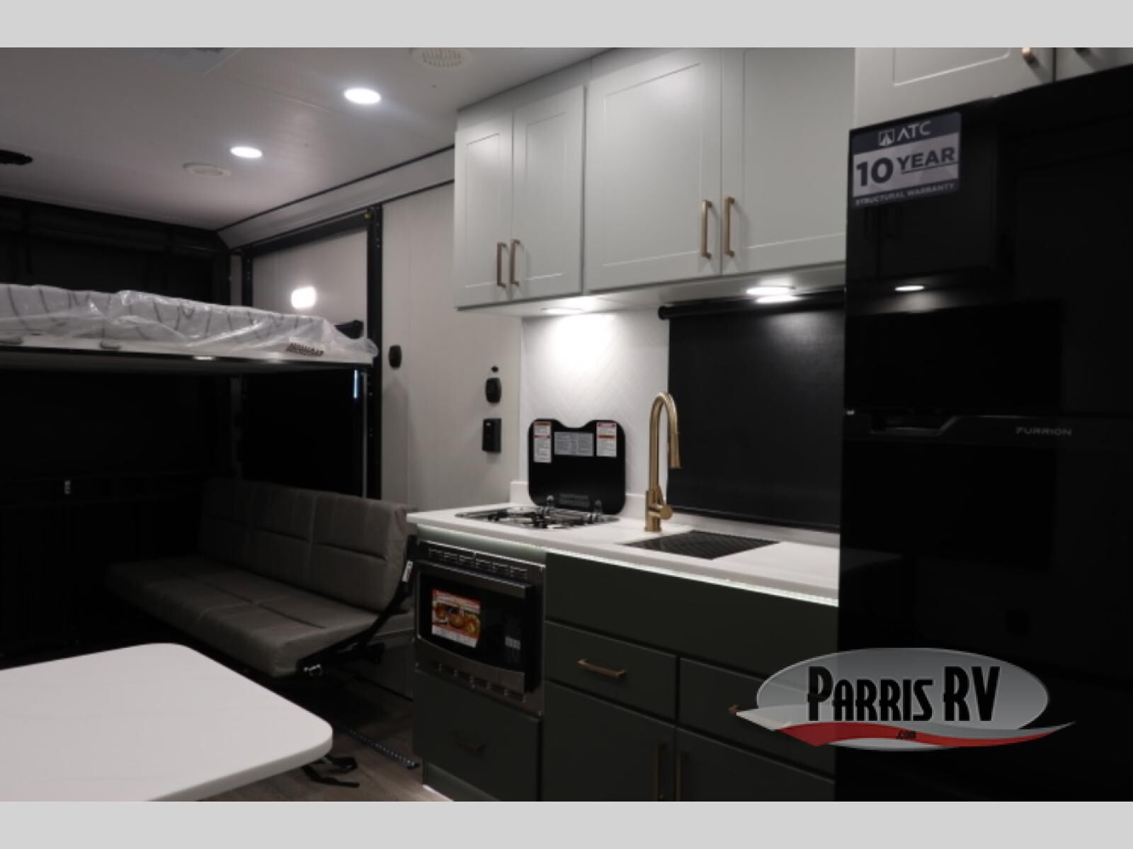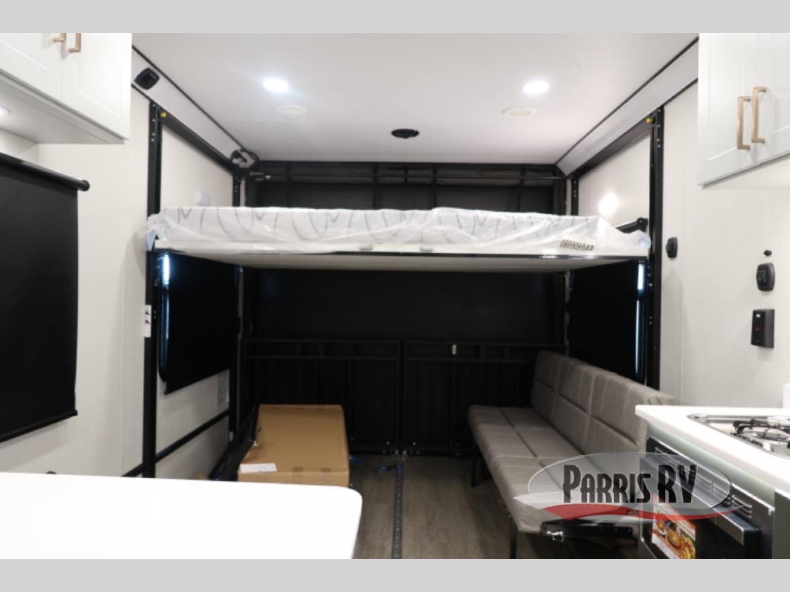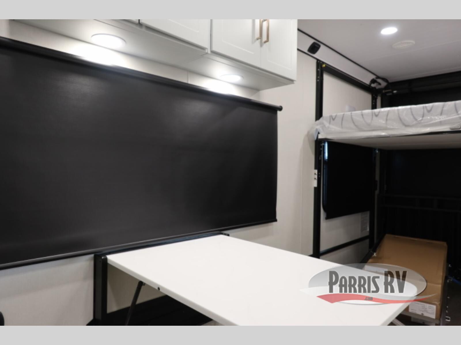 Time spent in this toy hauler will be time well spent! There is 15' 7" total garage space for your toys plus a cableless rear ramp door for easy unloading. You can whip up a meal on the LP two burner cooktop or in the convection microwave when you get back from trail riding, and the 10 cu. ft. 12V refrigerator will keep your food fresh. There is also a dinette table with four folding chairs where you can dine together. A full bath lets you clean up before bed, and you'll find a front private bedroom with a queen bed for all-around comfort!