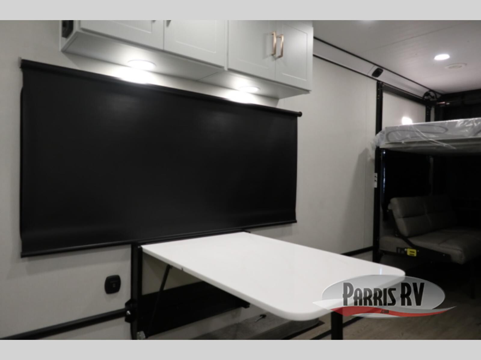 Time spent in this toy hauler will be time well spent! There is 17' 4" total garage space for your toys plus a cableless rear ramp door for easy unloading. You can whip up a meal on the LP two burner cooktop or in the convection microwave when you get back from trail riding, and the 10 cu. ft. 12V refrigerator will keep your food fresh. There is also a dinette table with four folding chairs where you can dine together. A full bath lets you clean up before bed, and you'll find a front private bedroom with a queen bed for all-around comfort!