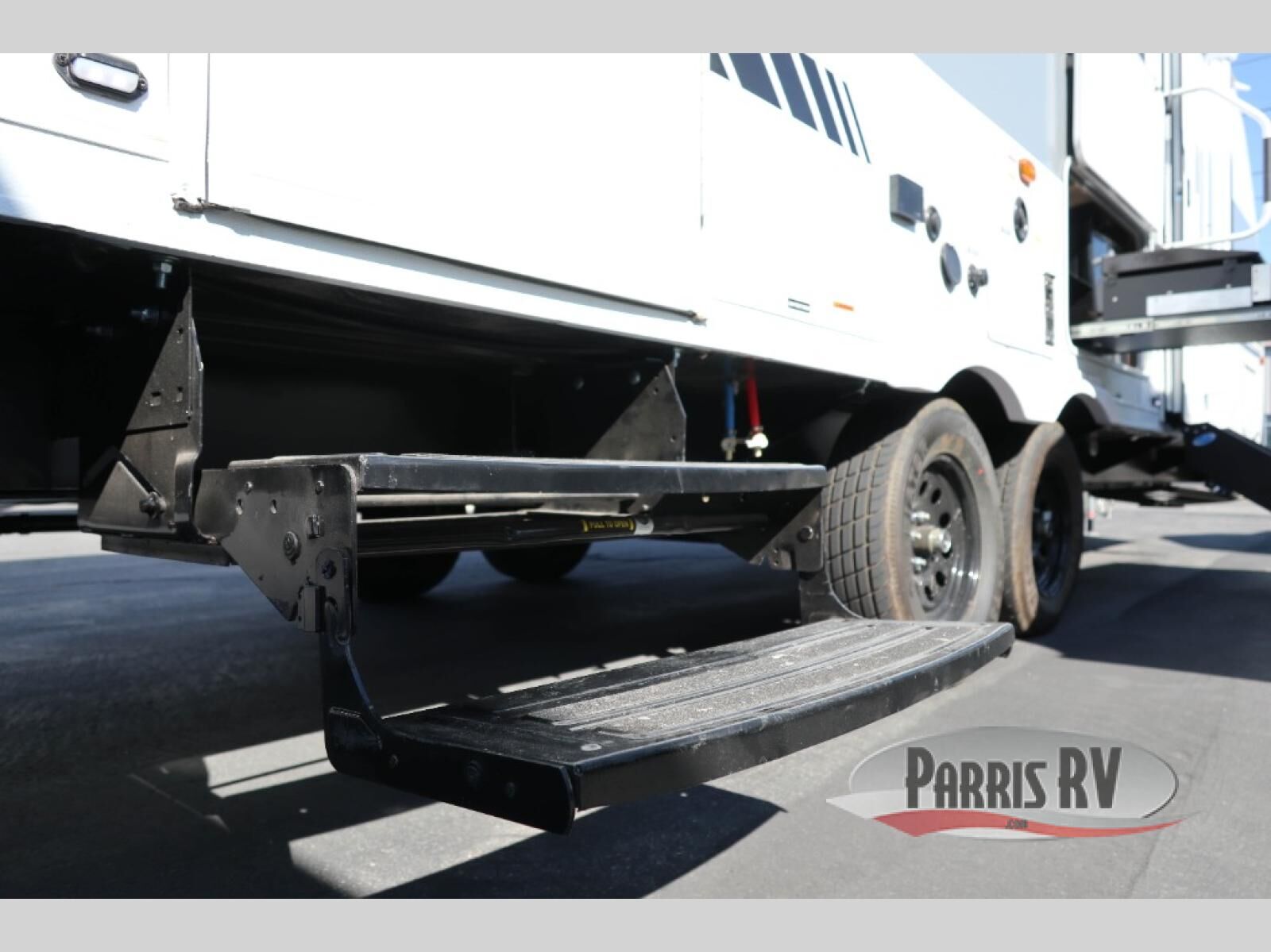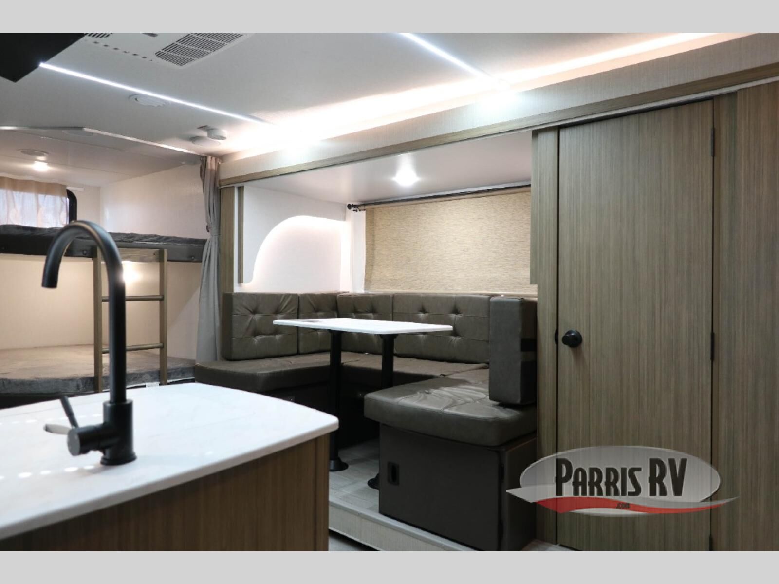 Your whole crew will love this spacious travel trailer that can sleep eight each night. There are double-size bunks for the little ones, a custom king bed in the front private bedroom, plus a Versa U-dinette within the large slide out for more guests to sleep. You'll also find the walk-in pantry in the slide out that can hold dry goods for the week, and the full bath includes its own exterior entry door for convenience. Cook indoors on the three burner cooktop or head outdoors to cook on the exterior camp kitchen!