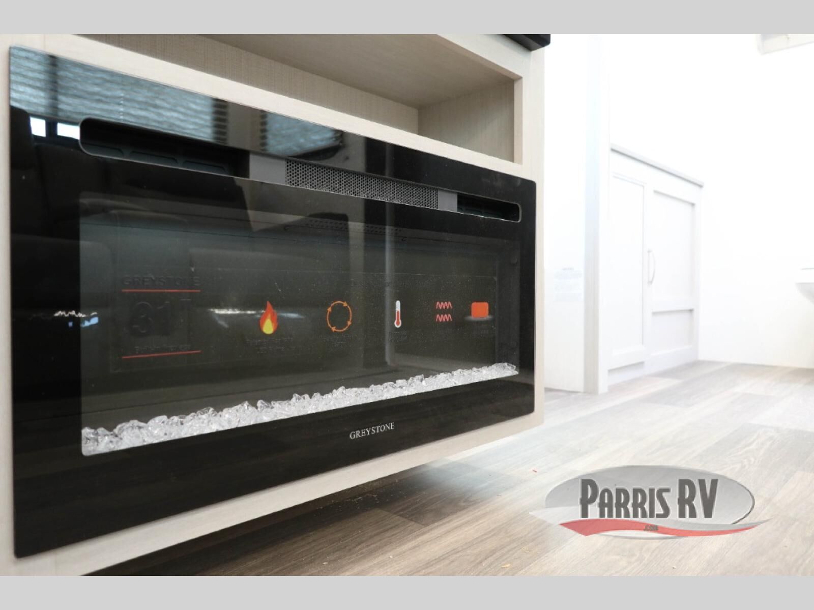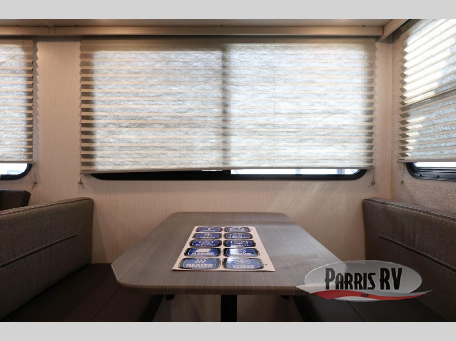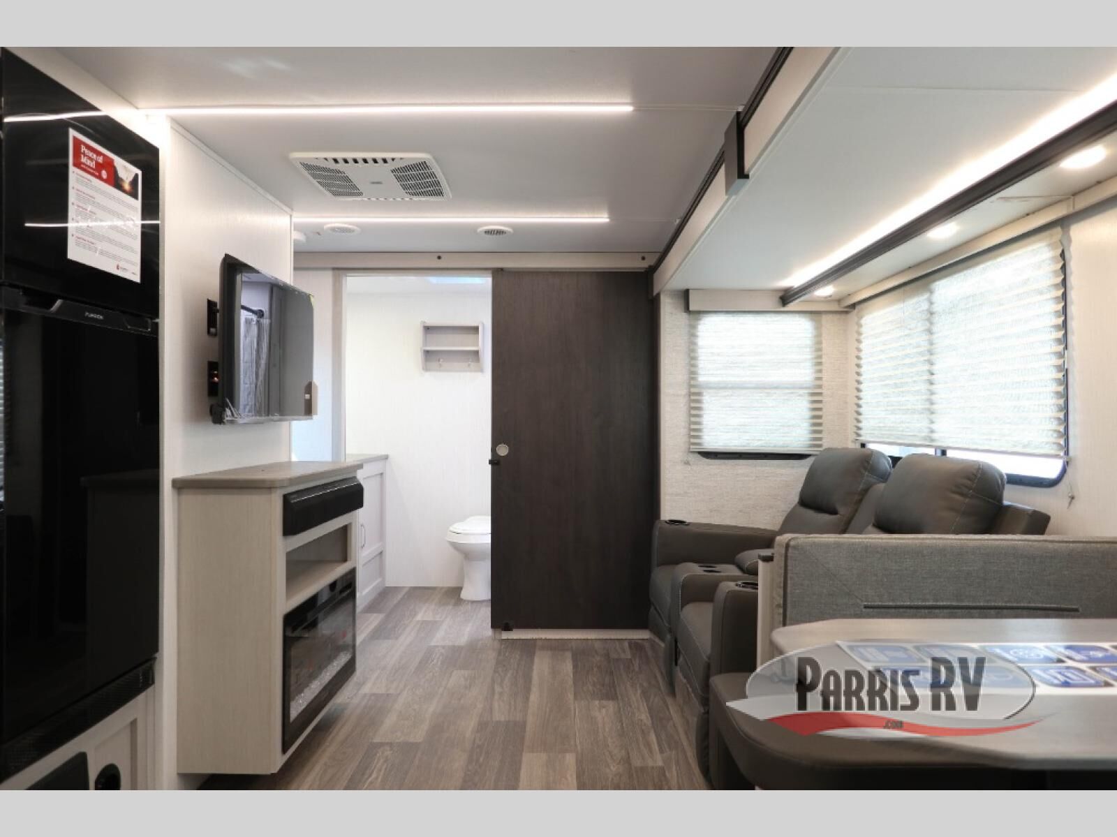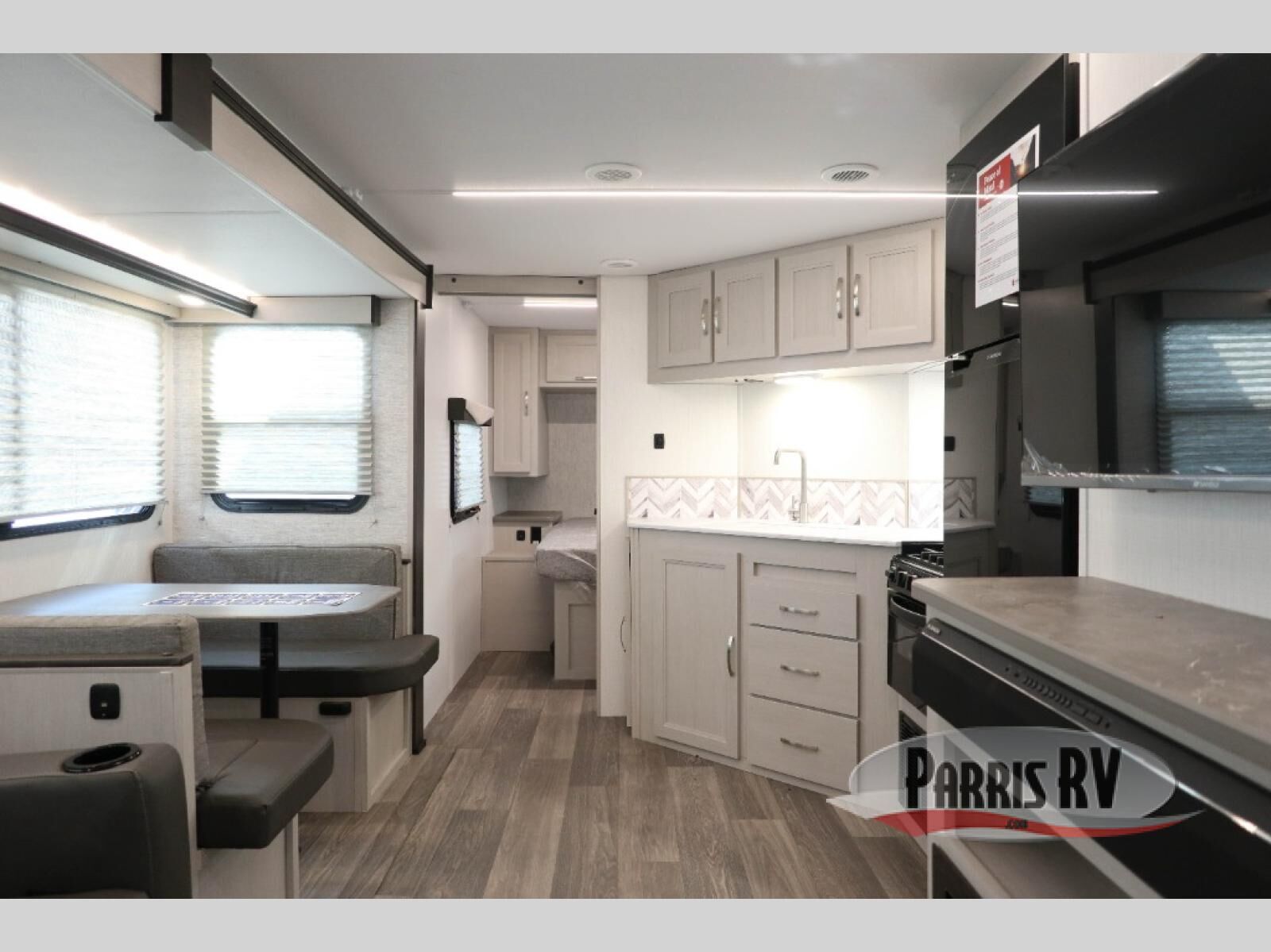 Camping just got a whole lot sweeter in this travel trailer! There is a large slide out for more interior space, and here you'll find the sofa and booth dinette across from the entertainment center with TV prep and a fireplace to make it feel more like home. The kitchen includes a three burner range and microwave oven to make meals each day, or you can head outdoors to cook on the outdoor kitchen with a griddle. When you're ready for some shut-eye, the queen bed up front will provide a great night's rest, and there are dual bedside wardrobes to keep your things organized.