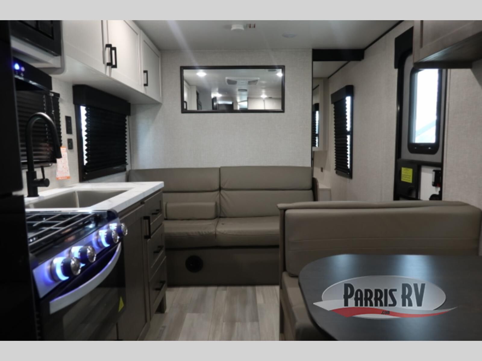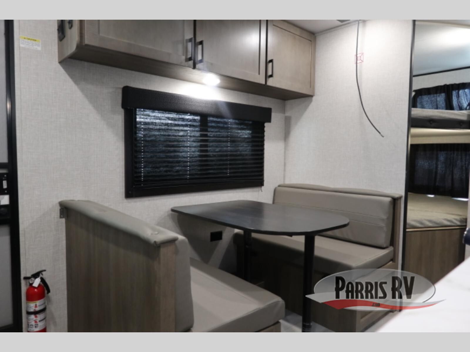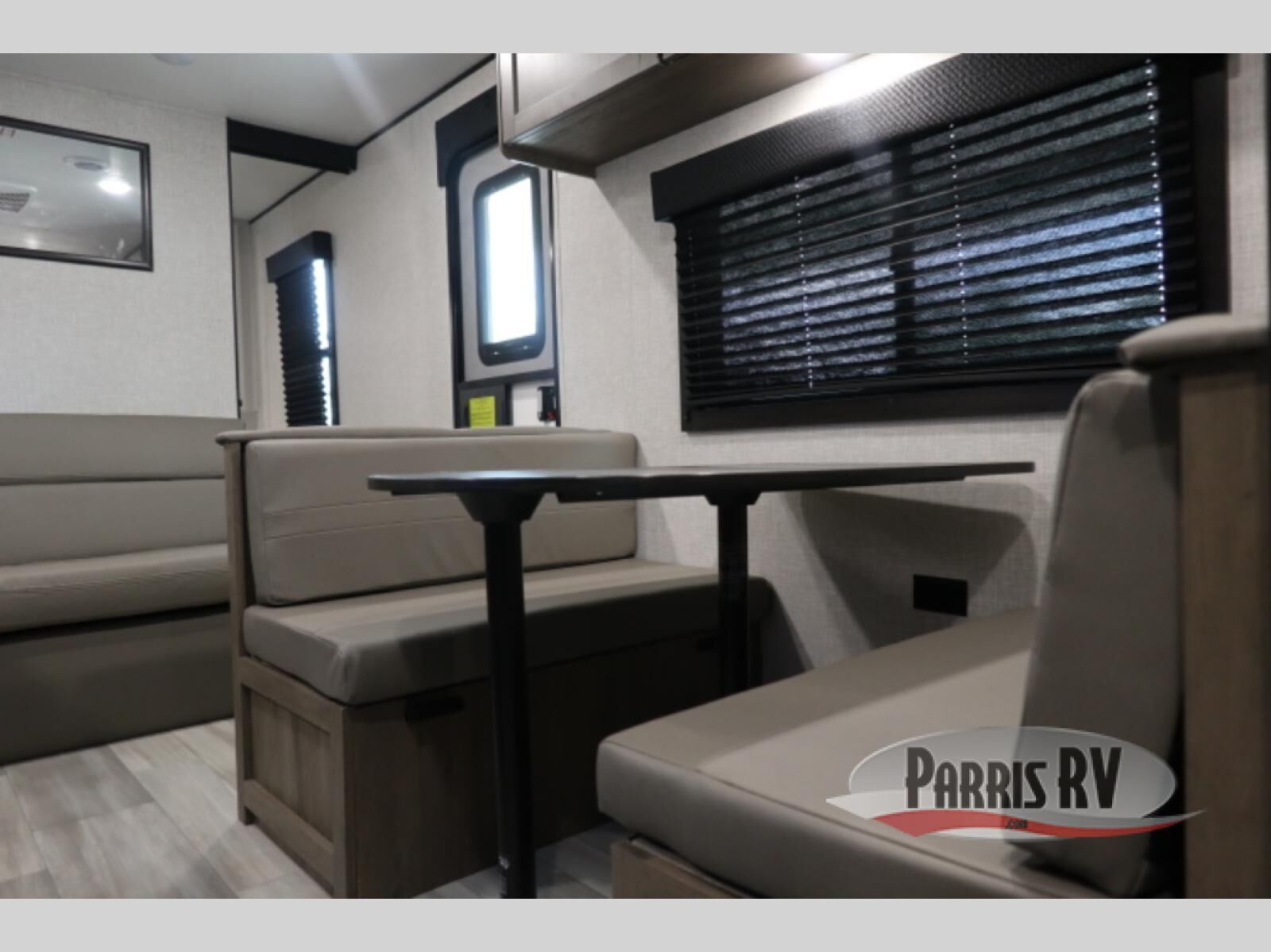 This dual-axle travel trailer can sleep eight people each night, so invite your family or friends along. You will enjoy the front private bedroom up front with dual wardrobes to keep your clothes tidy, and an easy lift bed with storage. While the chef of your group is preparing lunch on the three burner cooktop, everyone else can visit on the jack-knife sofa or play a game at the booth dinette. You will also find a large 18' power awning with LED lights outdoors which is where you may usually find everyone. The private tub/shower and toilet is right next to the double-size bunks for convenience, and the sink is just outside of this room so two people can freshen up at once.