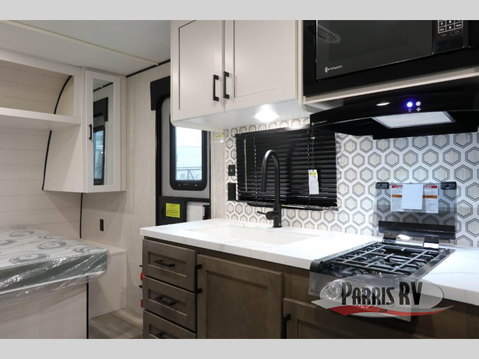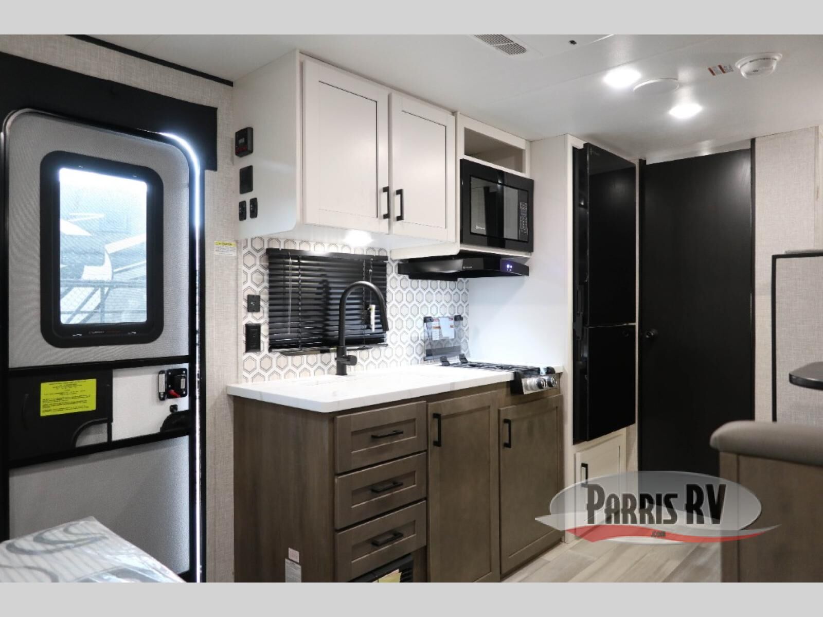 Camping with a group has never been easier than in this travel trailer with bunk beds! You will enjoy the bed up front and there is a wardrobe nearby to keep your clothes tidy. This model also includes a booth dinette slide that will be perfect for meal times, game night, and even sleeping space for one to two people. Whip up some eggs and bacon on the two burner cooktop or in the microwave oven before you head out for the day. The full bath with a tub/shower will be perfect if you're camping with little ones, and there is plenty of counterspace to set out your bathroom necessities.