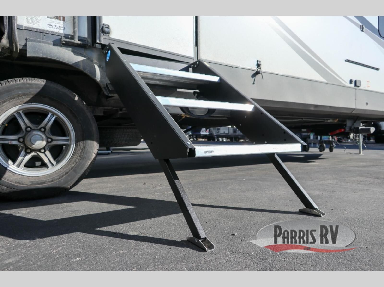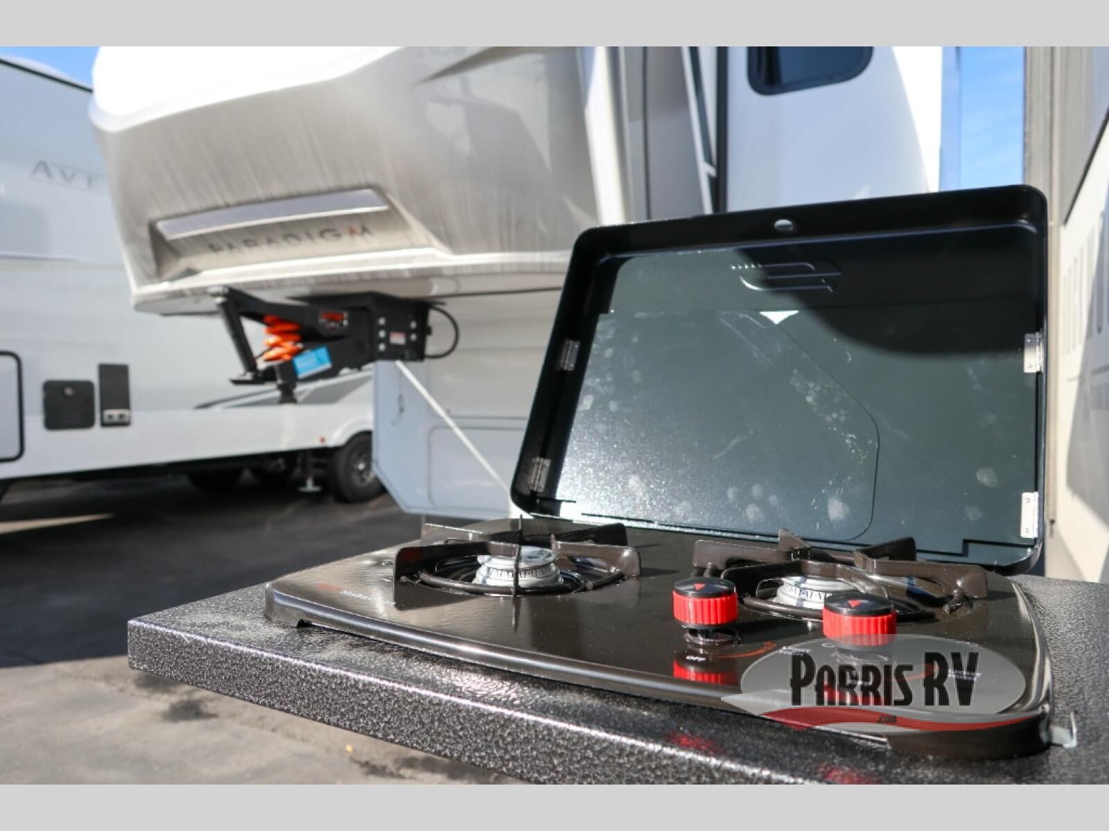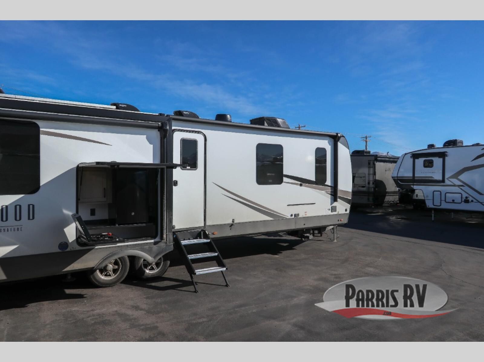 One step inside this rear kitchen travel trailer and you'll be sold! The dual opposing slides create an open floorplan you are sure to love, and you'll find plenty of seating spaces on the theater seat, the hide-a-bed sofa, and at the booth dinette. There is an entertainment center here with a Smart TV, plus a fireplace for those cooler nights. The full bath includes a shower with a seat, and the front private bedroom includes a queen bed slide out for more floor space. You can easily store your items in the large front wardrobe, plus there is a dresser and additional storage with washer and dryer prep. And check out the exterior with two power awnings, an outside kitchen, plus exterior storage for all your gear!
