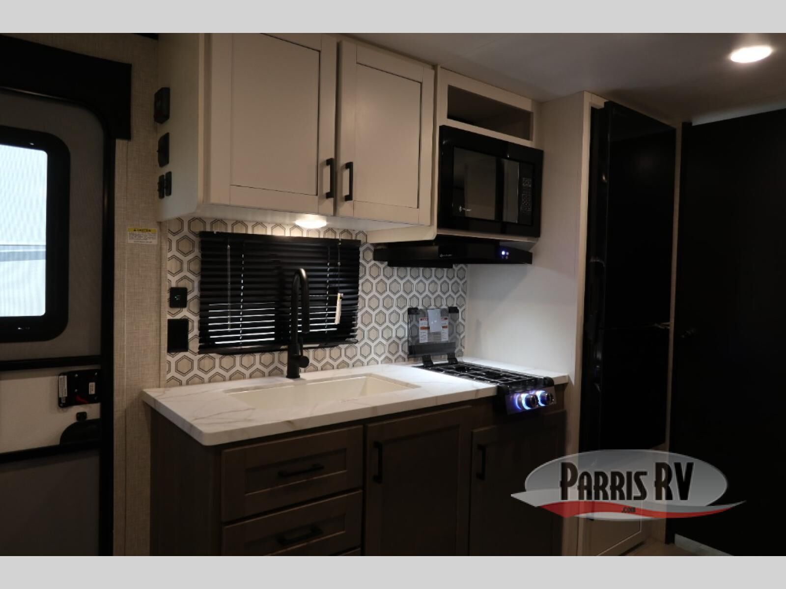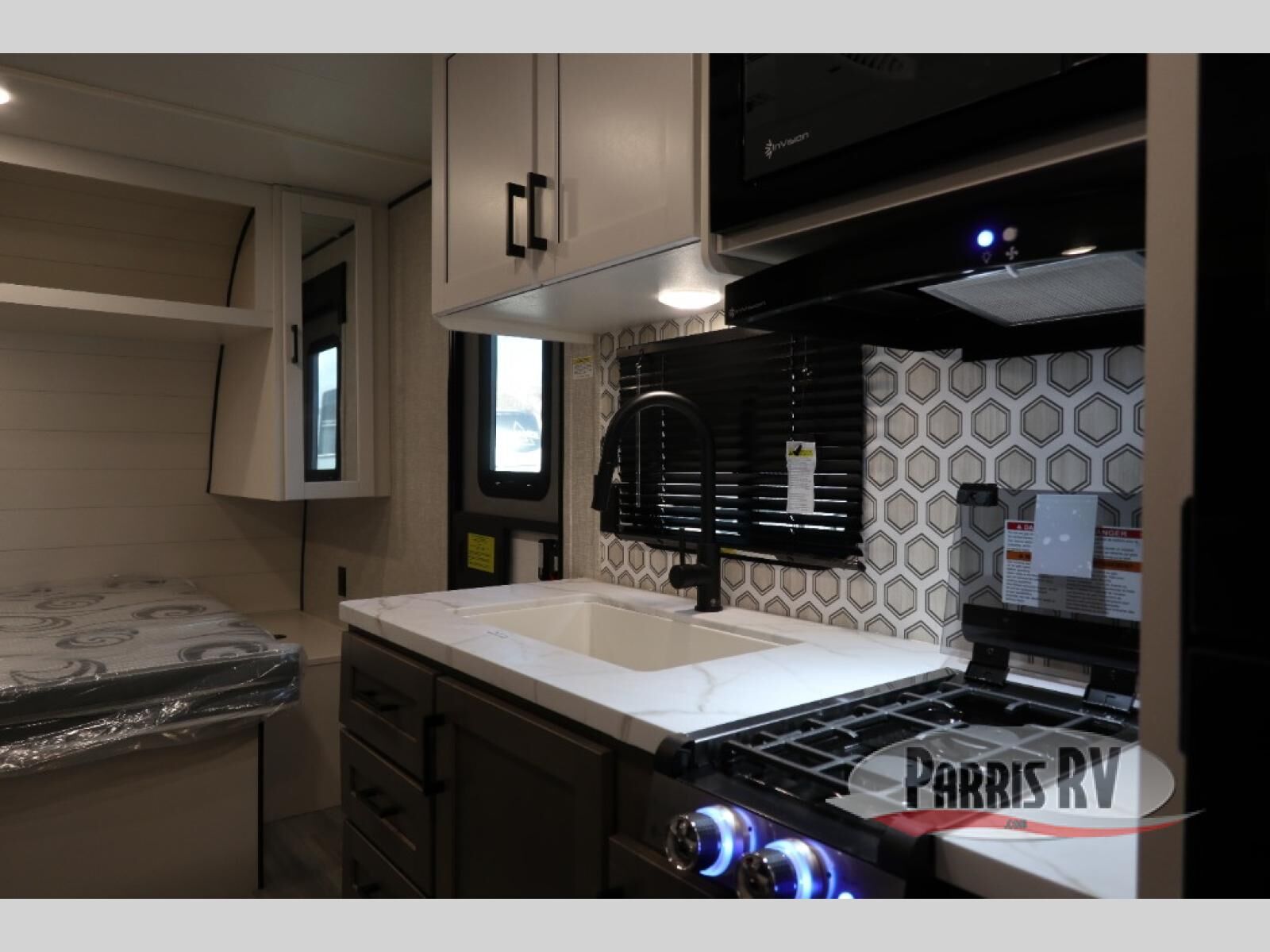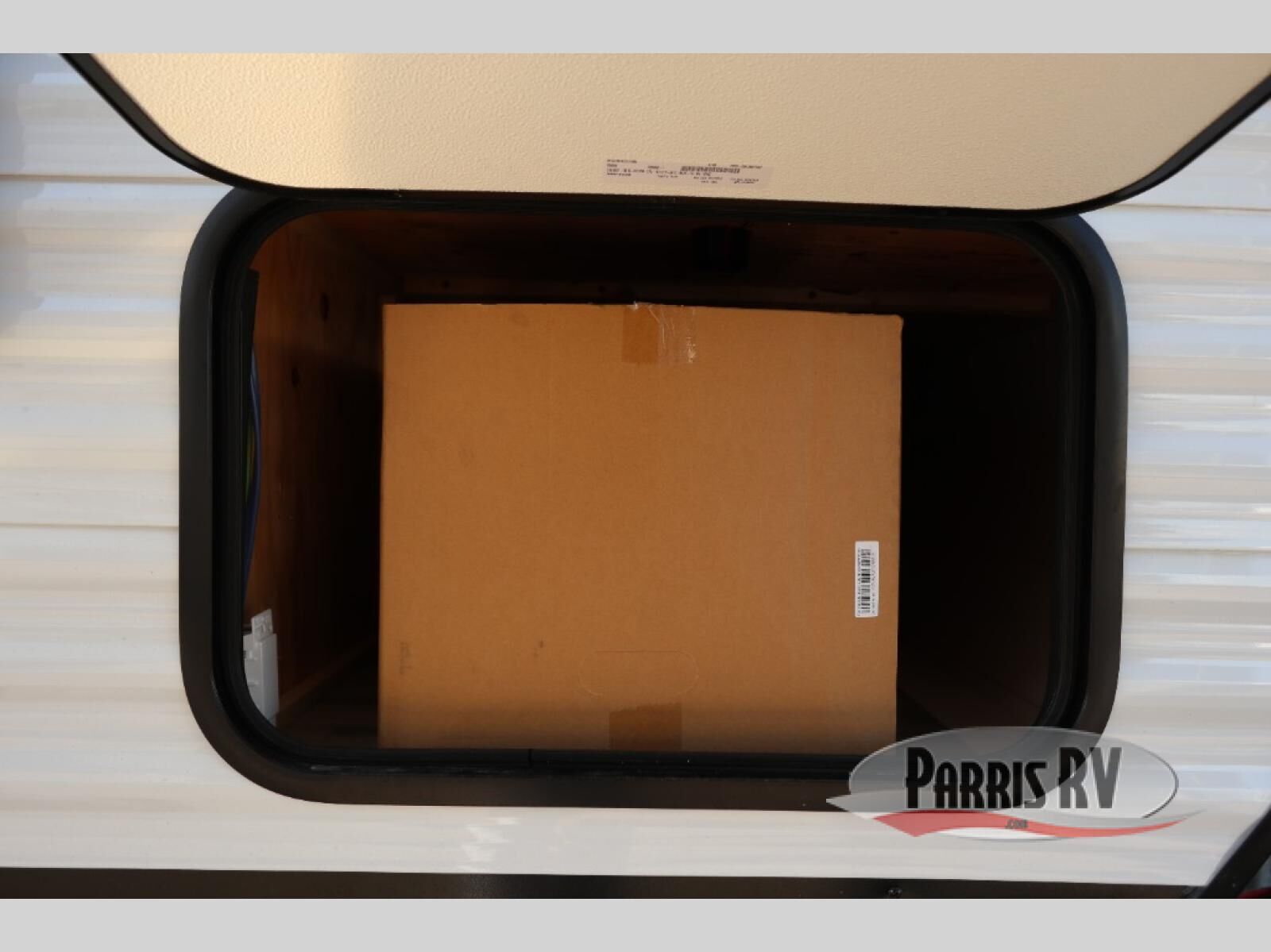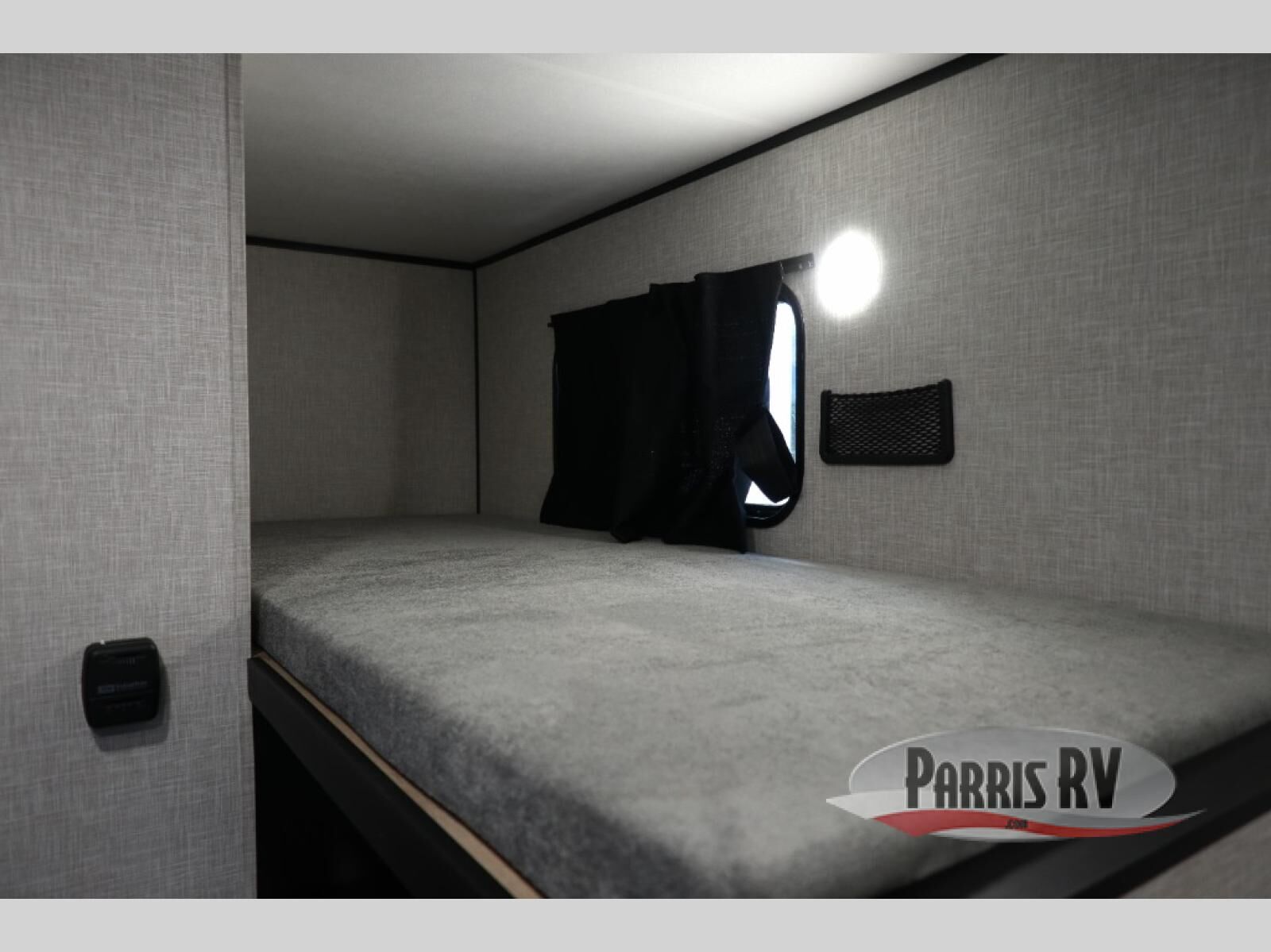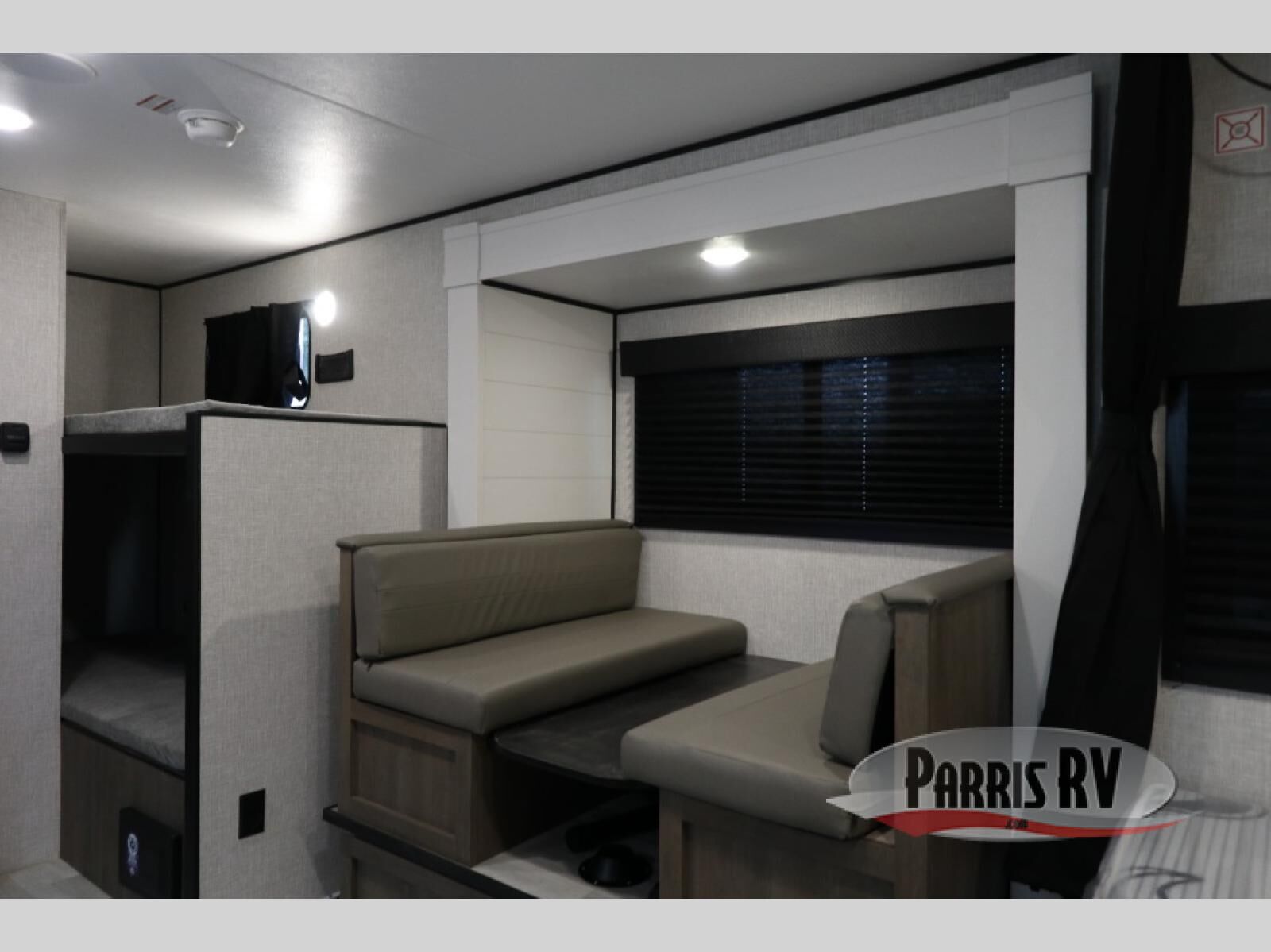 Camping with a group has never been easier than in this travel trailer with bunk beds! You will enjoy the bed up front and there is a wardrobe nearby to keep your clothes tidy. This model also includes a booth dinette slide that will be perfect for meal times, game night, and even sleeping space for one to two people. Whip up some eggs and bacon on the two burner cooktop or in the microwave oven before you head out for the day. The full bath with a tub/shower will be perfect if you're camping with little ones, and there is plenty of counterspace to set out your bathroom necessities.