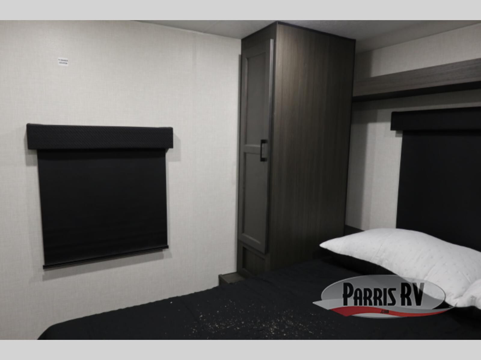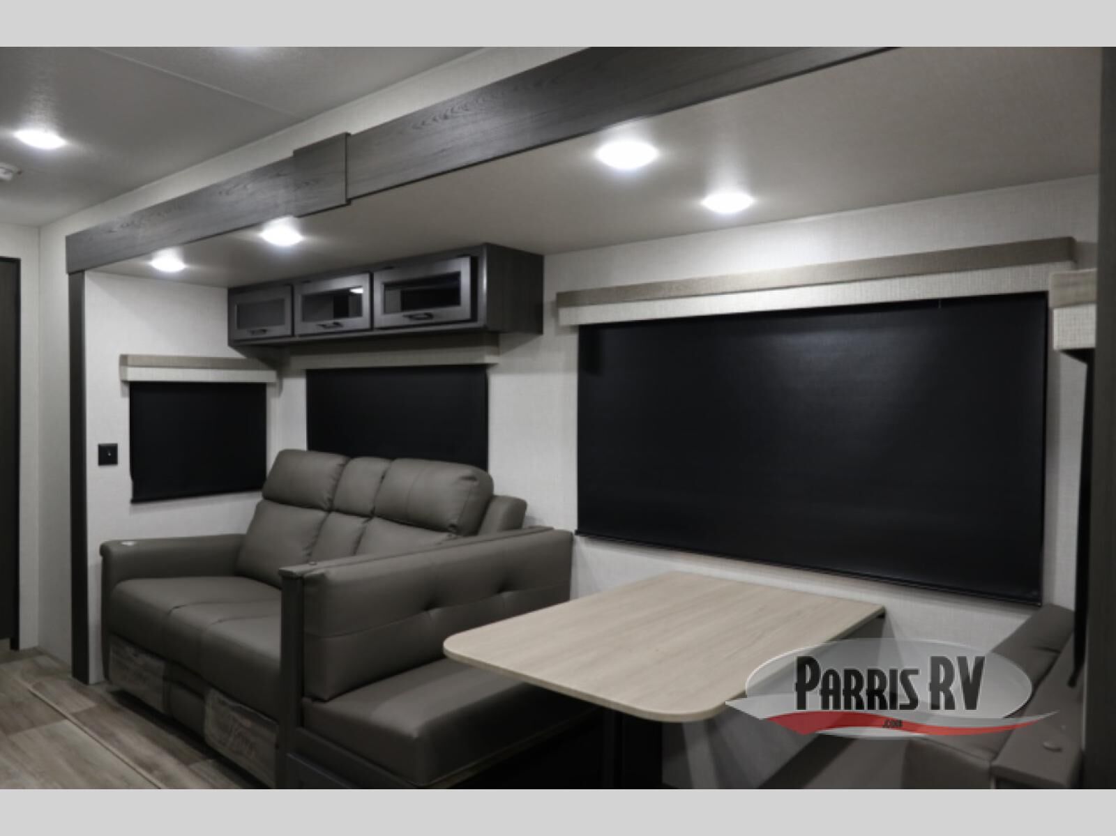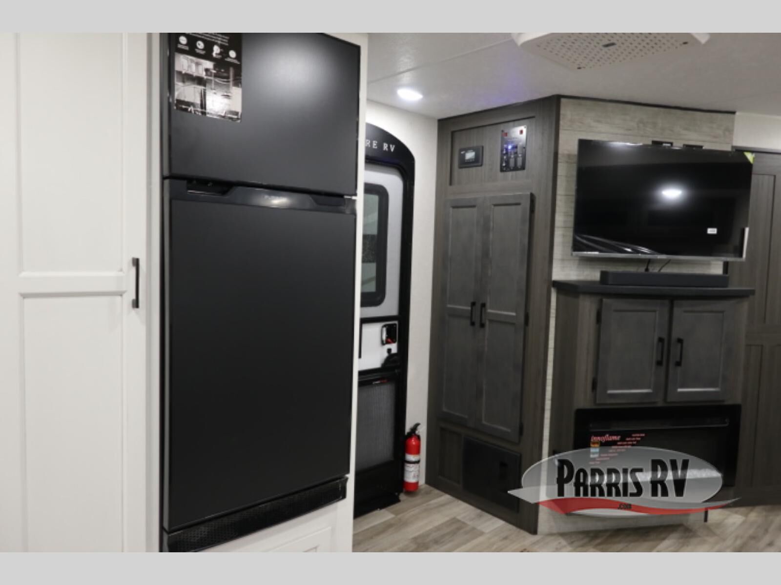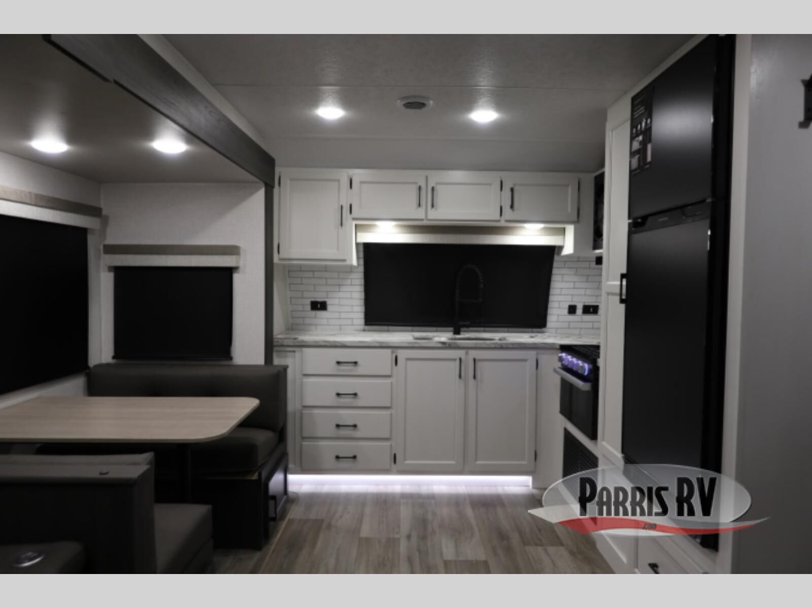 A front kitchen in this travel trailer provides more interior space! Once you have prepared your best meals with the Furrion oven and three burner cooktop, you can head to the Sit N' Slide table with flipside reversible cushions to dine. The 70" sofa also offers a comfortable place to take an afternoon nap or sit while enjoying the entertainment center with a frameless electric fireplace and 40" TV on a swing arm. A dual entry bathroom makes it easy for all to enter and has a 34" radius shower to freshen up in each morning. The rear private bedroom has a Sleep Tight queen bed for a good night's rest, wardrobes on either side of it, and an entrance into the bathroom too!