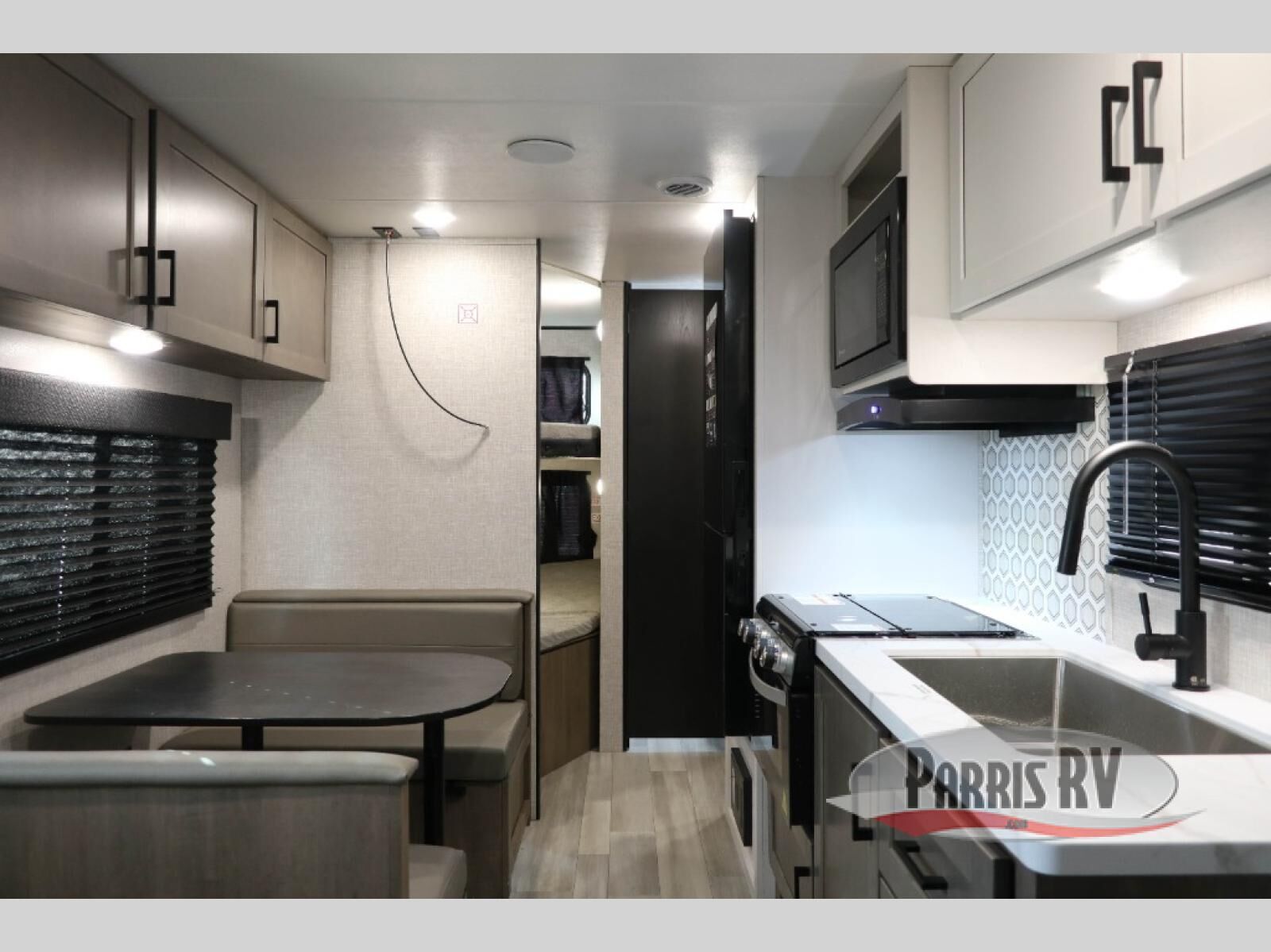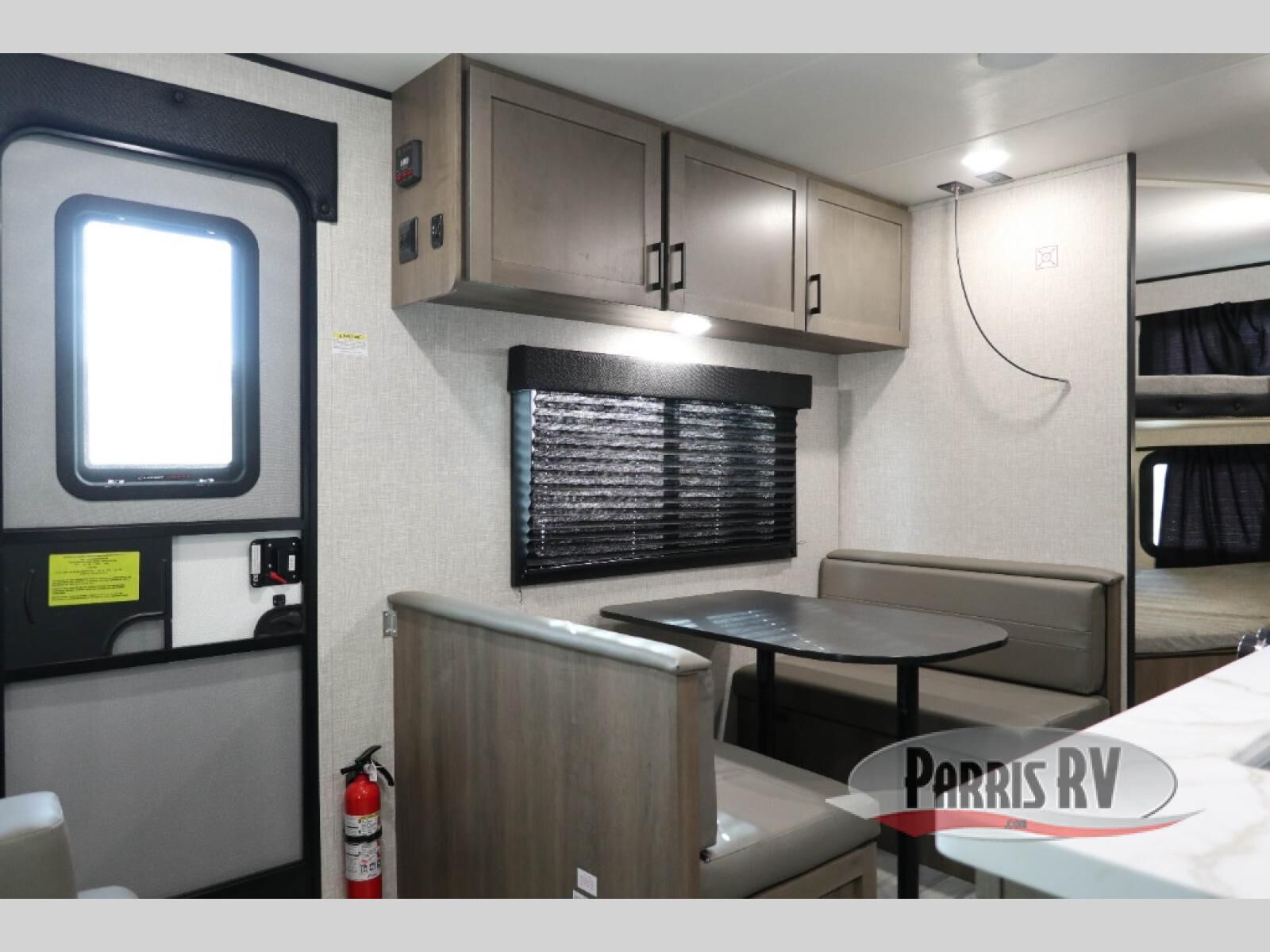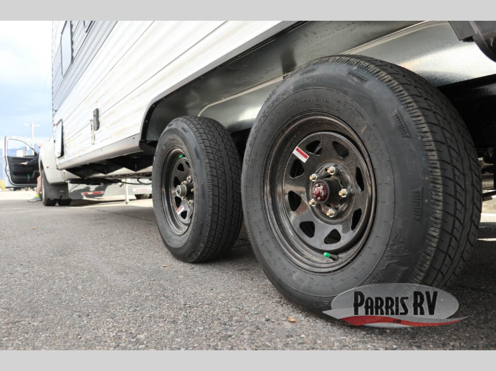 This dual-axle travel trailer can sleep eight people each night, so invite your family or friends along. You will enjoy the private bedroom up front with dual wardrobes to keep your clothes tidy. While the chef of your group is preparing lunch on the three burner cooktop, everyone else can visit on the jack-knife sofa or play a game at the booth dinette. You will also find a large 18' power awning with LED lights outdoors which is where you may usually find everyone. The private bath is right next to the double-size bunks for convenience, and the sink is just outside of this room so two people can freshen up at once.