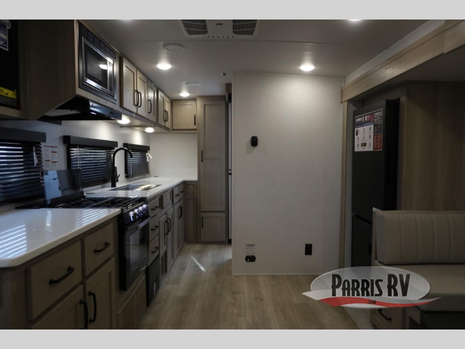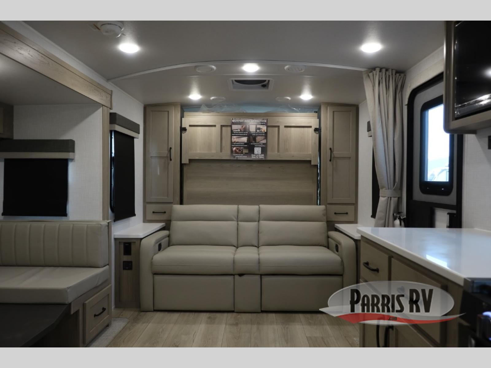 This is the perfect travel trailer for two or four people looking for comfortable and versatile camping trips! You will have your own Murphy bed to sleep on in the front at night, and during the daytime you can fold it up and have a 74" sofa in its place. No need to even make the bed! Breakfast can be made on the three burner cooktop inside, or head outdoors to cook on the outside griddle and pull-out stove under the 18' awning. The U-dinette offers ample room for everyone to gather for a meal or games, and can be transformed into sleeping space as well. This space could also feature an optional theater seat with a table or a hide-a-bed with table if you would prefer to replace the dinette. The kitchen features a refrigerator within the large slide as well as a microwave above the stove, plenty of counter space and overhead cabinets. On the exterior, you will find two storage compartments and a rear ladder for your convenience, plus more.