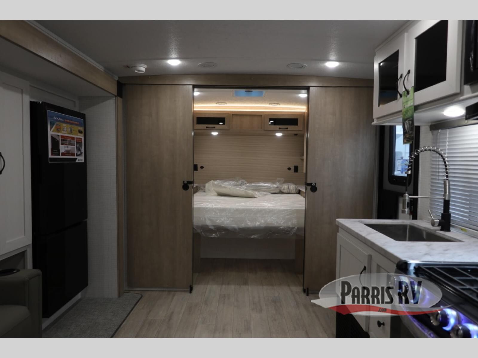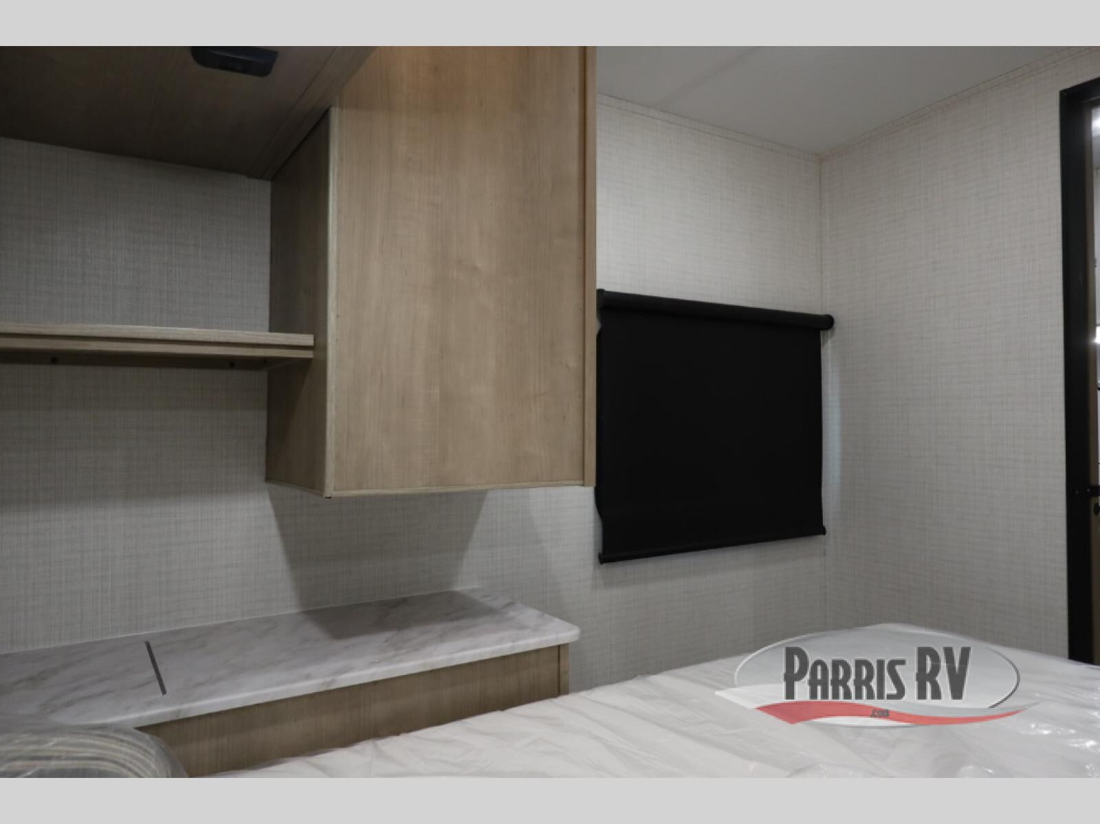 This couple's trailer is perfect for weekend trips to the campground. You can relax inside on the theater seats that are within a large slide out, and there is a hidden pantry behind the entertainment center to keep snacks stocked. The full rear bathroom gives you the space you need as well as a shower with a seat plus washer and dryer prep. And the front bedroom provides a queen bed, dual wardrobes and privacy.