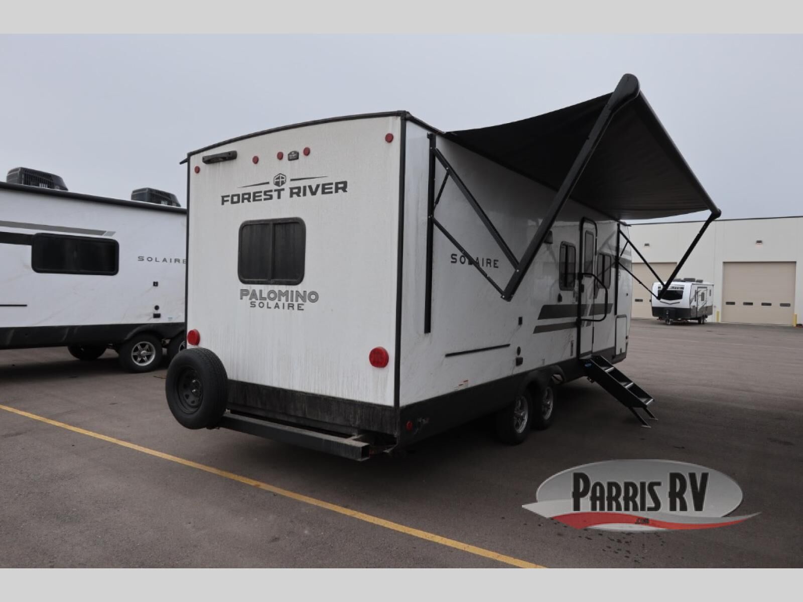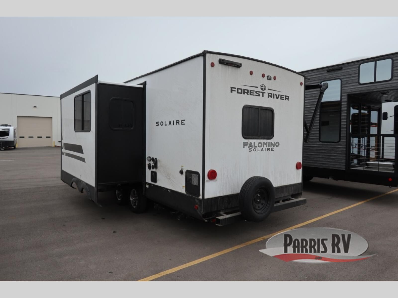 Each SolAire travel trailer by Palomino features a white gel coat exterior and an aluminum superstructure frame for lightweight towing. You will love having a power tongue jack for easy set up, plus slam latch baggage doors with magnets to make unloading easier than ever. There is also a power awning with LED lights and aluminum wheels included on the exterior. Each SolAire is constructed to last with Azdel composite, a fully laminated rear wall and roof, plus a fully enclosed and heated underbelly. The interior includes roller shades and kitchen backsplash, USB ports to keep your electronics charged, a Bluetooth stereo with speakers, and many more stand-out features!