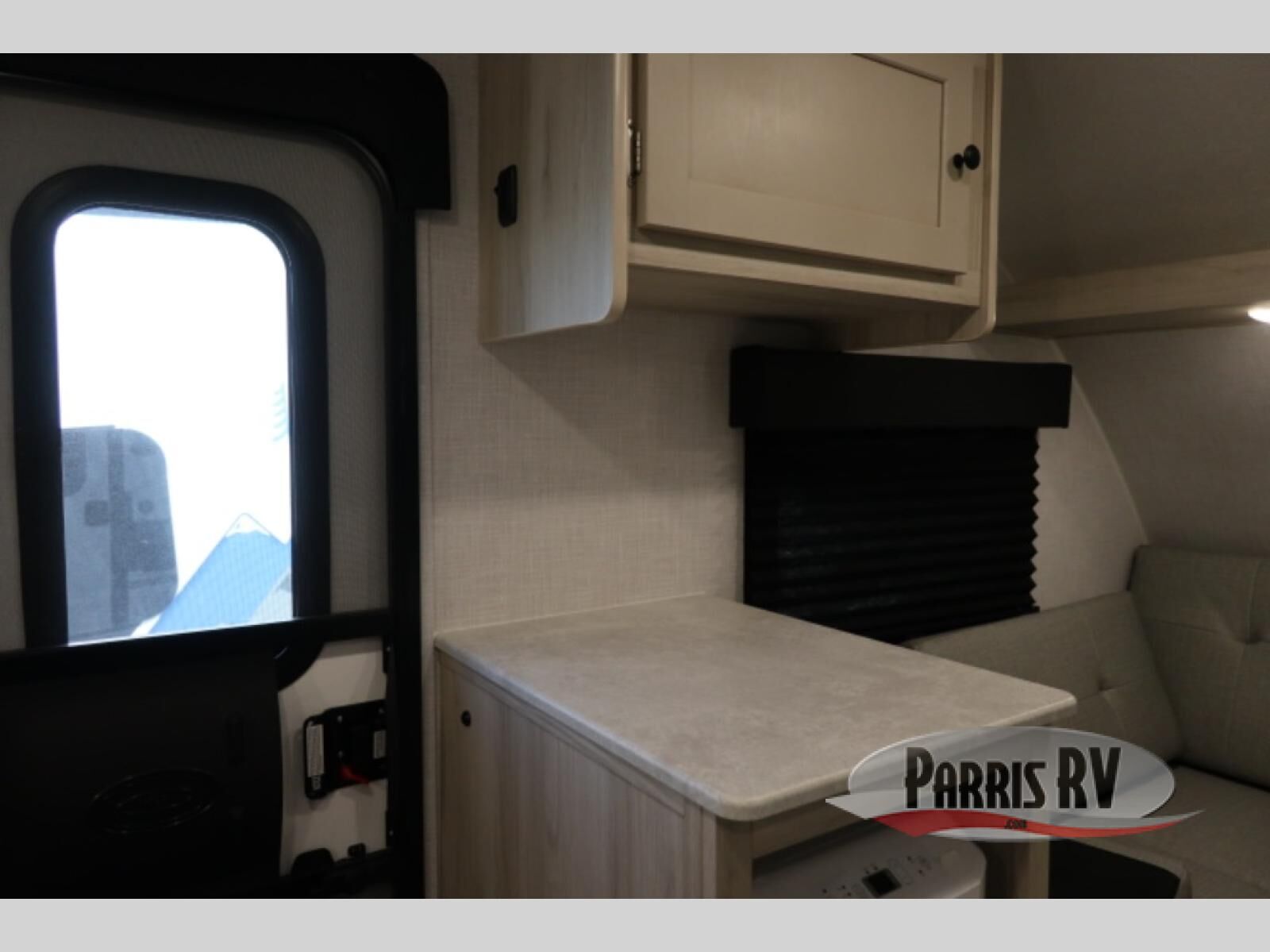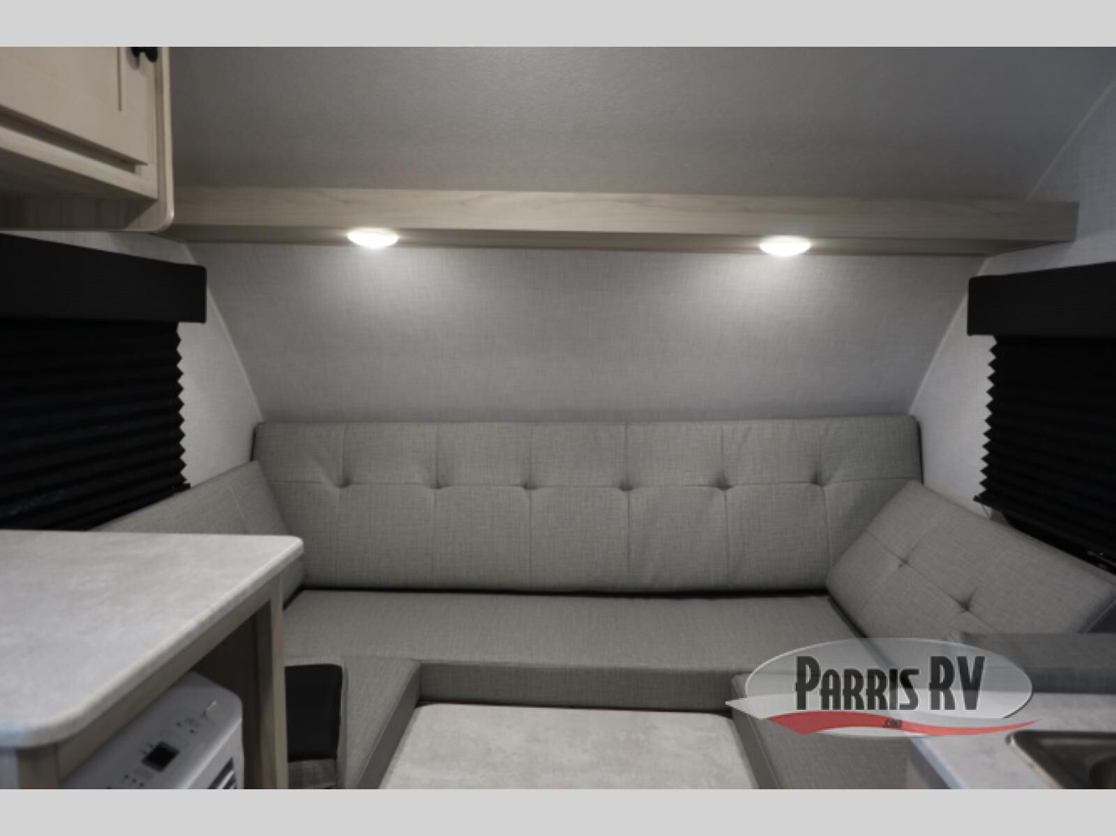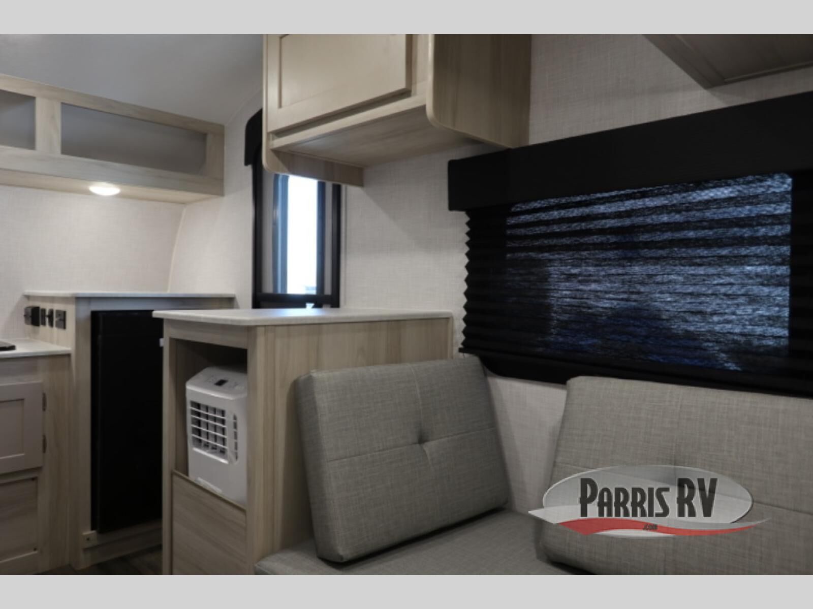 Comfort and convenience is found in this cozy trailer for two! Once you've found your campsite you can unpack your things and freshen up in the wet bath. Whip up a hearty lunch on the two burner cooktop, grab a cold drink from the 12V refrigerator, then dine around the U-shaped dinette that can also double as your sleeping space. You will find a large shelf and overhead cabinets for all your belongings, and the 110V floor mounted A/C will keep you cool during the hot summer months!