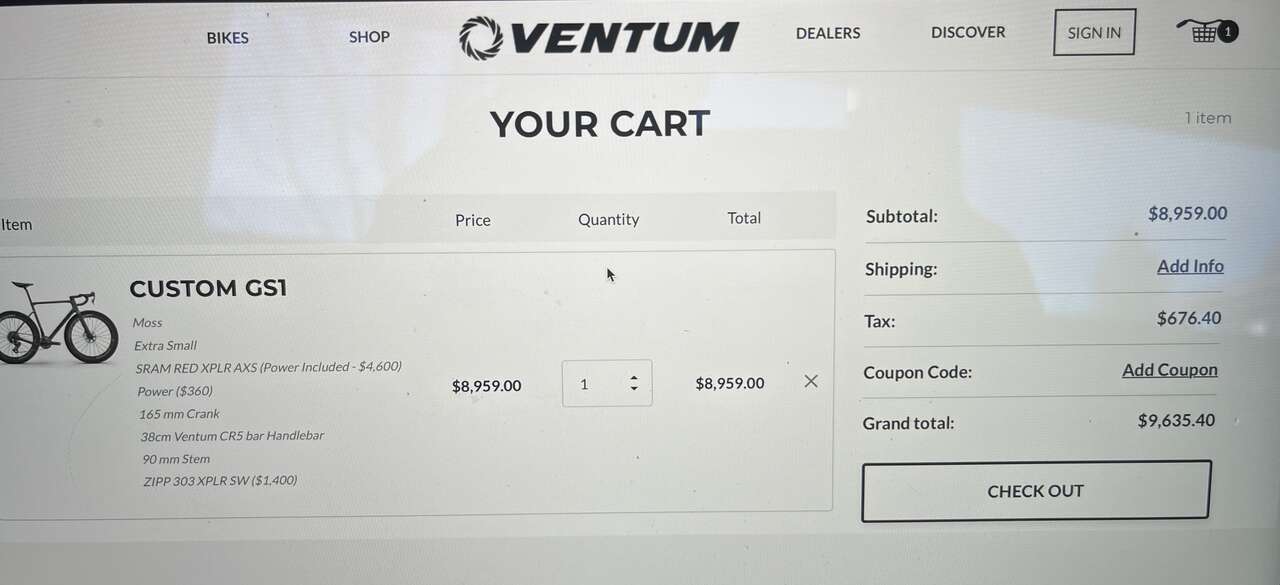 VenmoThis bike has less than 500 miles on it. Used less than one season before a new sponsor bike arrived. It is a 9.9/10 cosmetically. Frame is perfect. 10/10 mechanically. Unbelievable bike and build. My daughter is 5'5" and this is an XS. Fit was perfect. I can downgrade wheel set, or sell without wheels if desired. Retail was $9,600. Will sell for $5,600. For those that have asked about the groupset, I can sell it for $3,200 including power meter crankset. For those that have asked about the wheelset, I can sell those for $1800 once the groupset has sold. Bike price without wheelset is $4100. The GS1 is doing extremely well in Pro gravel... https://ventumracing.com/ventum-racing-2025-year-in-gravel?mc_cid=846bfe4a6a&mc_eid=9a528531ce