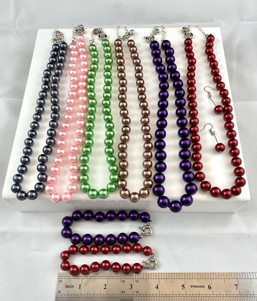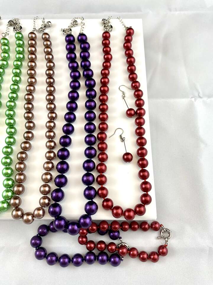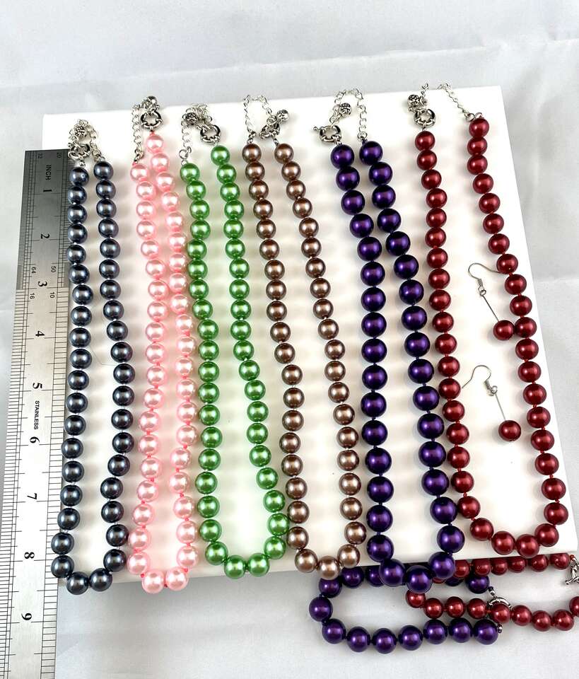 The single necklaces are $10 . The purple with matching bracelet is $14 The red with matching bracelet and earrings is $15