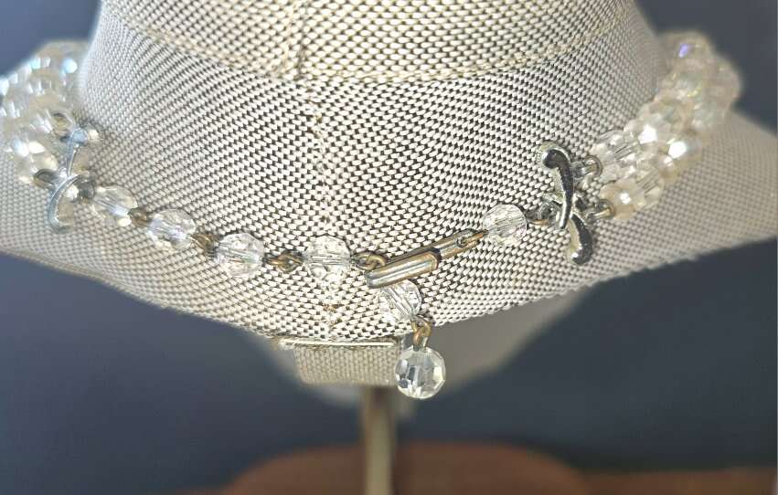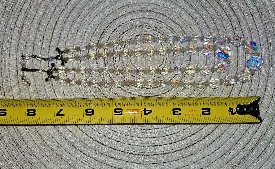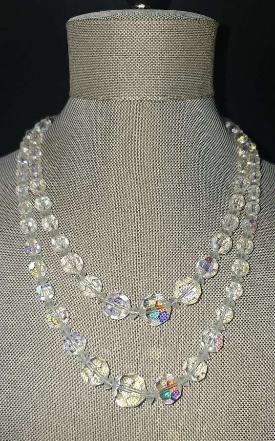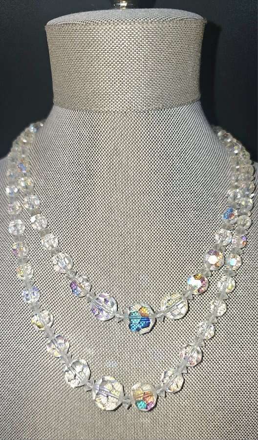 Beautiful vintage (1950's) graduated Aurora Boreallis (AB) iridescent faceted crystal 20" necklace. This piece is absolutely gorgeous, it's in excellent shape, intricately done & elegant, with an easy On/Off hook closure.