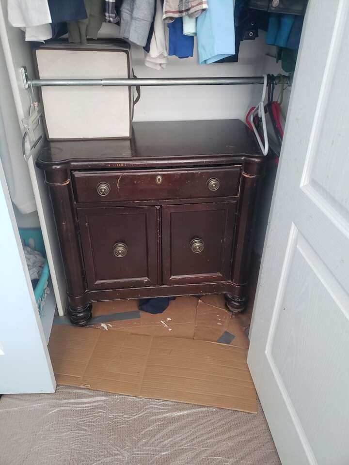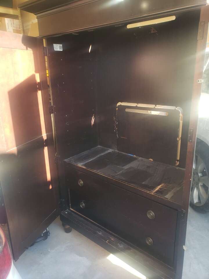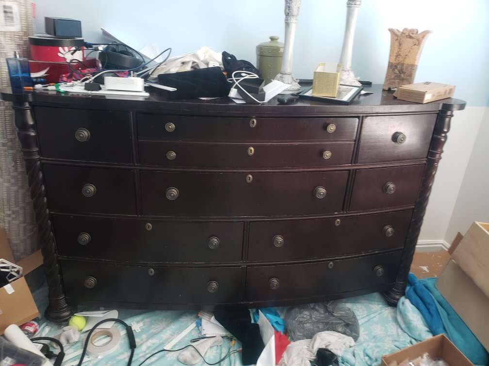 RC Willey king size bedroom set king size bed frame 10 drawer dresser 67 1/2 in wide 40 in tall 20 1/2 inches deep with mirror 38 in tall 45 in wide goes on top of the dresser armoire one Shelf, two drawers, 67 1/2 in wide 40 in tall 20 1/2 in deep nightstand with one drawer and cupboard space with shelf 30 1/2 tall 32 inches wide 18 1/2 deep $400