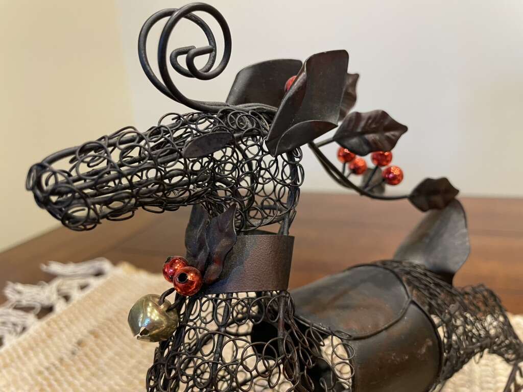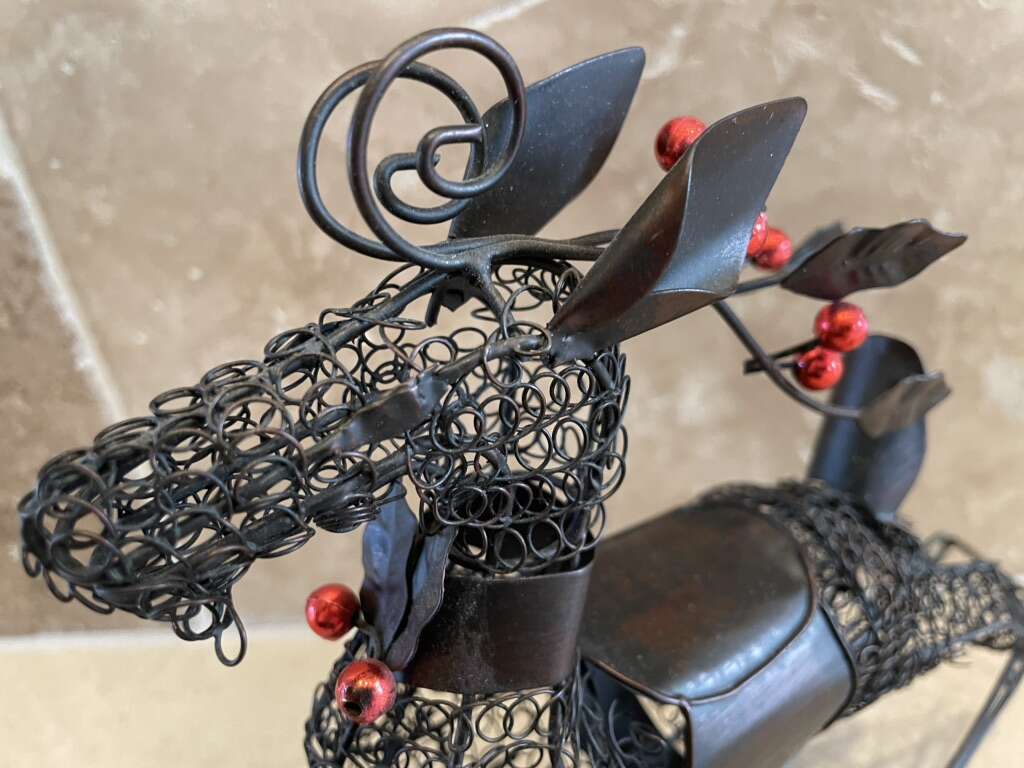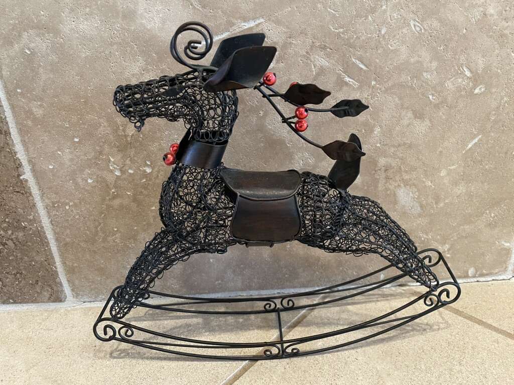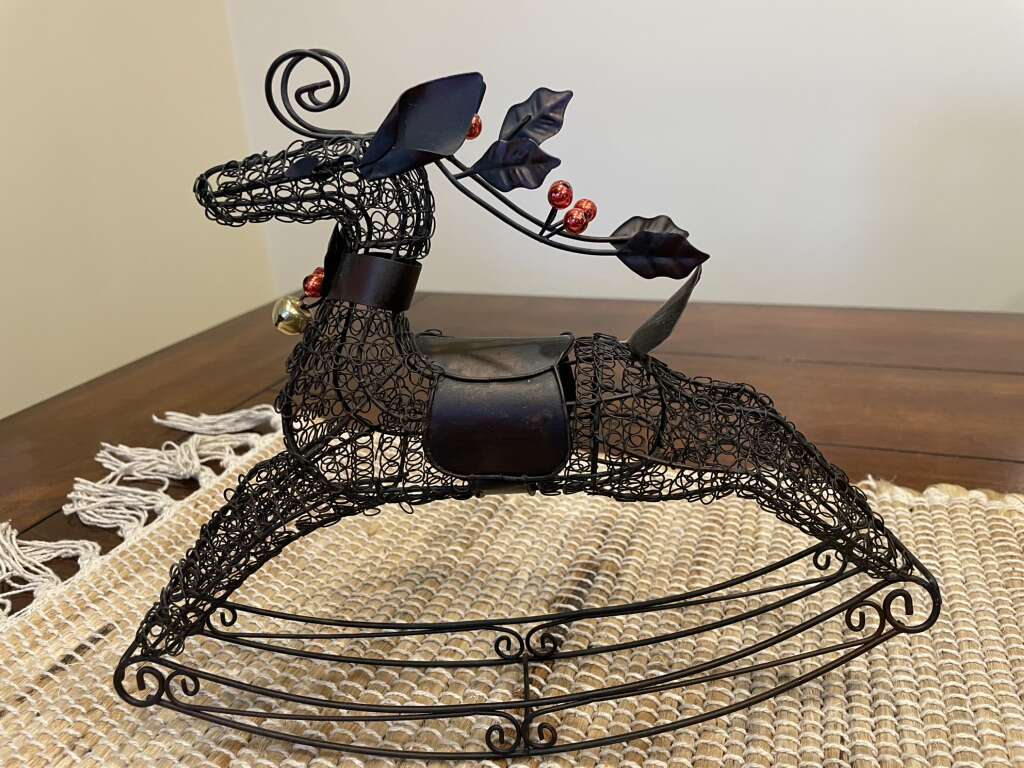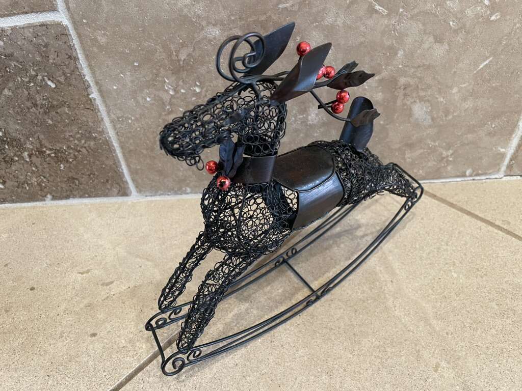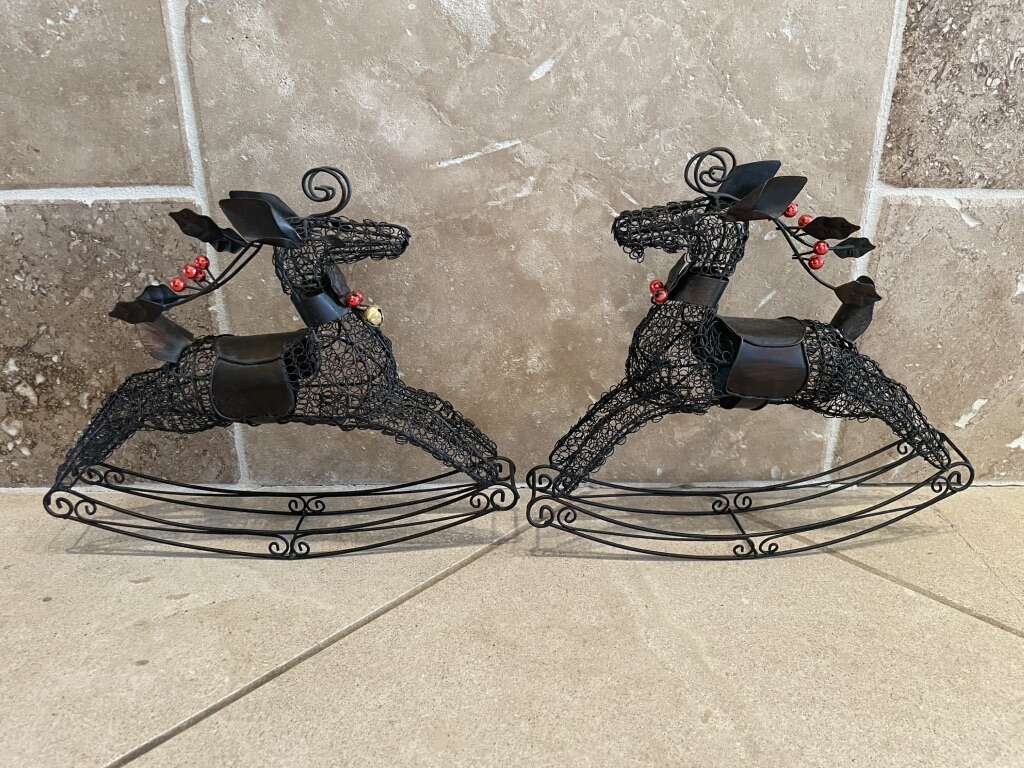 I have 2 wire mesh reindeer on rockers from Pier One. They are a really dark oil rubbed bronze color. They are about 9 inches tall and 11 inches long. The price is for both of them together. See my other ads for jewelry, artwork, home decor and more.