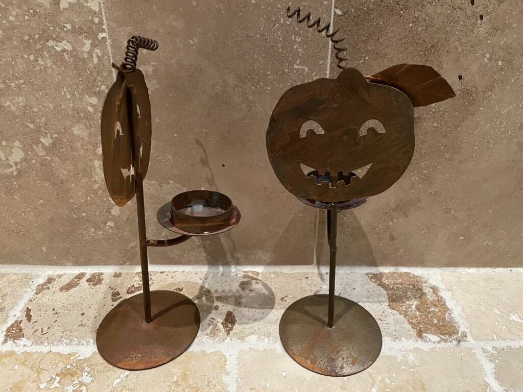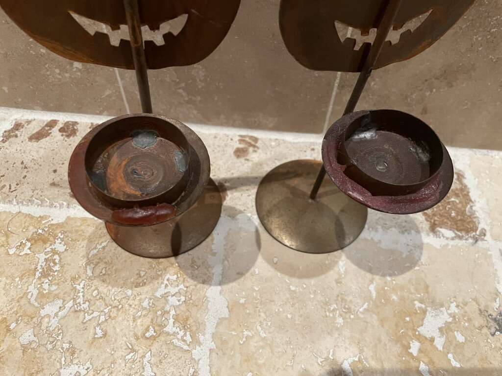 I have 2 metal tea light candle holders that are rust colored. They are jack-o-lanterns on round bases. One is missing the leaf by his stem. They are 9 1/2 inches tall. The price is for both of them together. See my other ads for jewelry, artwork, home decor and more.