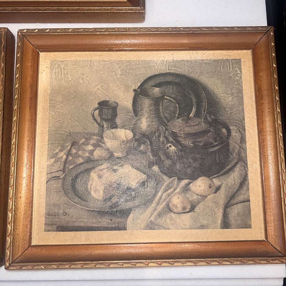 These mid-century prints feature rich, Old World Dutch styling with warm tones and classic kitchen subjects (fruit, pitchers, teapots, bread). Most are signed and dated by the artist (one is unsigned).