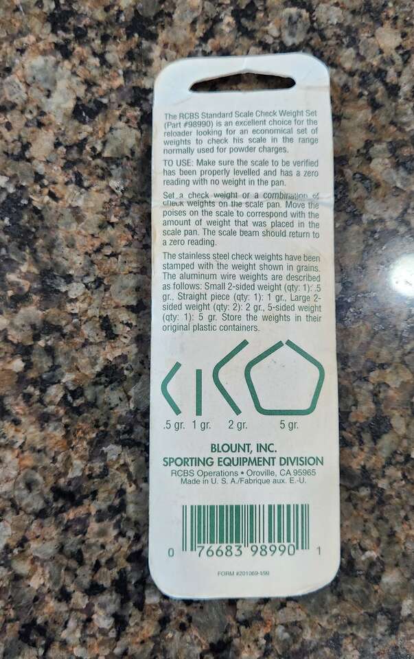 I have a new never opened RCBS precision scale check weight set for sale. Have you ever wondered if your reloading scale is accurate to more than "O"? This is how you verify that. These measure in grains just like your scale. There are 2-20gn, a 10gn, a 5gn, 2-2gn, a 1gn, and a .5gn weight in this set. Very critical to know if your scale is calibrated and giving you accurate readings. I can meet in Bountiful some days if it helps.