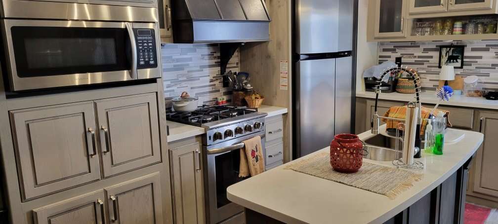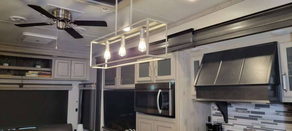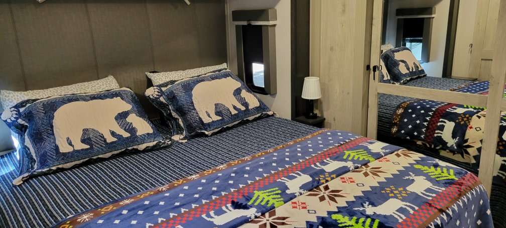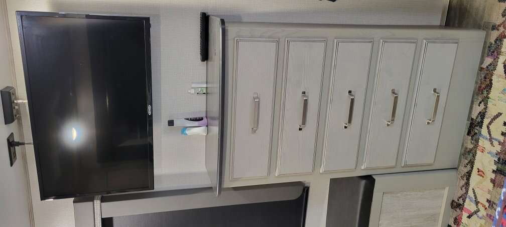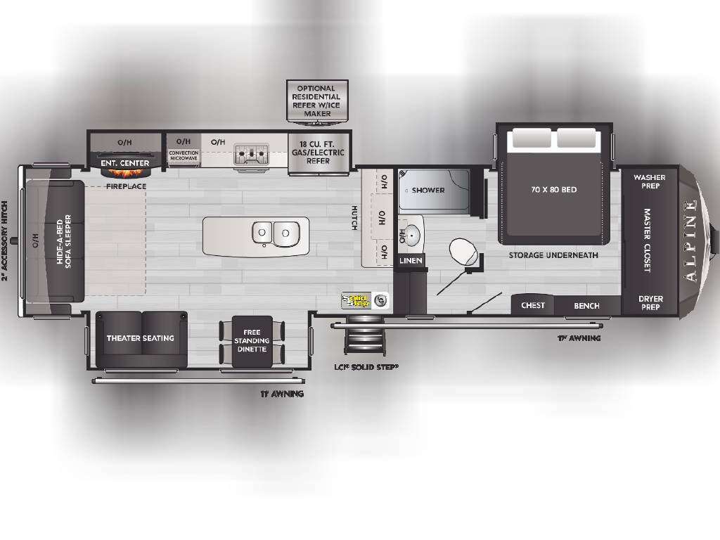 bought new in 2023, 2000 watt inverter, 2 400 watt solar panels, double door stainless steel fridge, microwave, fireplace, 2 reclining, vibrating heated chairs, island bar, large storage area under front area, 2 powered awnings, 3 air conditioning units, ladder and luggage rack, tankless water heater, to many options to list. weighs 13,500lbs and 2800 lbs tongue weight. rear couch makes into a queen bed. 4 seasons package with heated tanks and under belly.