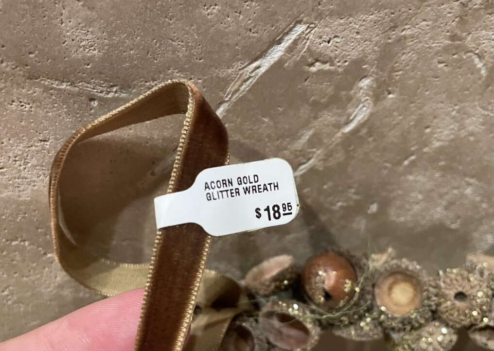 I have a small wreath with acorns and gold glitter. It is 7 1/2 inches across and has a brown velvet ribbon hanger. The price tag shows it was originally $18.95. See my other ads for jewelry, artwork, home decor and more.