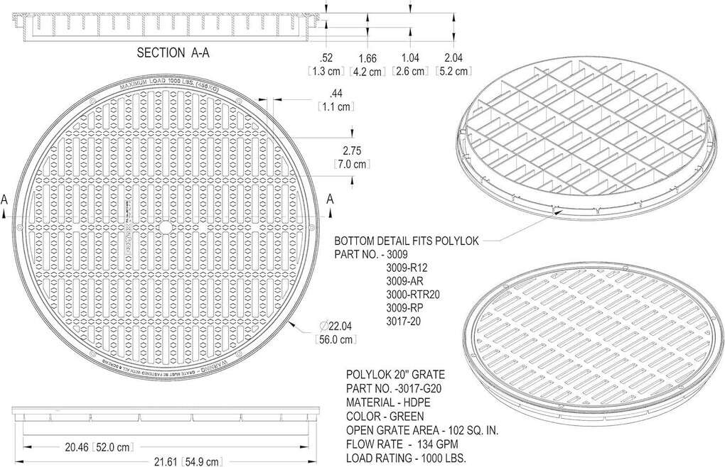 20 round grate for Polylok 20 catch basins & risers Skid resistant surface Highest UV protection